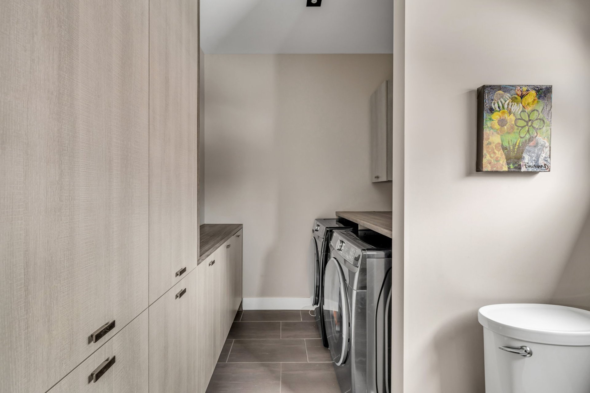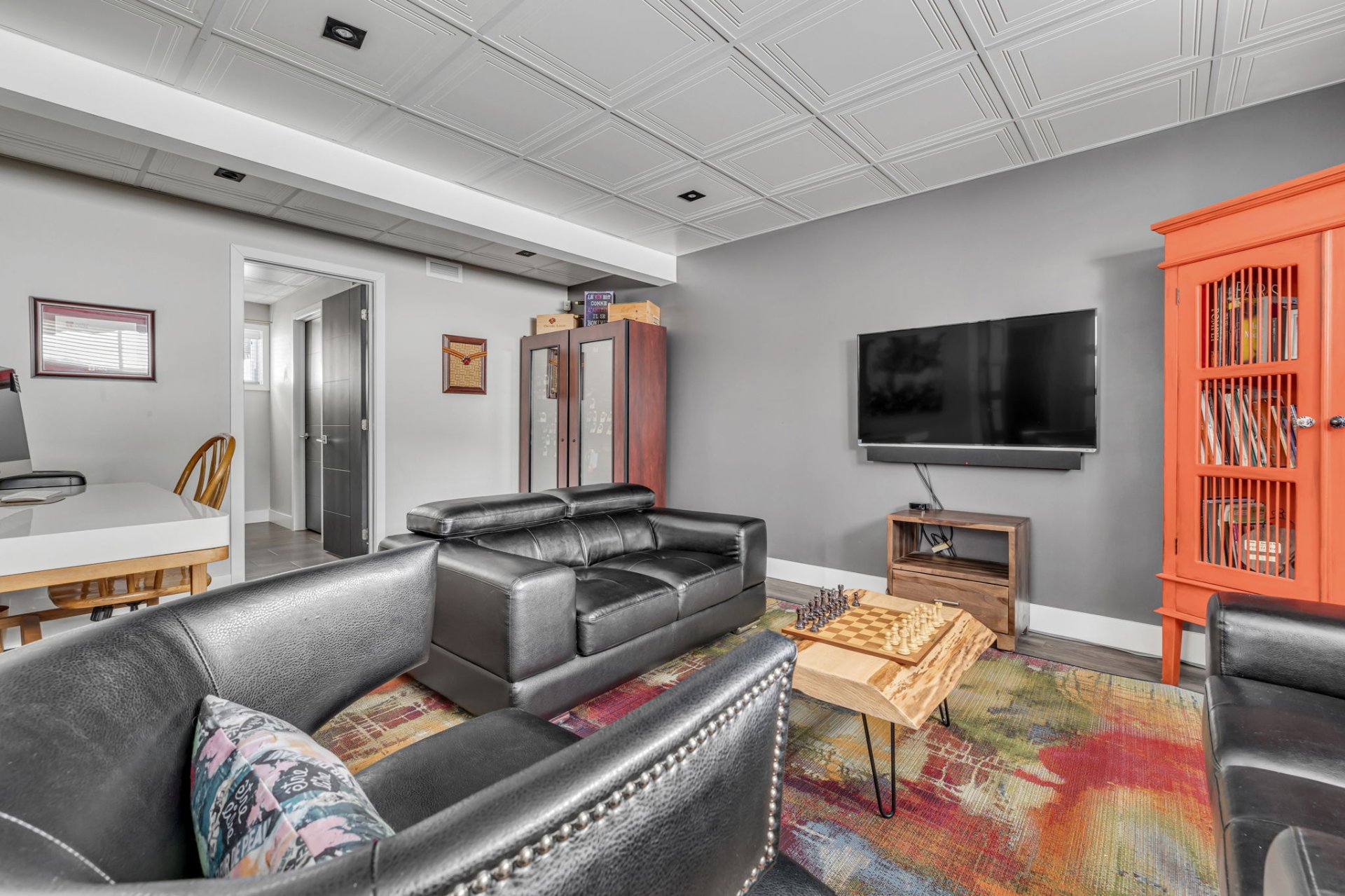 Le sous-sol entièrement aménagé ajoute un espace de vie supplémentaire avec une grande salle familiale polyvalente, parfaite pour un cinéma maison, une salle de jeux ou un espace détente, ainsi qu'une salle de bains additionnelle.