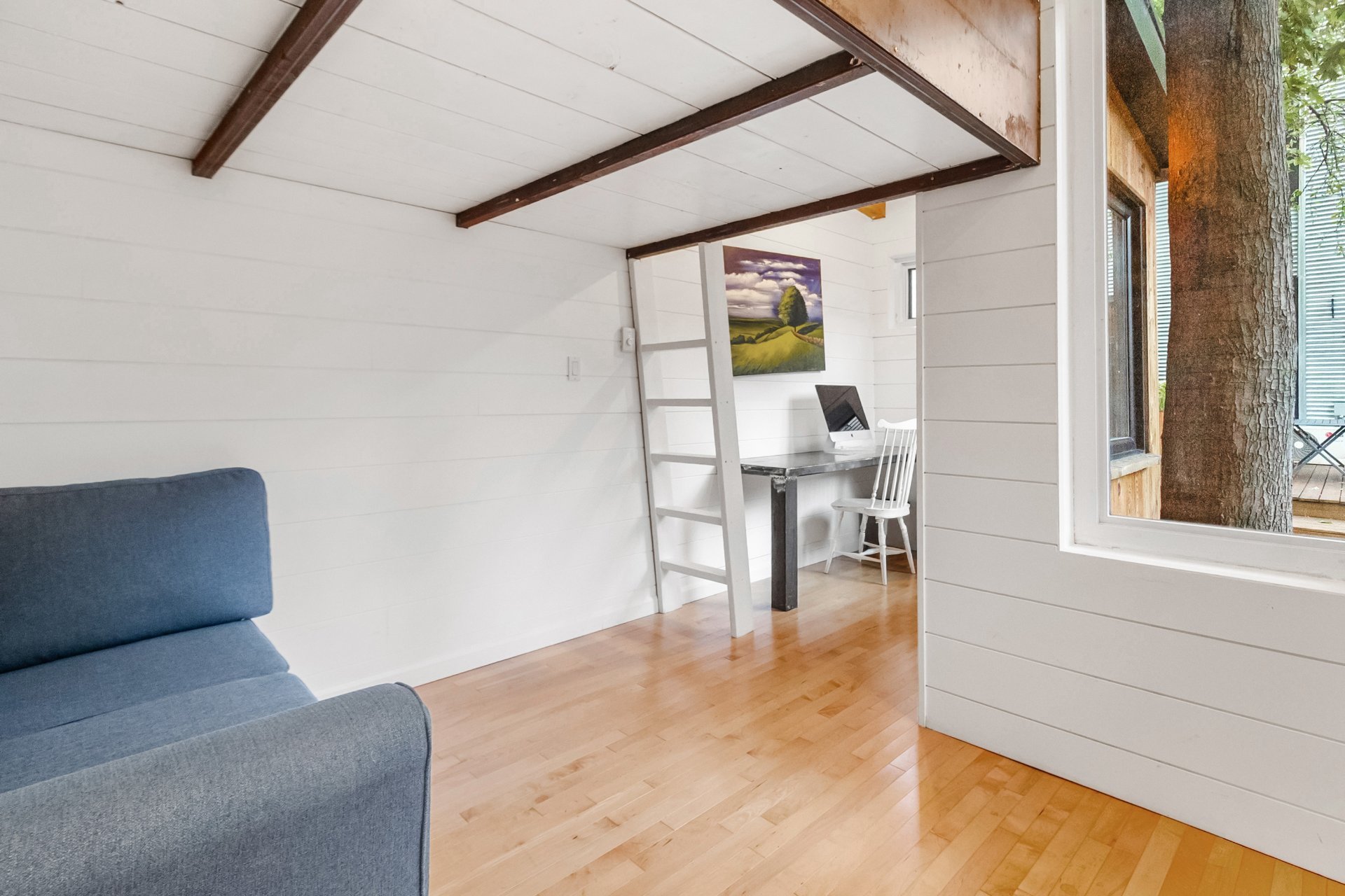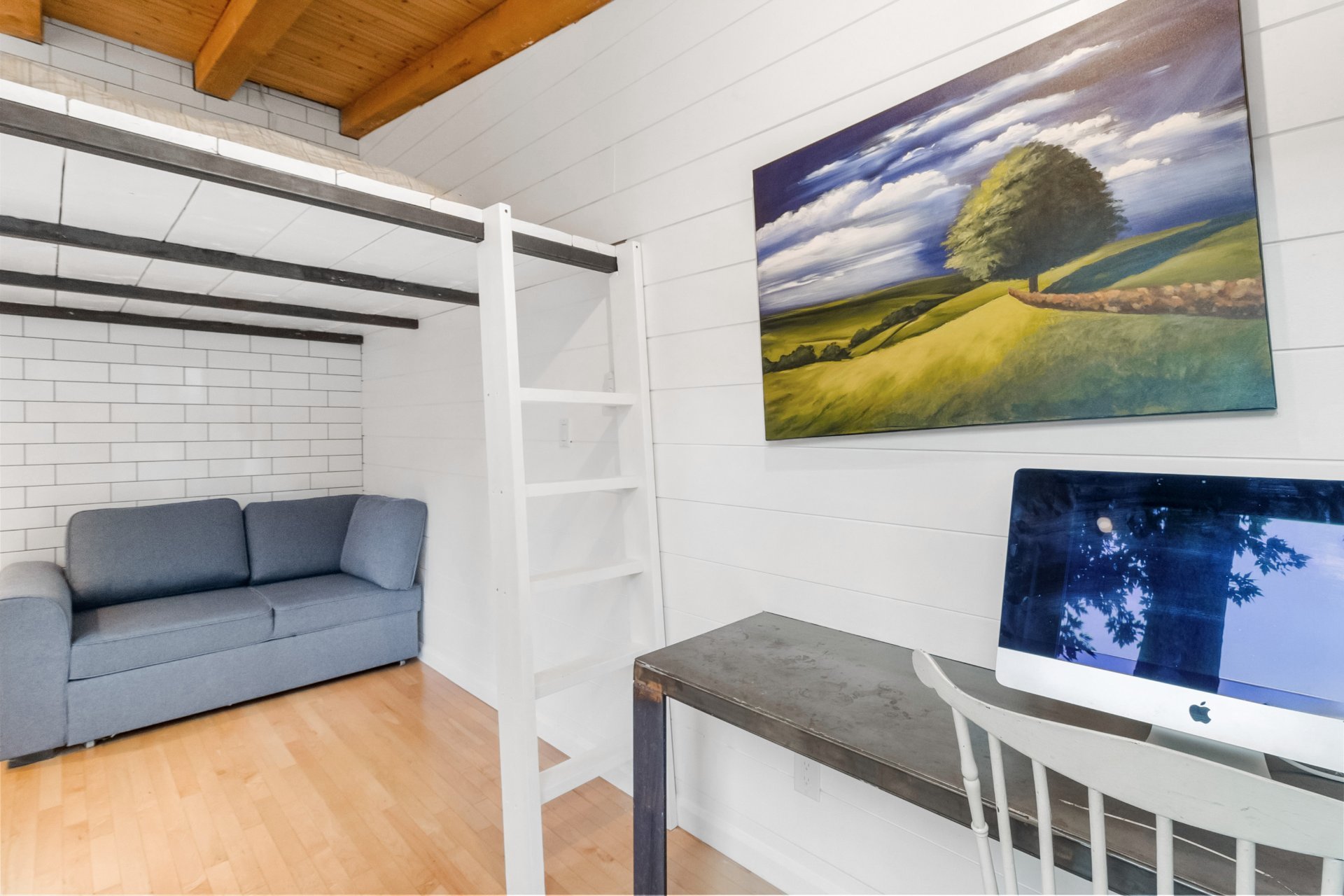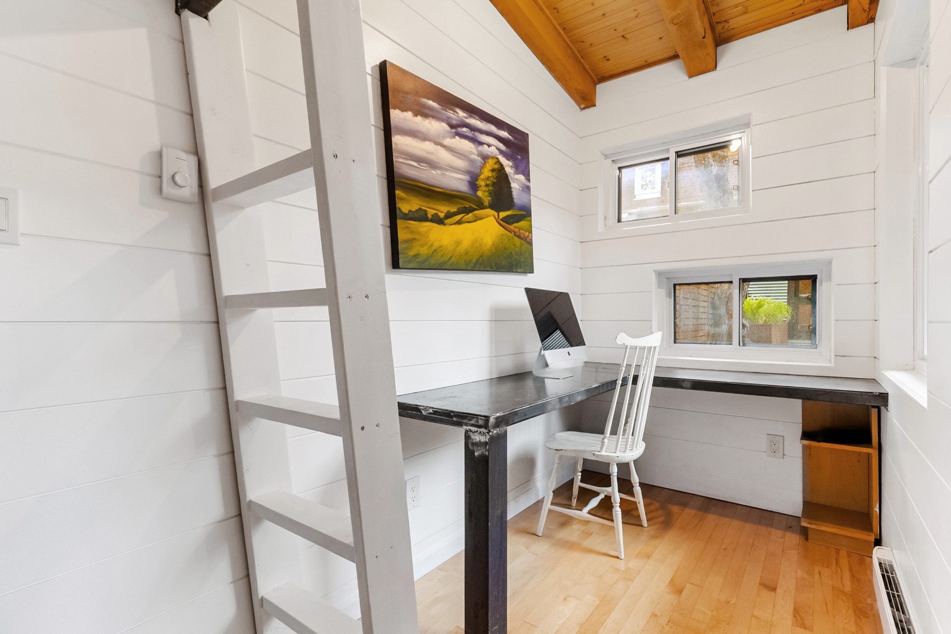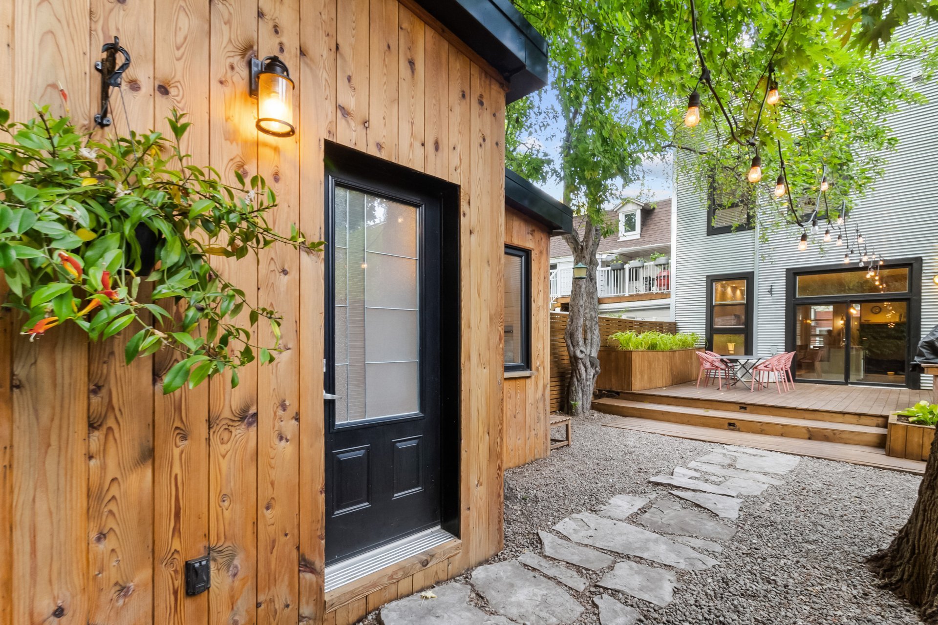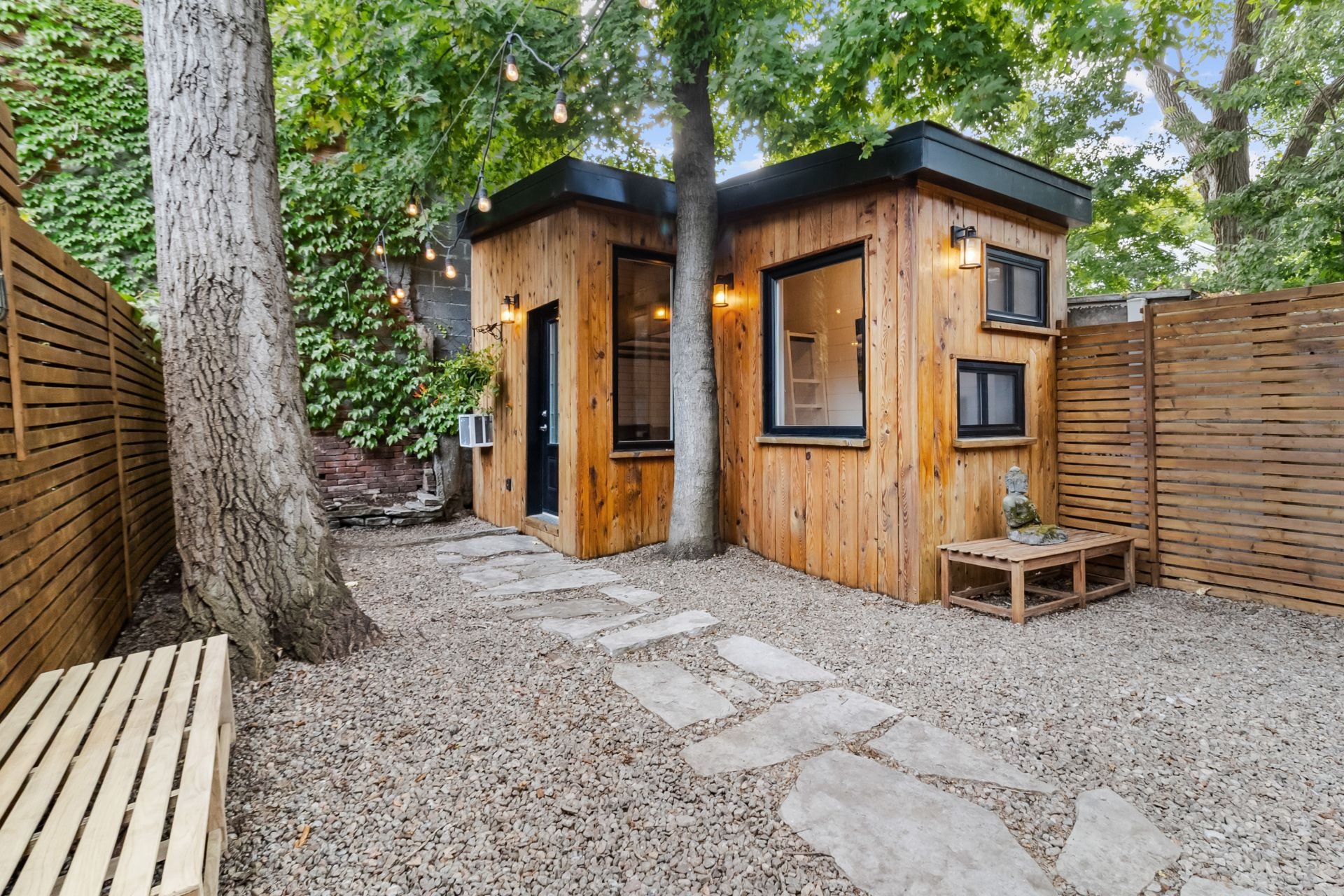 - Accès à la grande cour privée : terrasse de bois et cabine/maisonnette avec mezzanine.