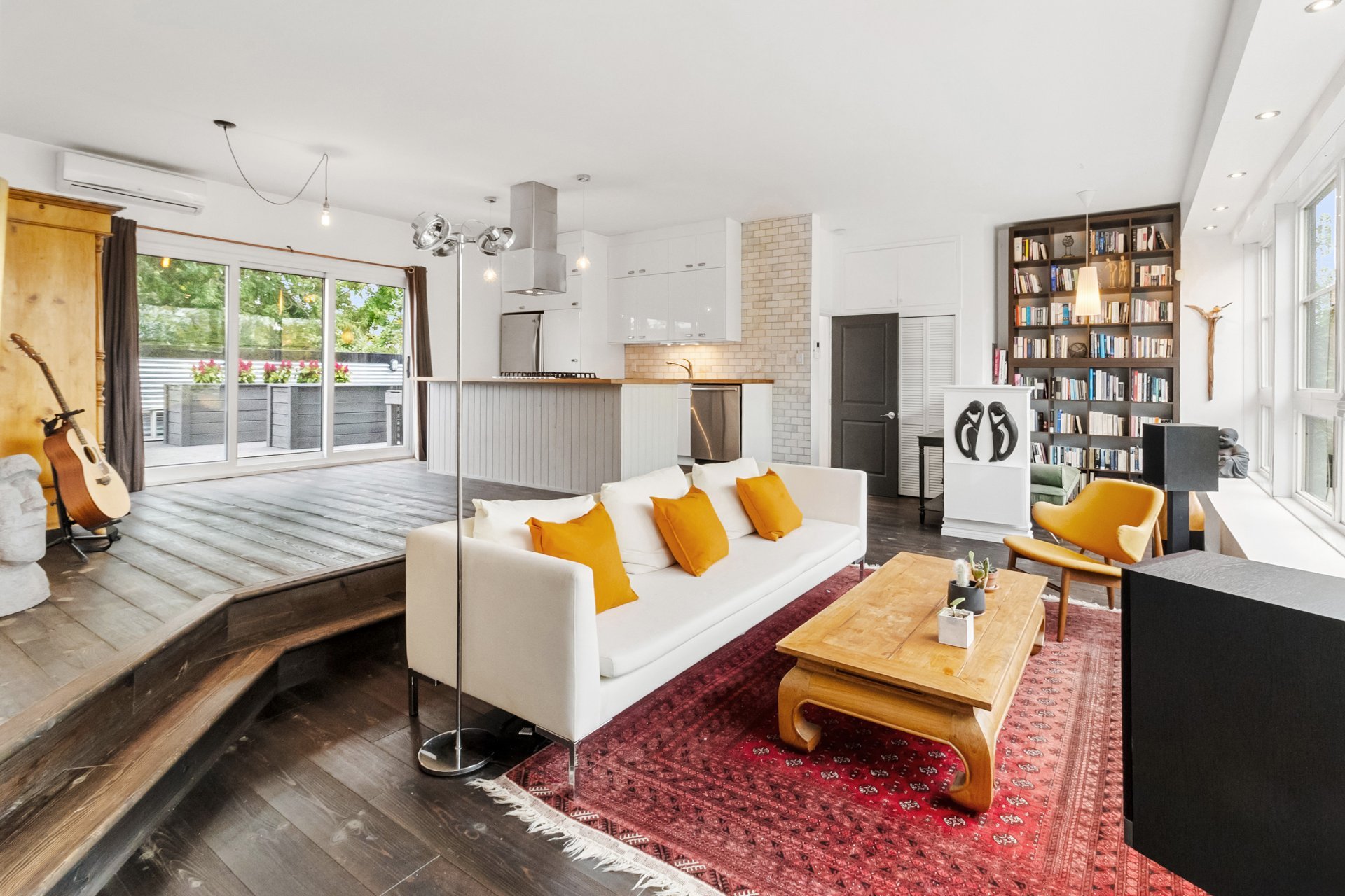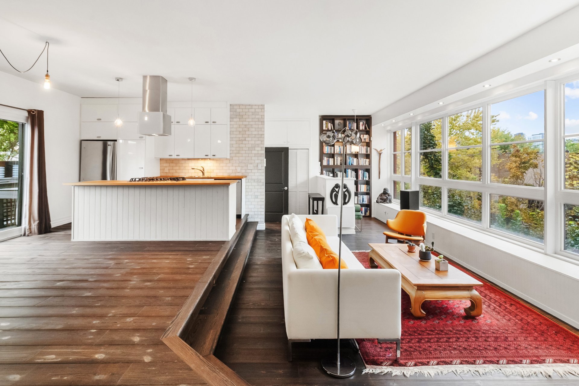 - Spacieux salon avec grandes fenêtres et vue sur Montréal.