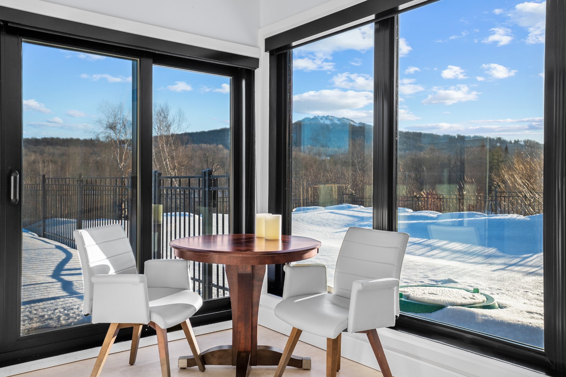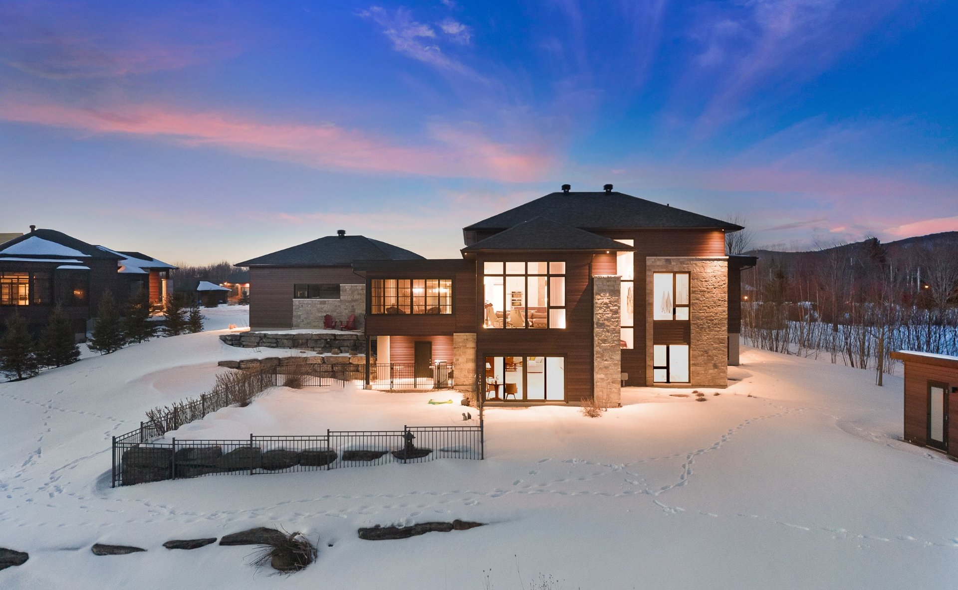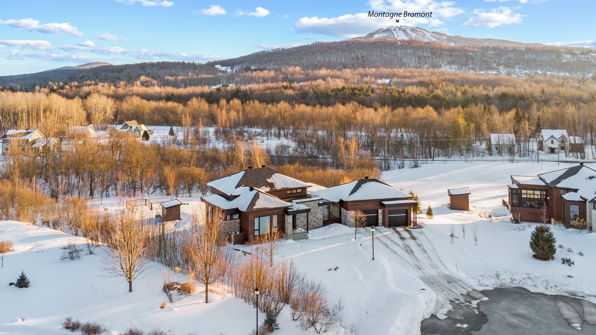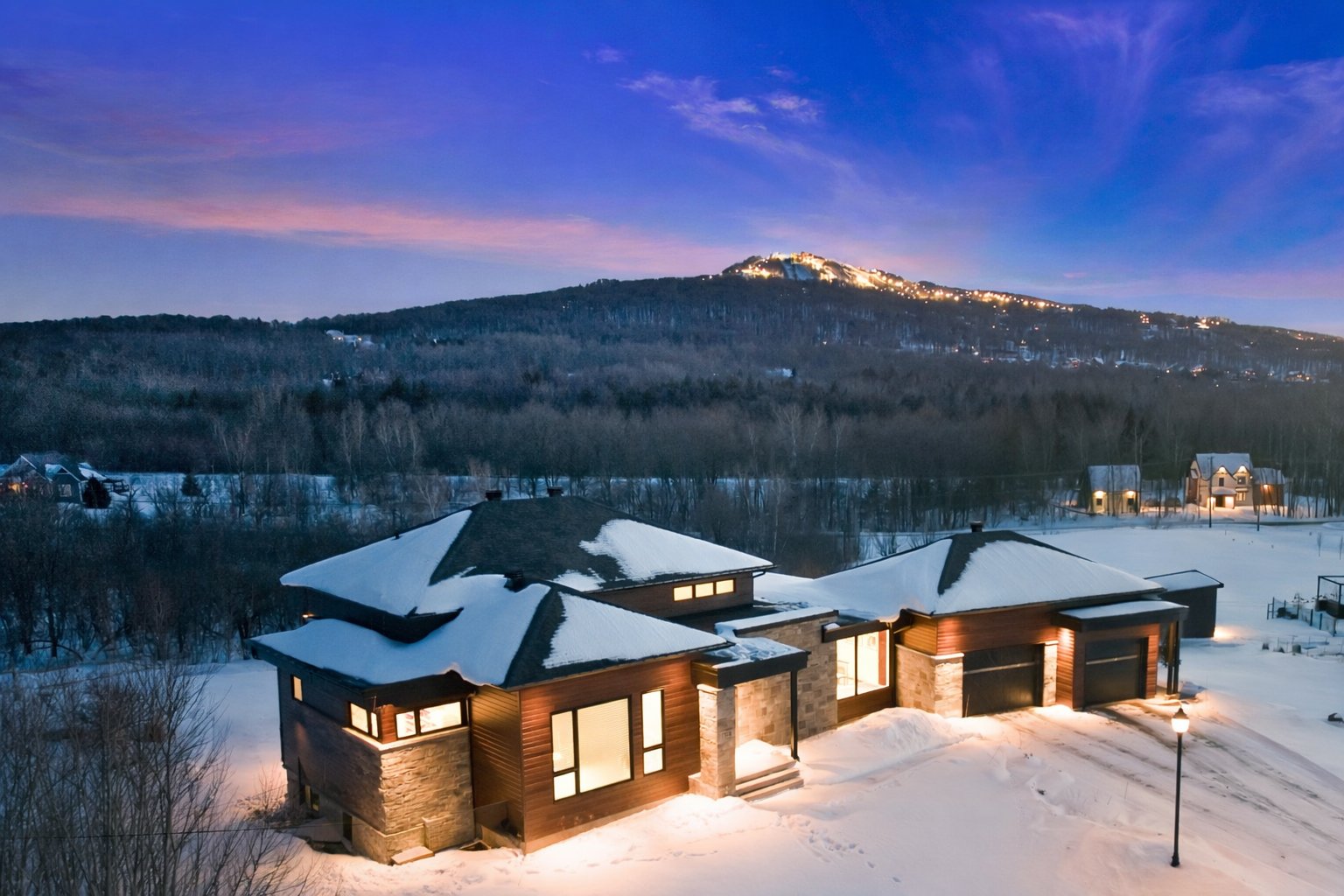 Implantée sur un vaste terrain boisé de plus de 2,5 acres, sans voisin arrière, elle offre une vue spectaculaire sur la montagne de Bromont, féérique lorsqu'elle s'illumine en soirée.