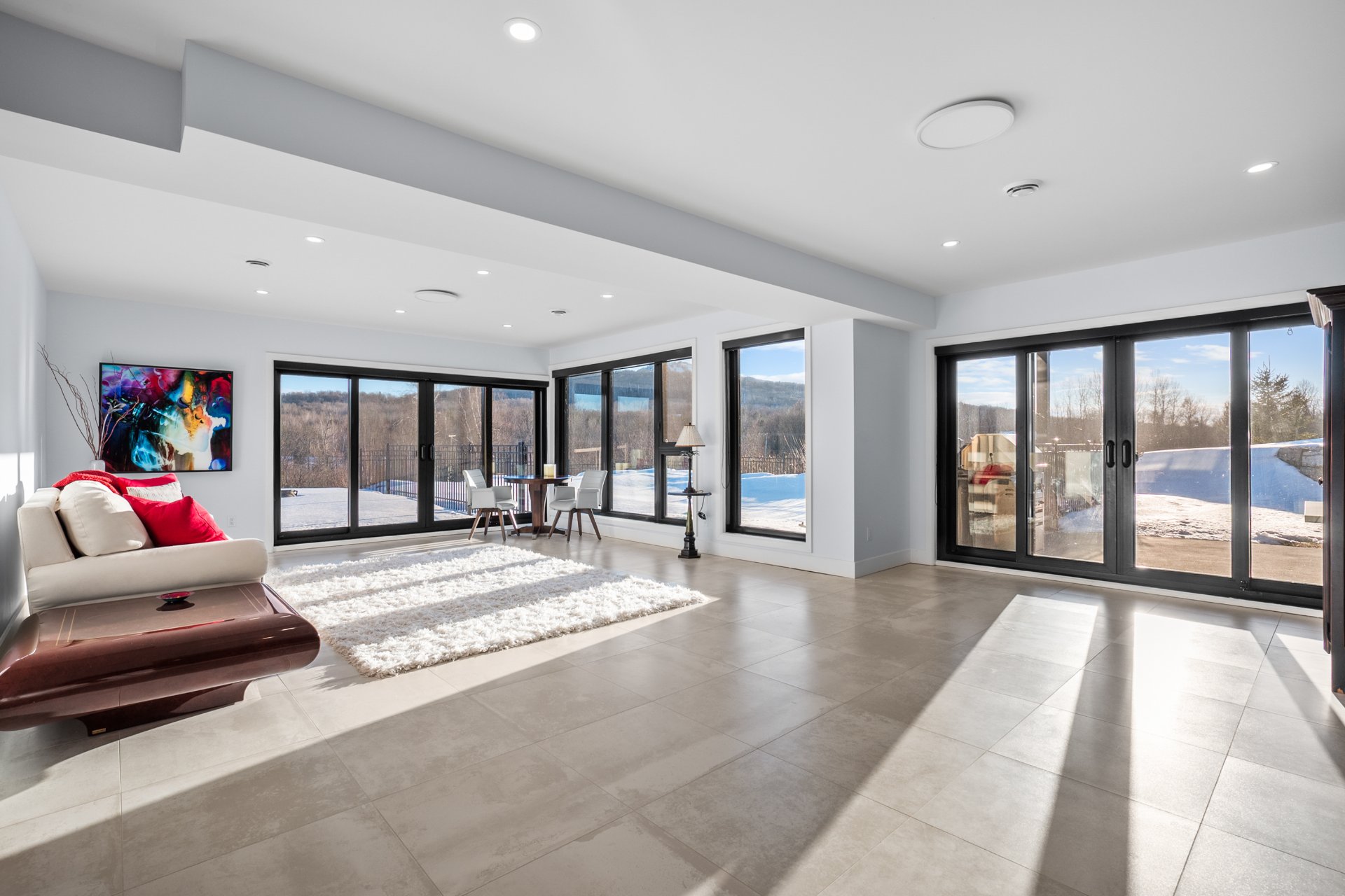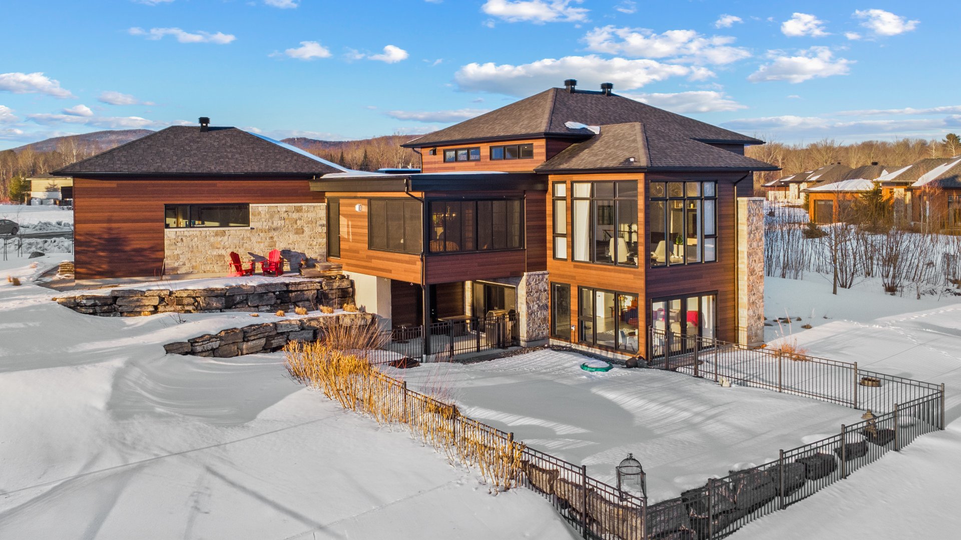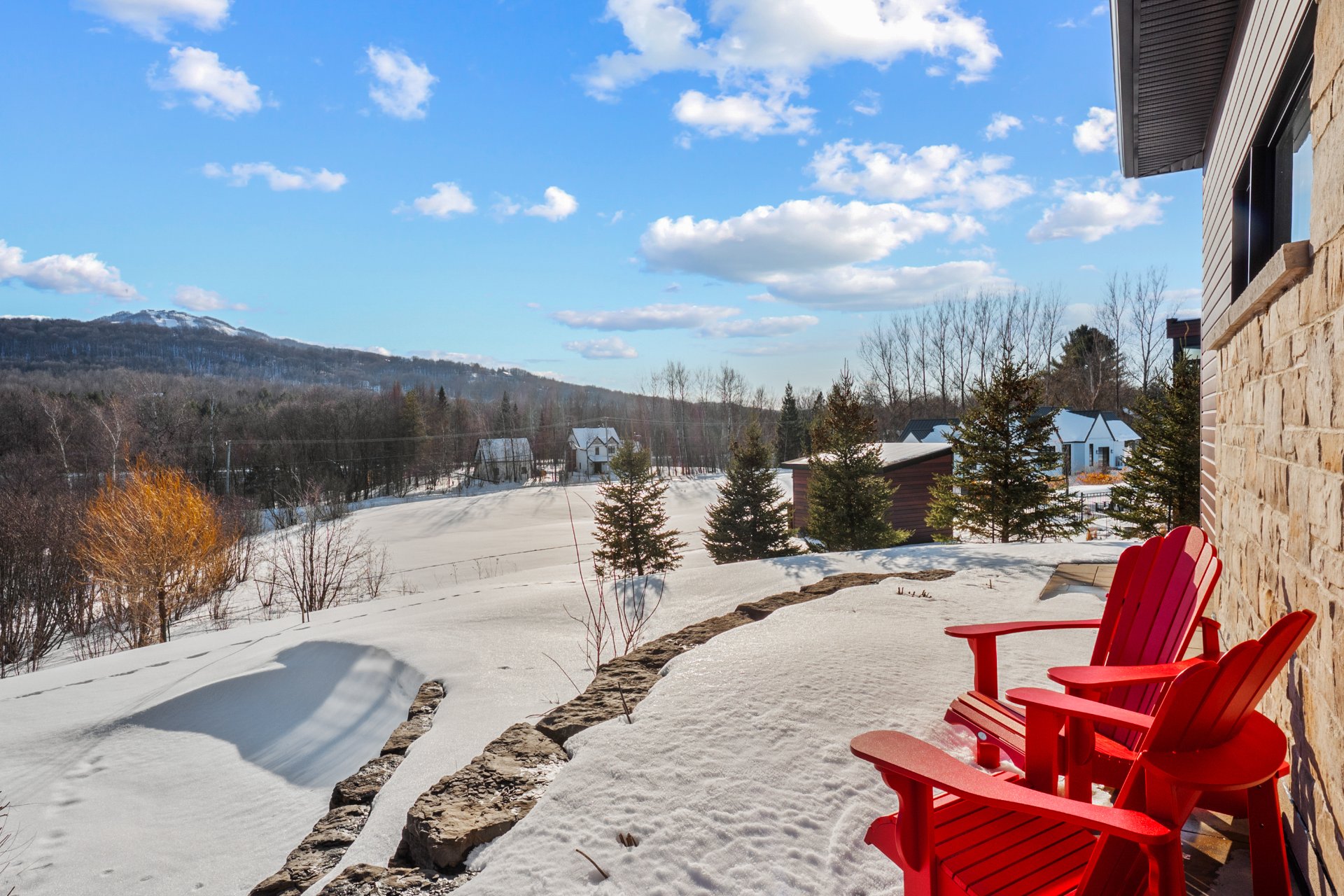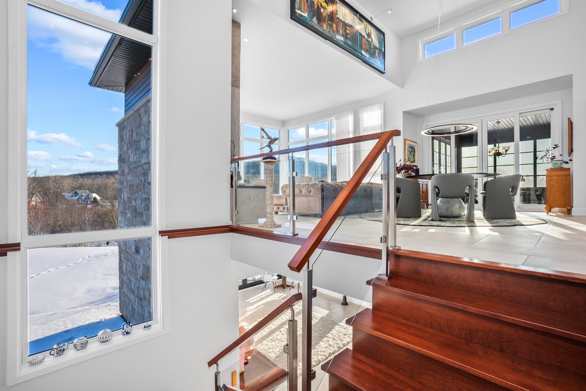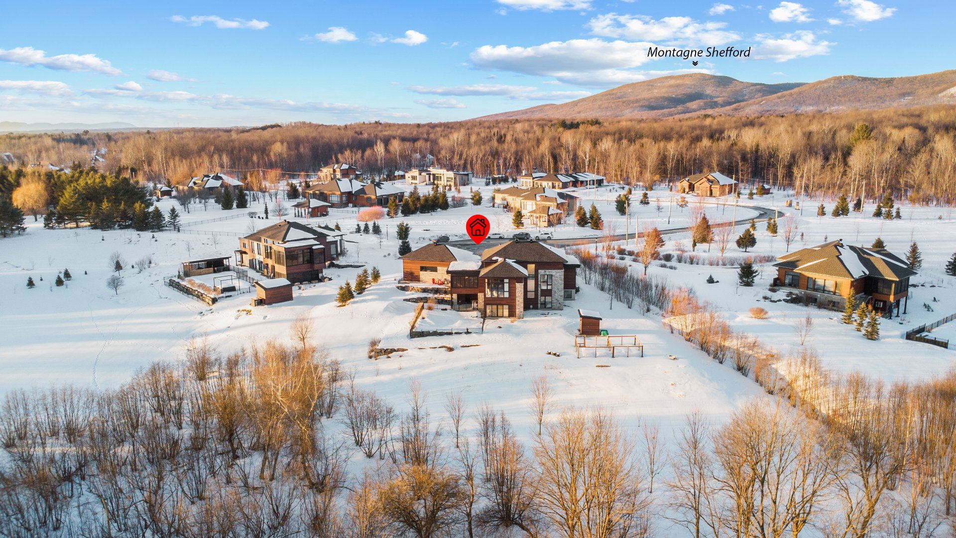 Implantée sur un vaste terrain boisé de plus de 2,5 acres, sans voisin arrière, elle offre une vue spectaculaire sur la montagne de Bromont, féérique lorsqu'elle s'illumine en soirée.