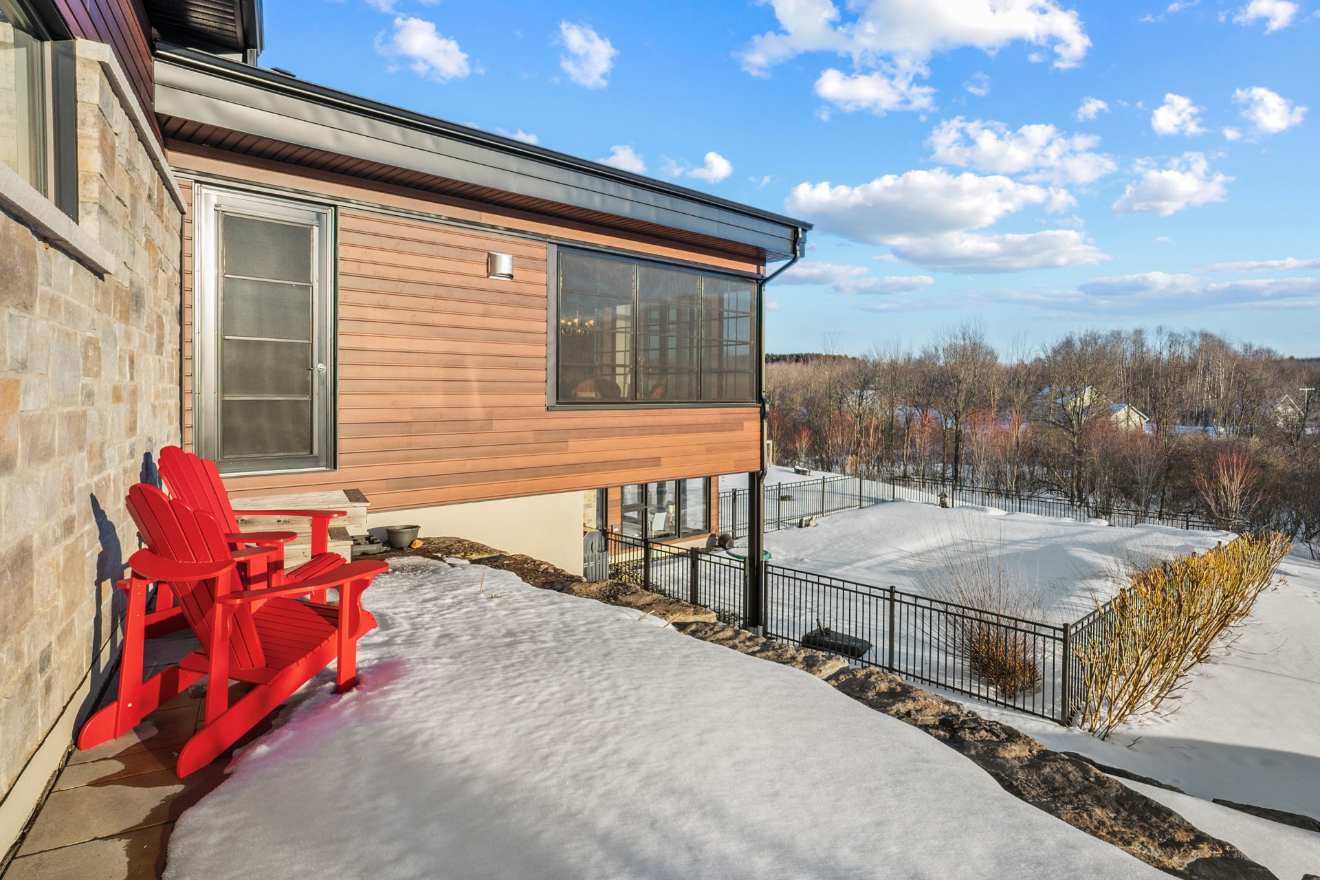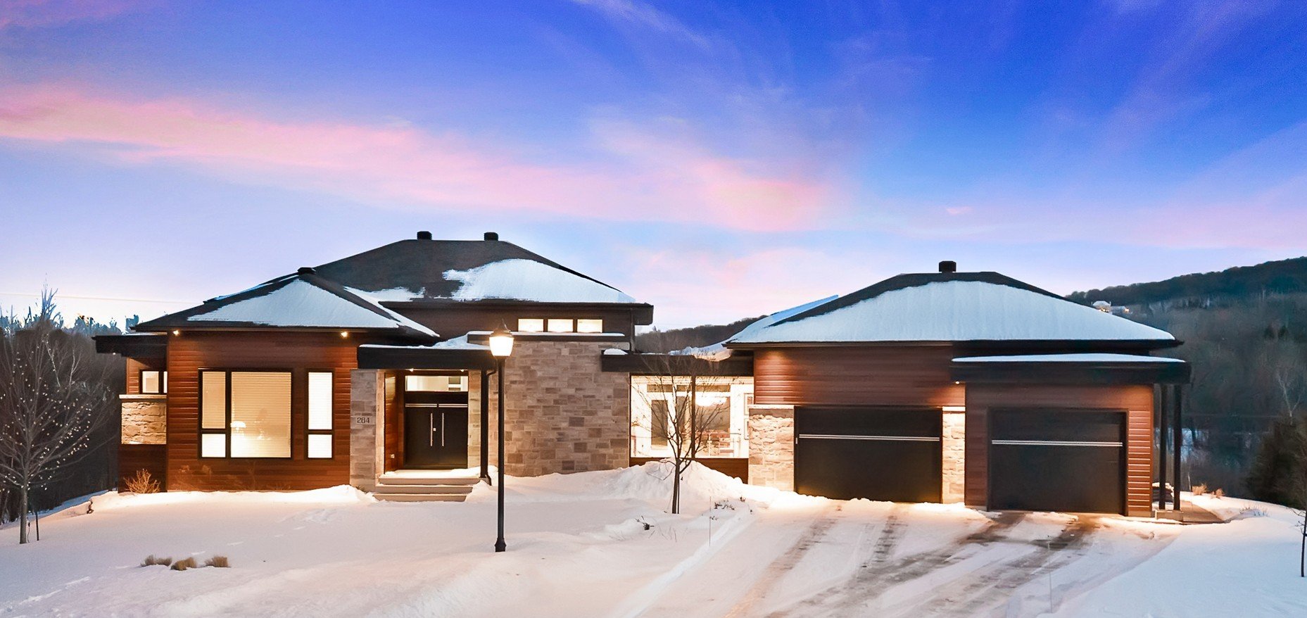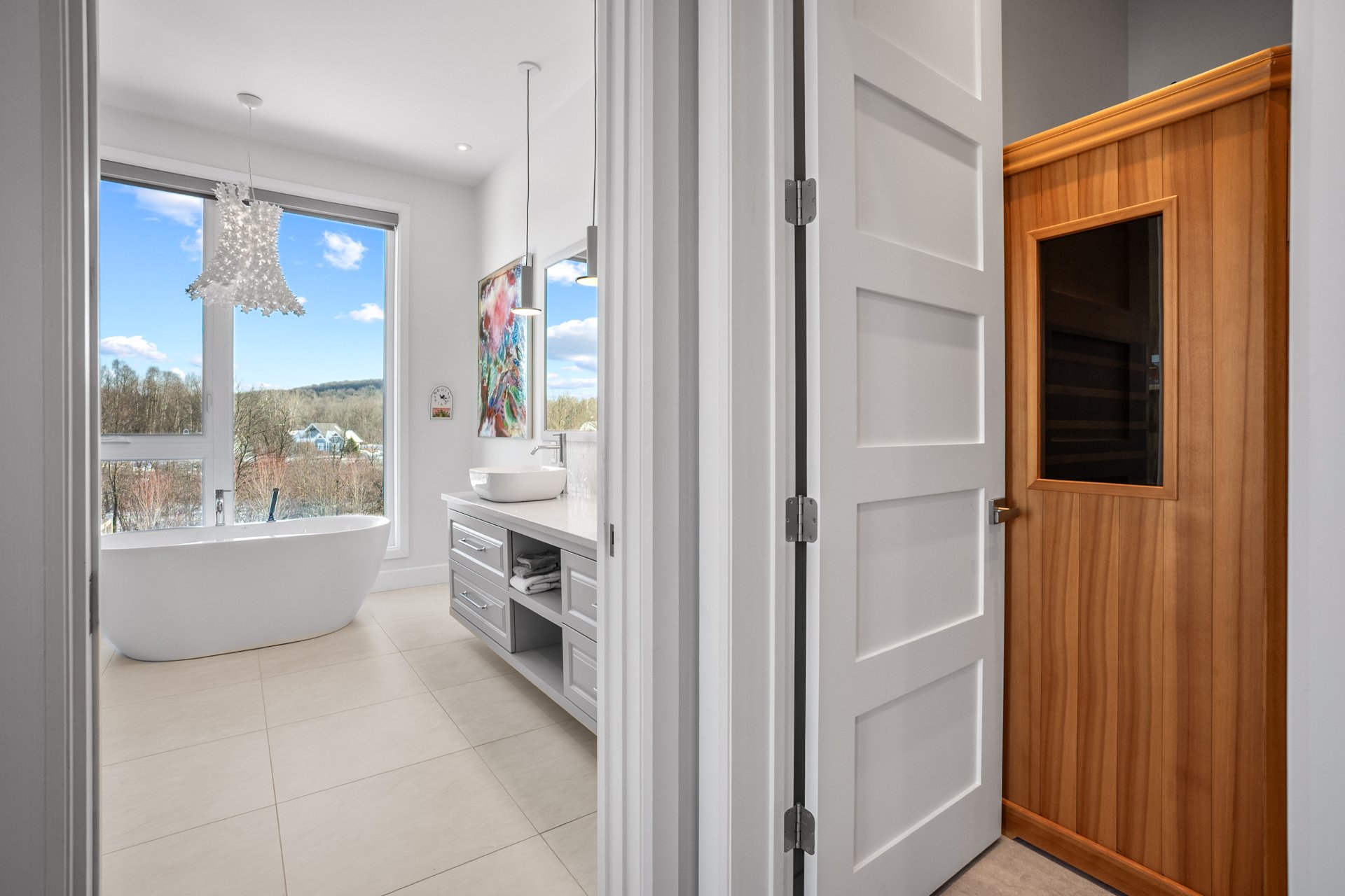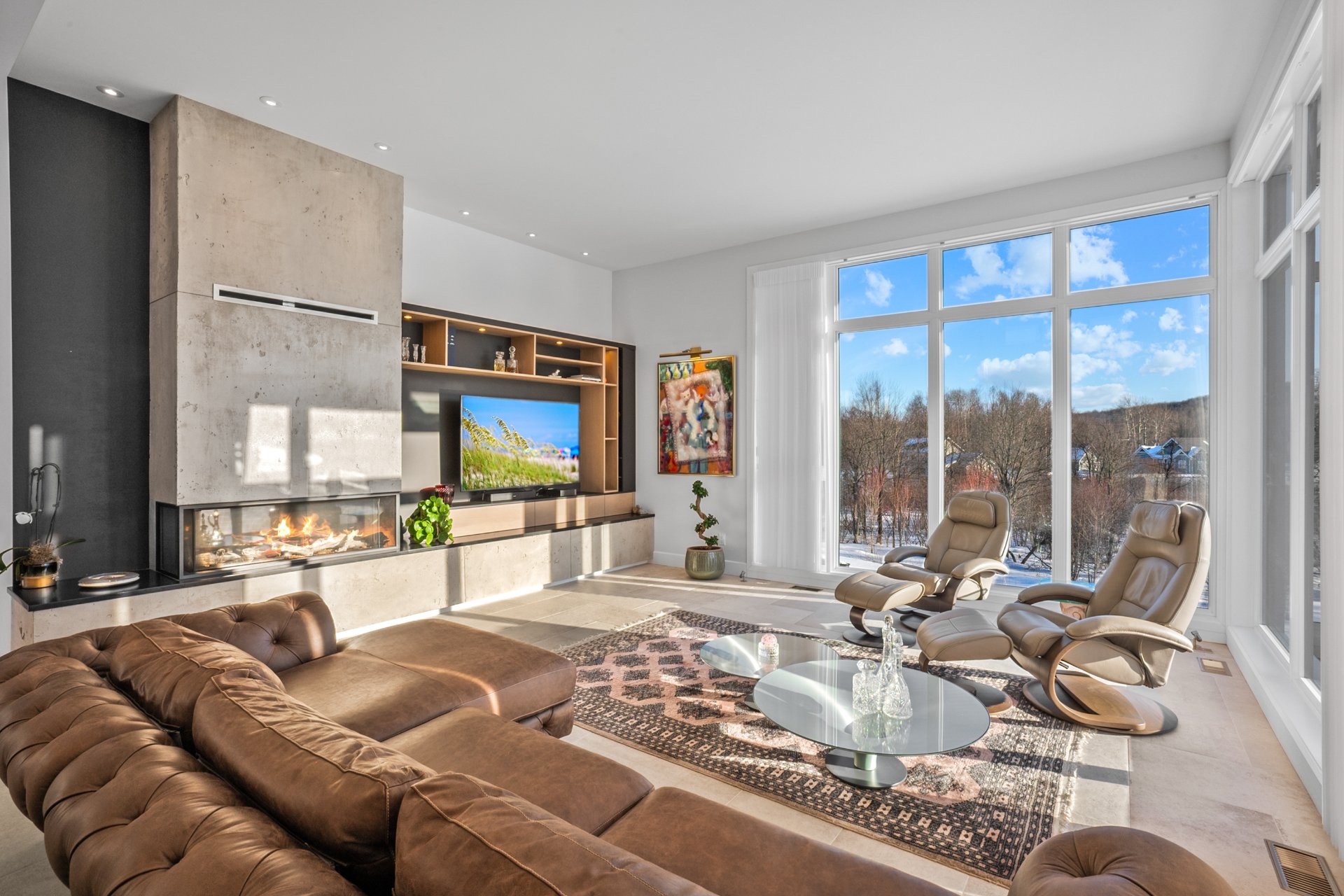 Implantée sur un vaste terrain boisé de plus de 2,5 acres, sans voisin arrière, elle offre une vue spectaculaire sur la montagne de Bromont, féérique lorsqu'elle s'illumine en soirée.