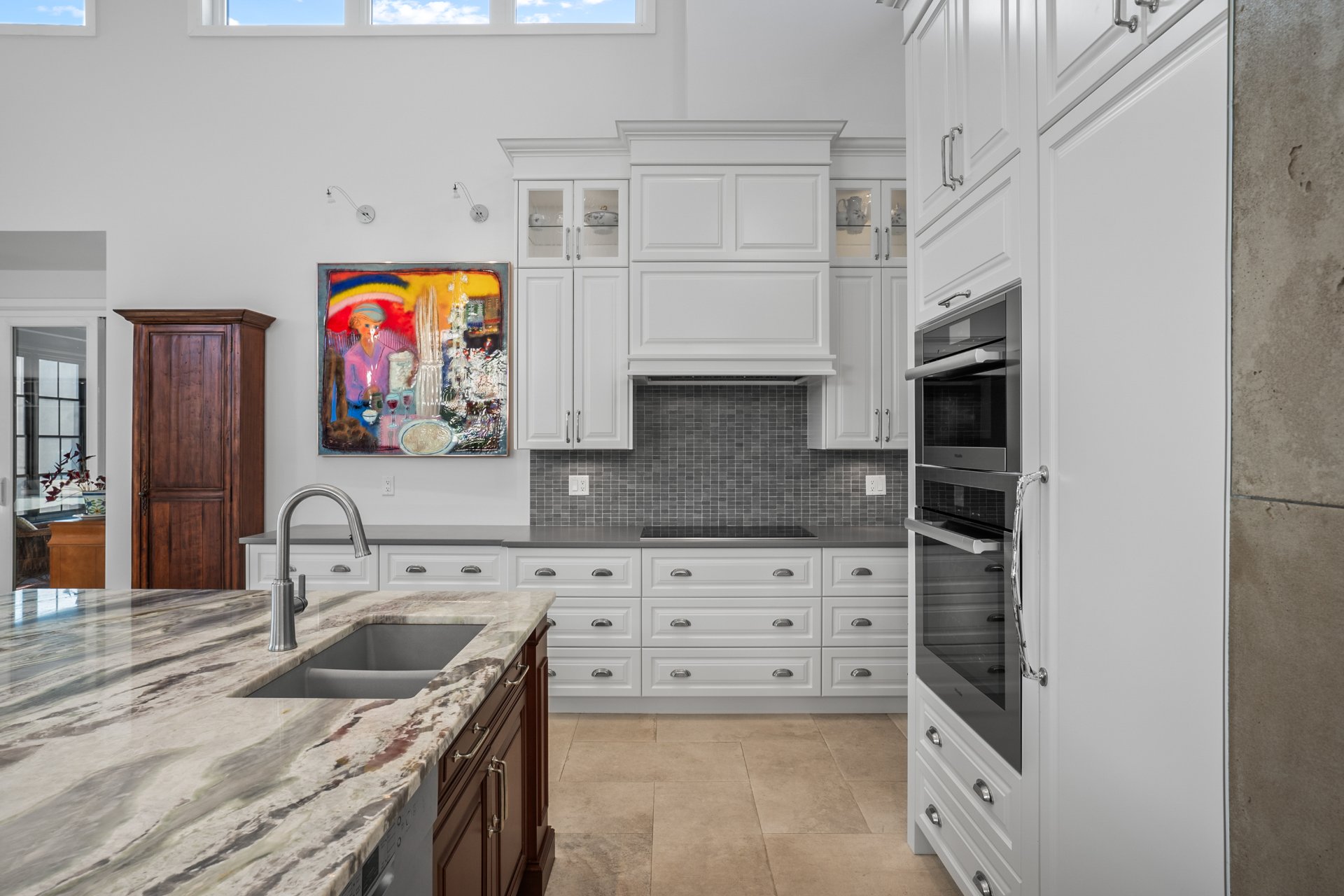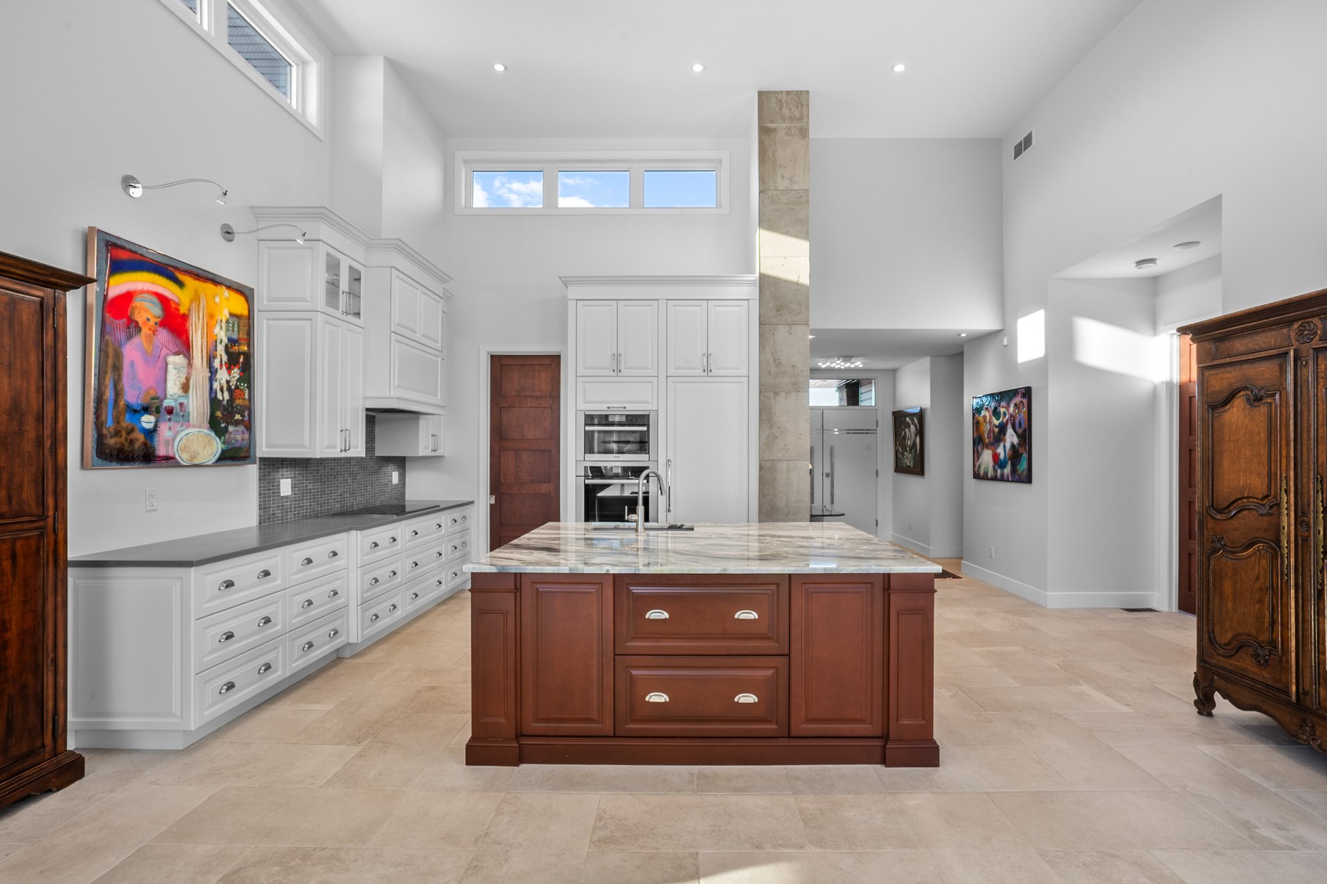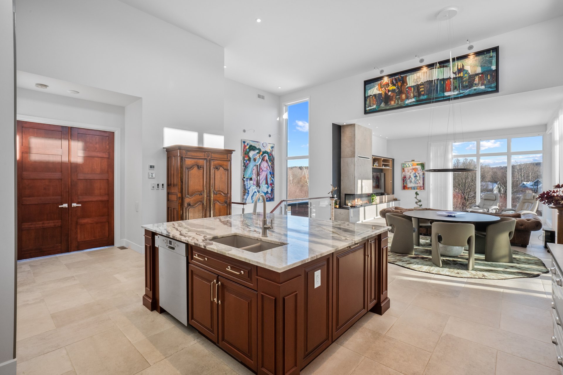 La cuisine, pensée pour les amateurs de gastronomie, impressionne par son immense îlot en marbre, son garde-manger avec évier et ses électroménagers haut de gamme. Elle s'ouvre sur une vaste véranda trois saisons avec foyer au gaz - un espace privilégié pour recevoir et prolonger les soirées.