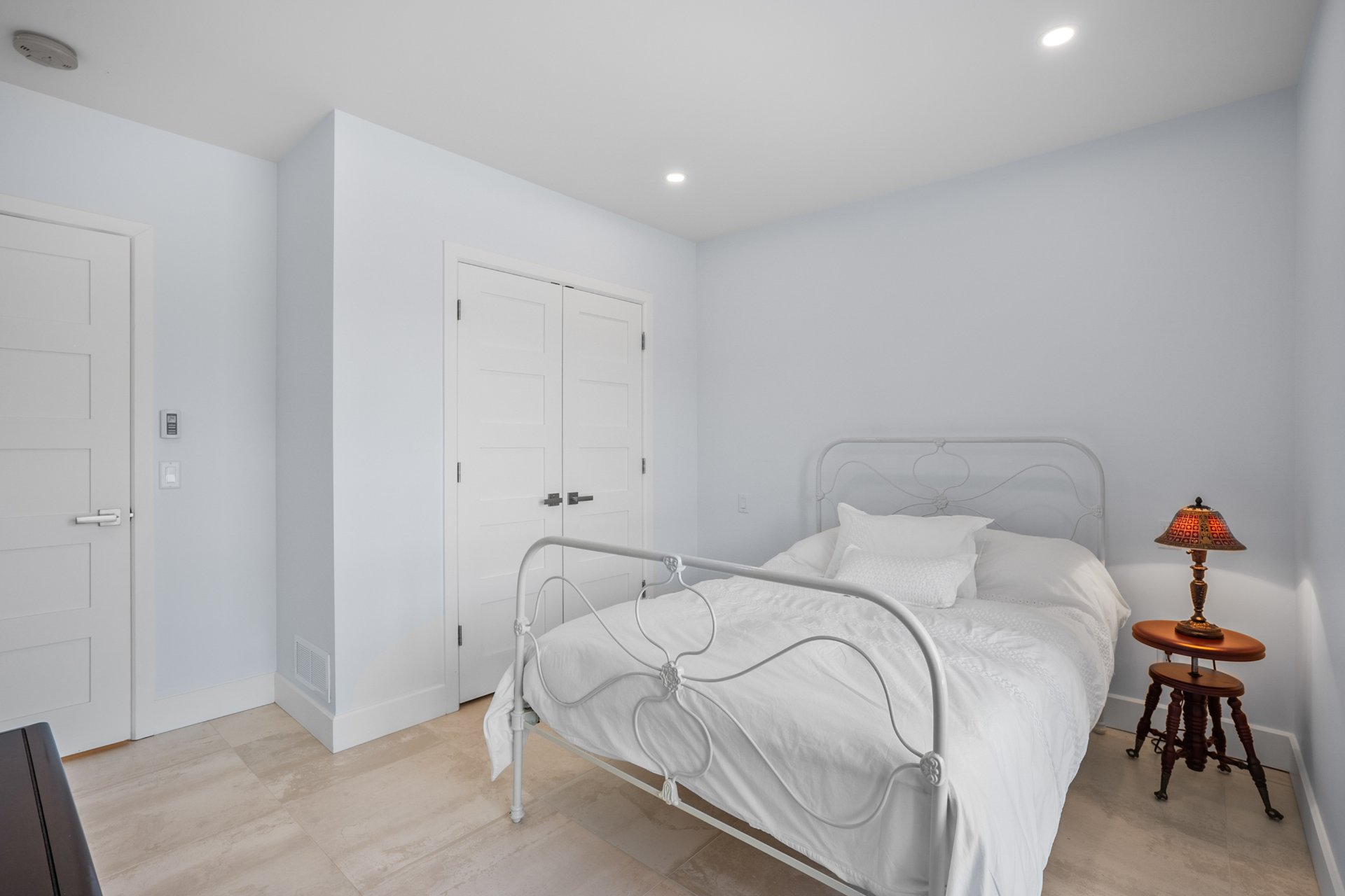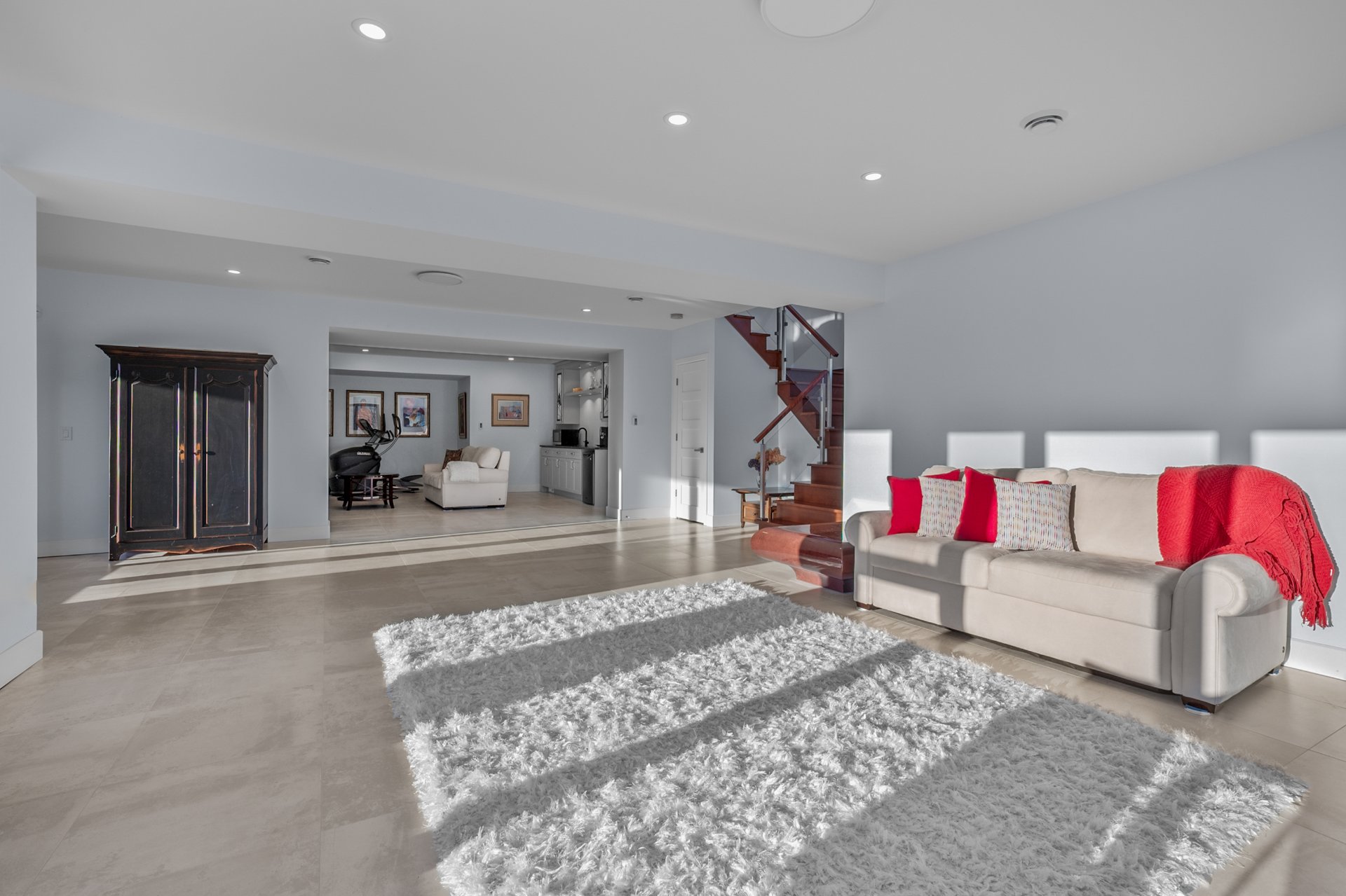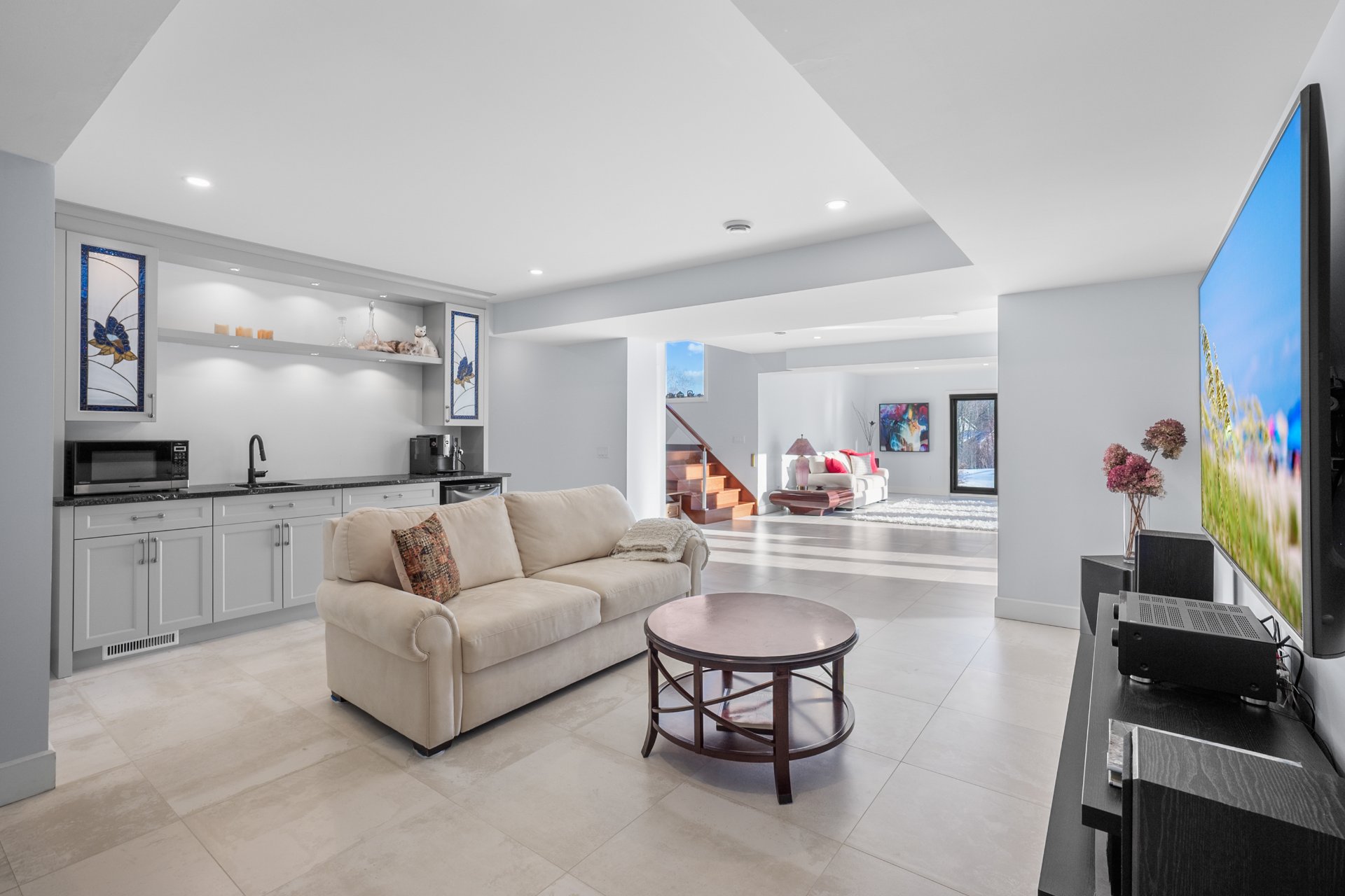 Le rez-de-jardin, lumineux grâce à sa généreuse fenestration, accueille deux chambres supplémentaires, une salle de bains complète et une grande salle de jeux avec section bar/cuisine, idéale pour la famille et les invités.