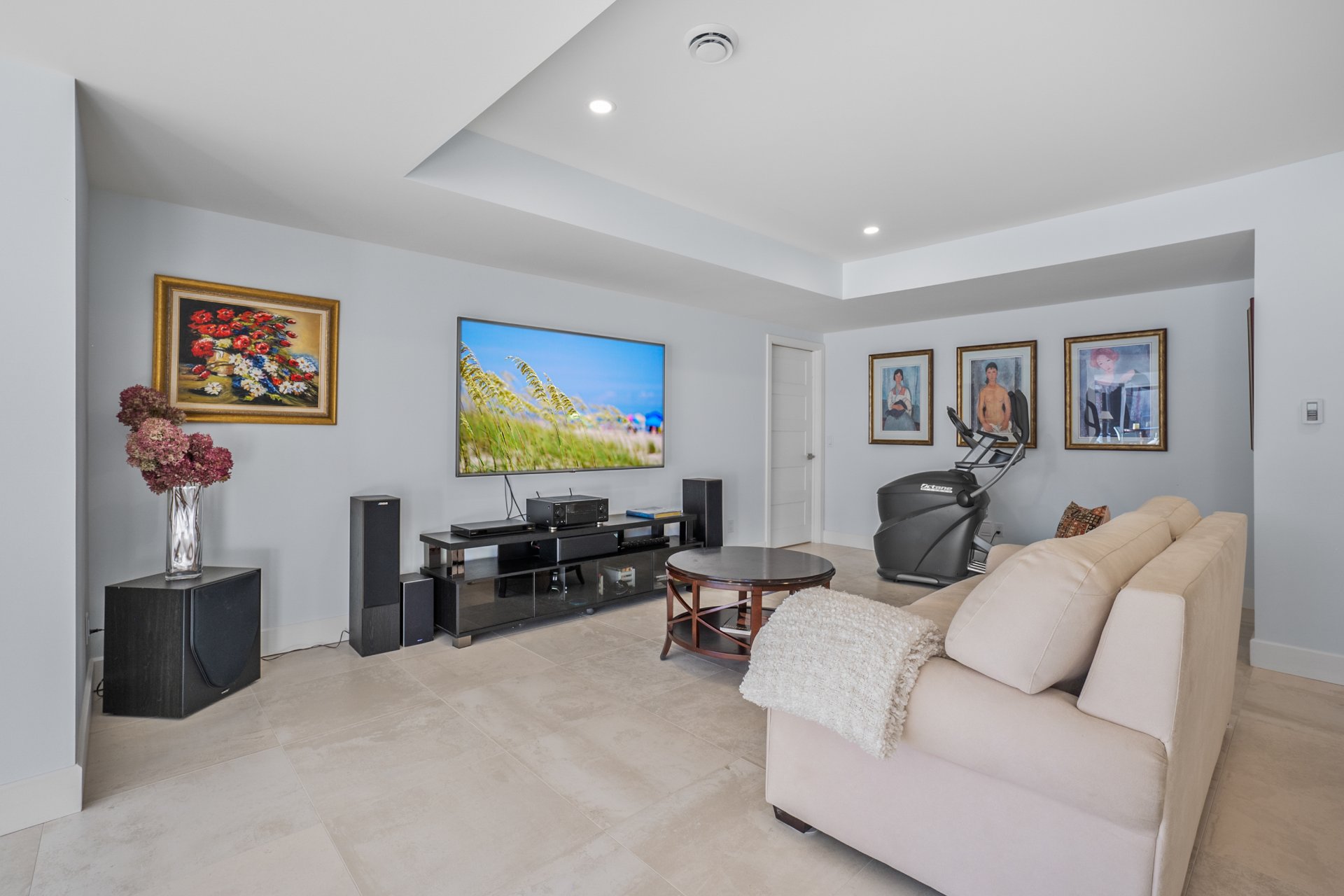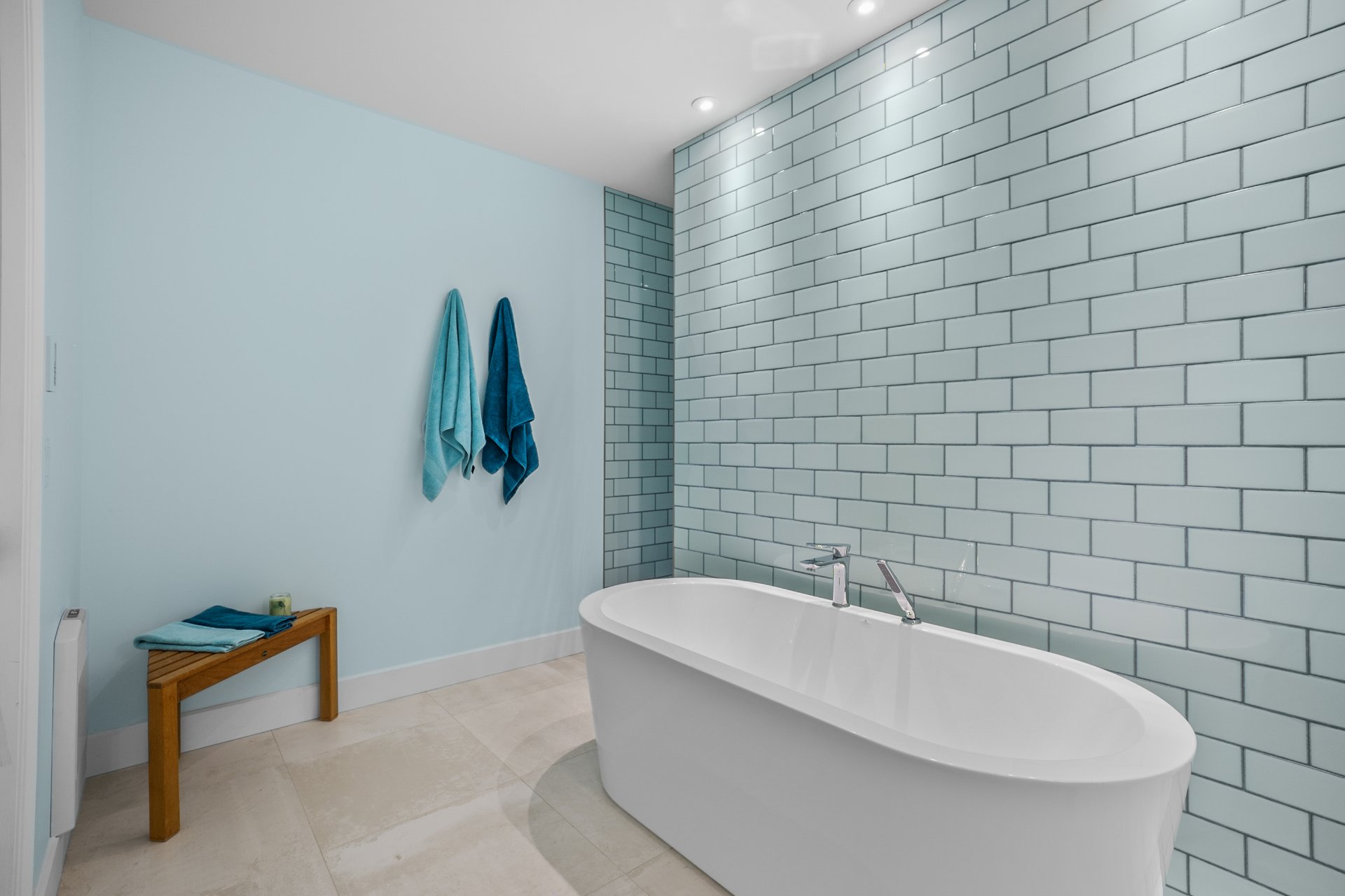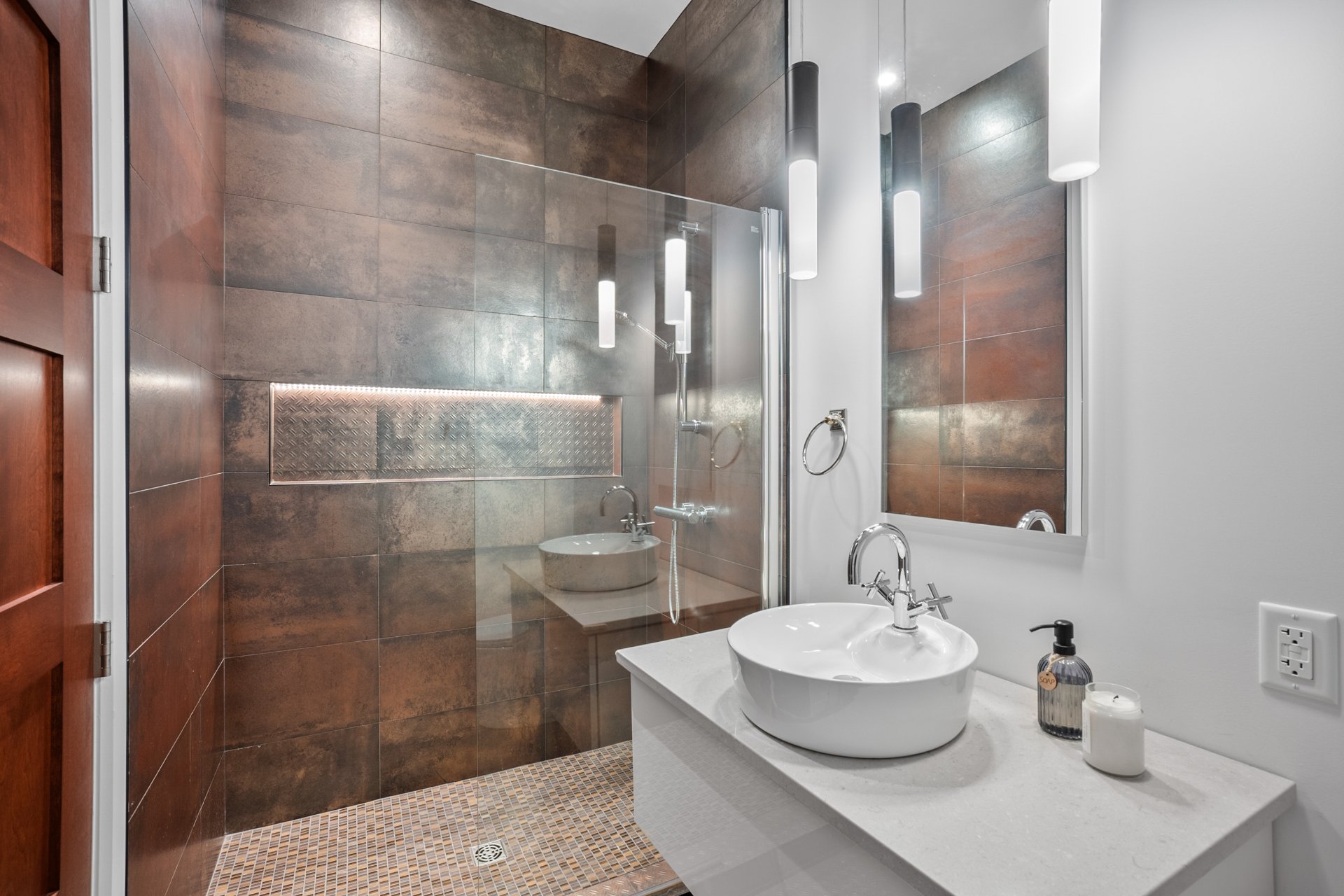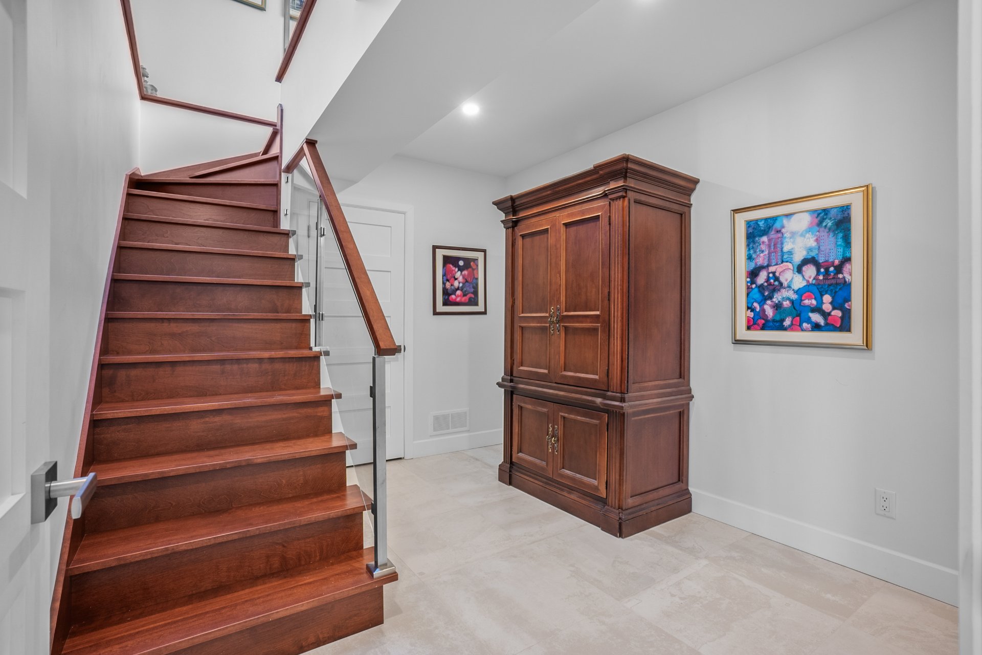 Le rez-de-jardin, lumineux grâce à sa généreuse fenestration, accueille deux chambres supplémentaires, une salle de bains complète et une grande salle de jeux avec section bar/cuisine, idéale pour la famille et les invités.