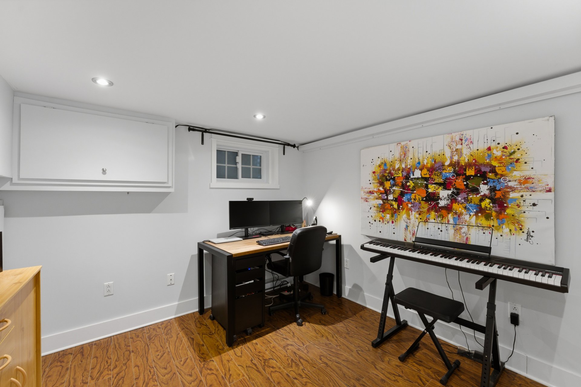 Le sous-sol entièrement aménagé avec plafonds de 7 pieds propose une vaste salle familiale, un bureau pouvant servir de chambre, ainsi qu'une salle d'entraînement. Une salle de bain avec bain-douche et une salle de lavage indépendante complètent cet étage, offrant un espace polyvalent et bien organisé.