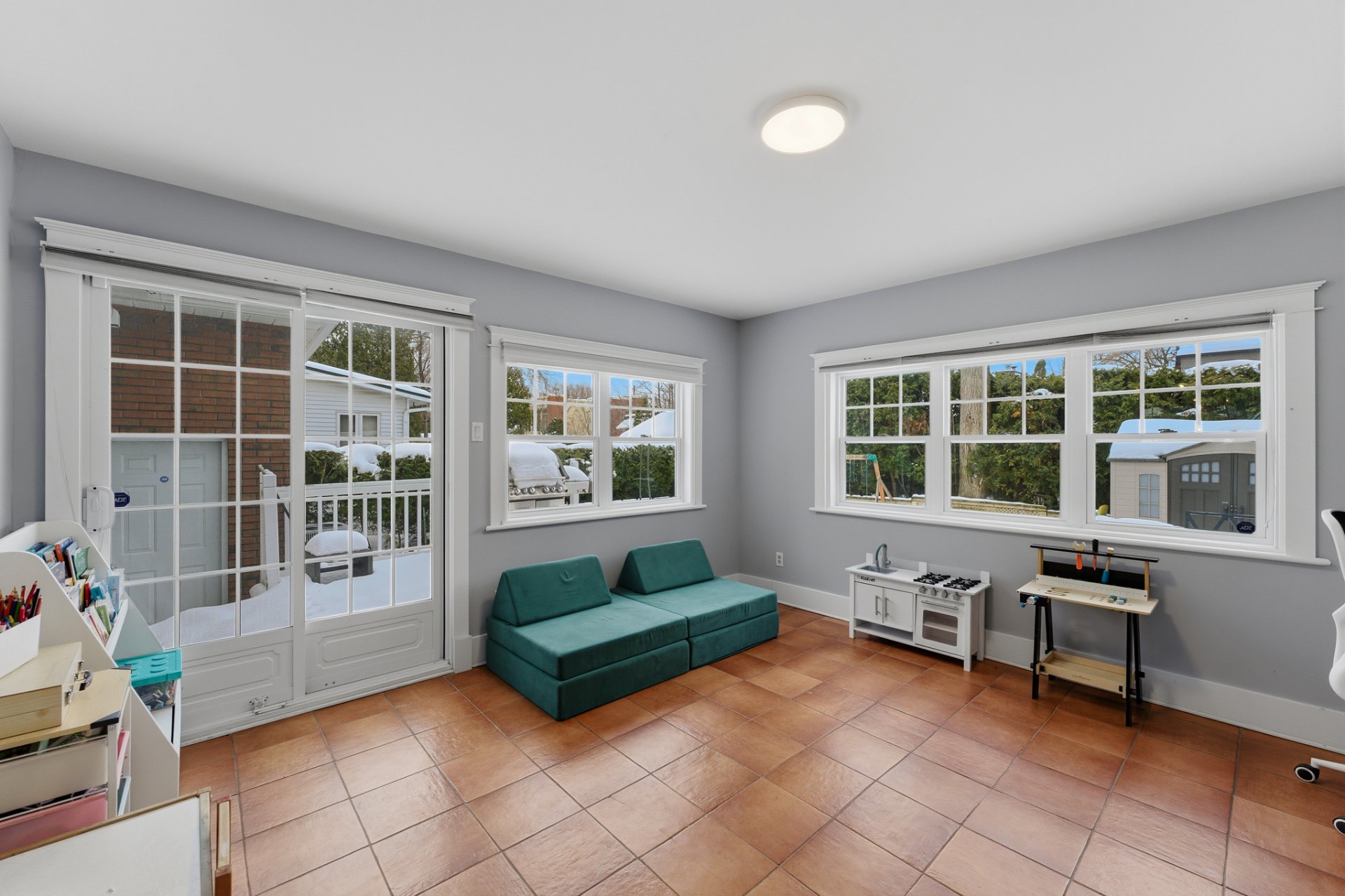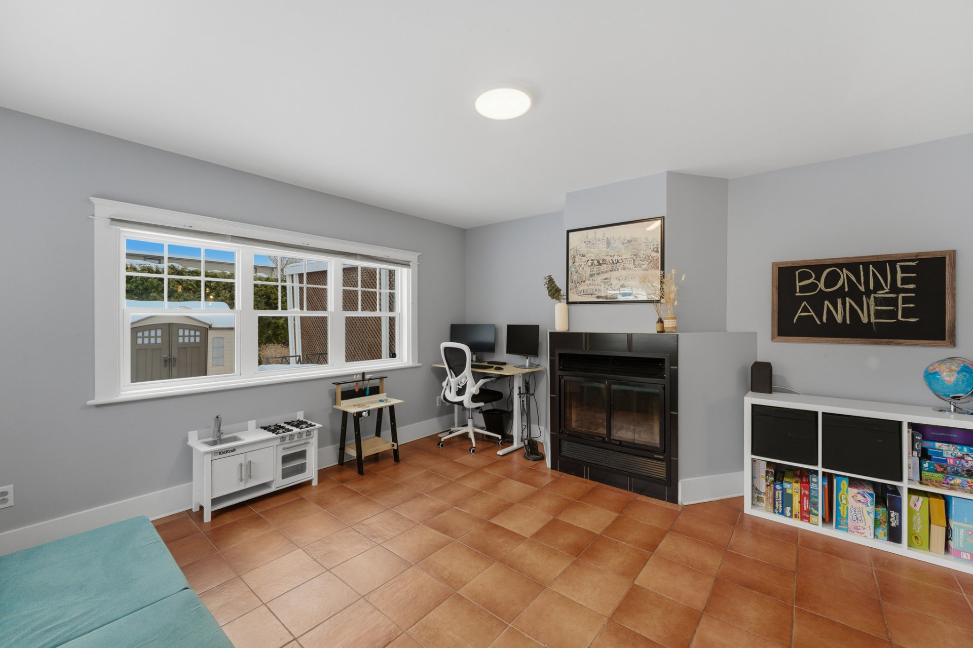 À l'arrière, une extension lumineuse aménagée en salle de jeux se distingue par son plancher chauffant et son foyer au bois, offrant un espace polyvalent pour en profiter en toute saison.