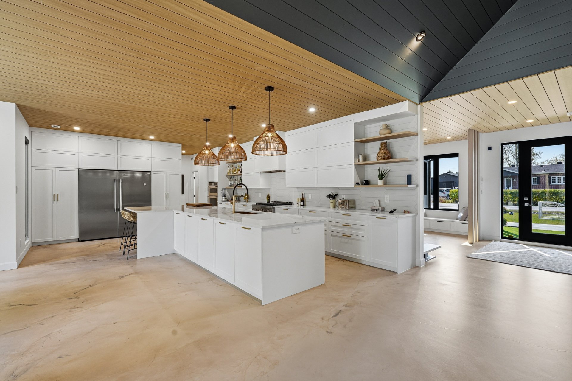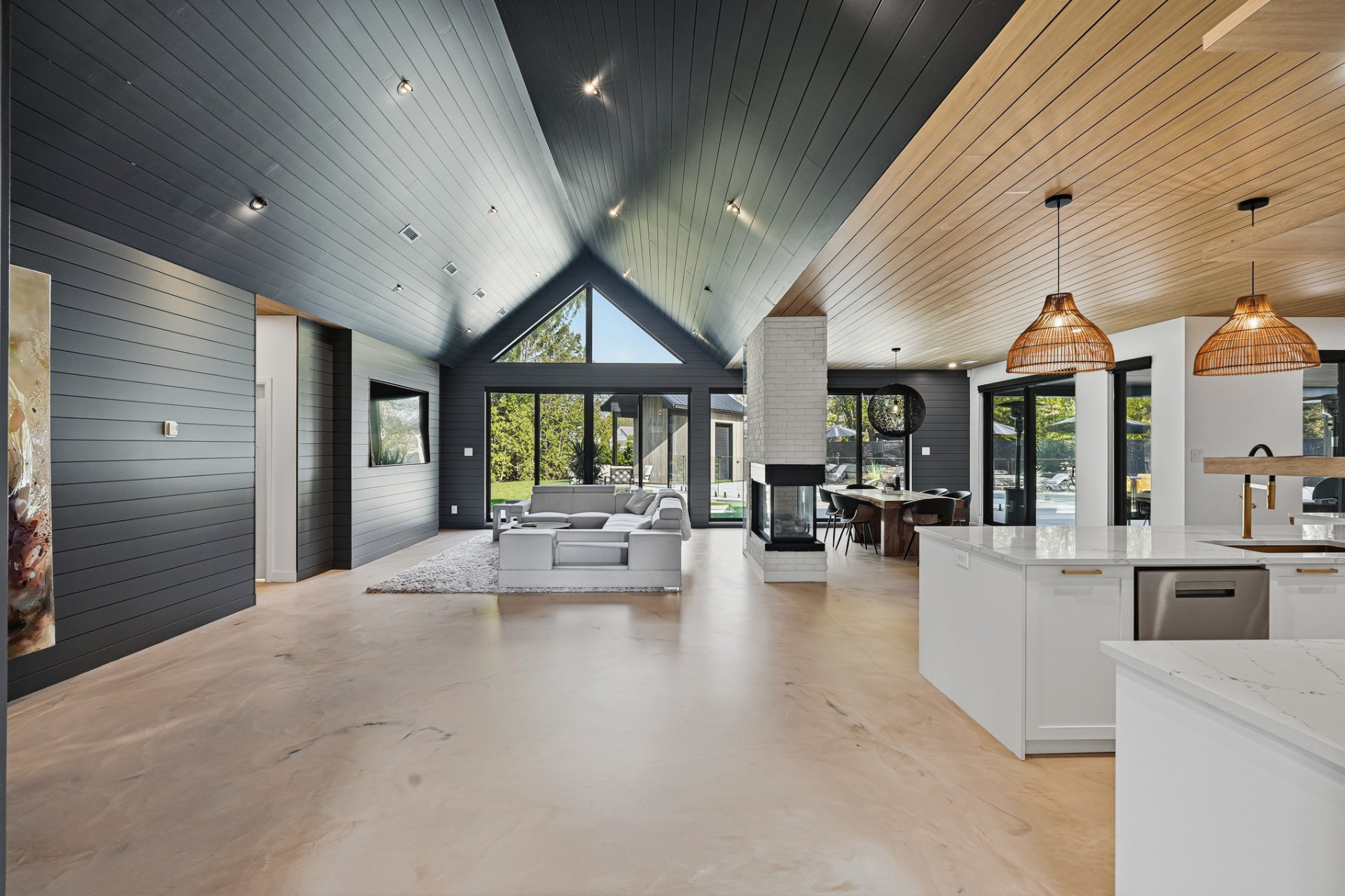 La maison offre une superficie habitable de plus de 4 288 pi² et compte six chambres, trois salles de bains complètes et une salle d'eau. L'ensemble des planchers est chauffant, assurant un confort absolu en toute saison. Le coeur de la demeure s'articule autour d'une aire ouverte spectaculaire, dominée par un plafond cathédrale et un foyer central à trois faces.