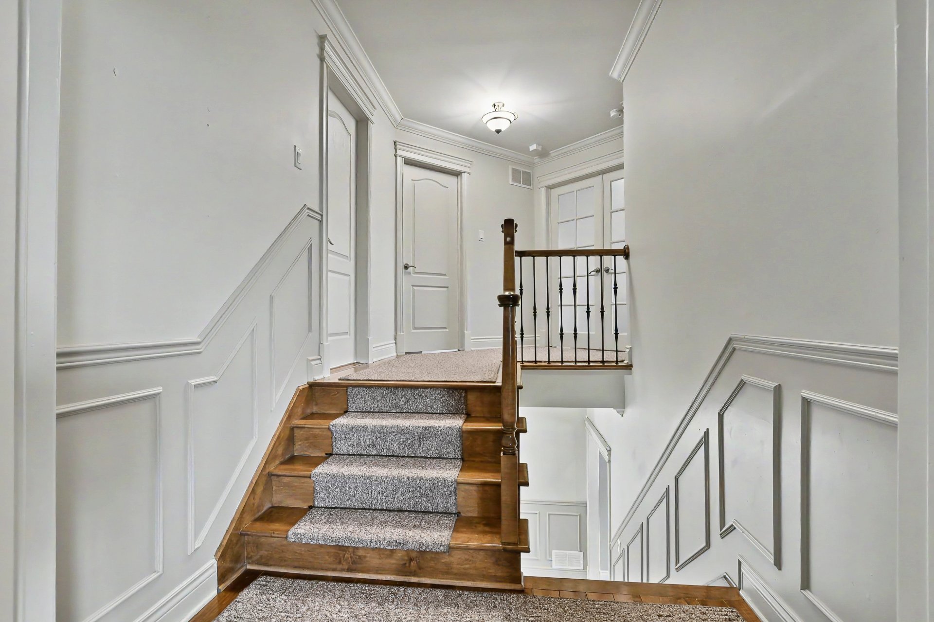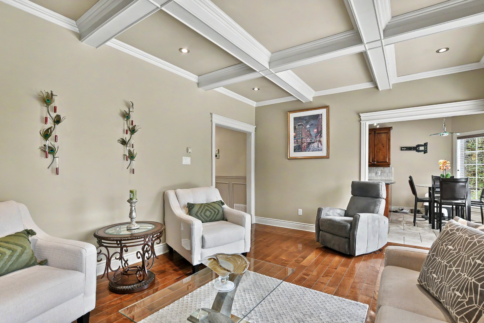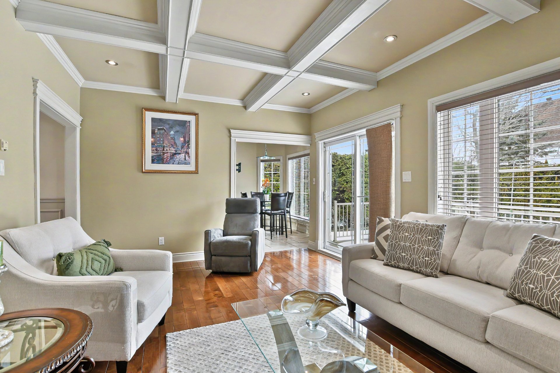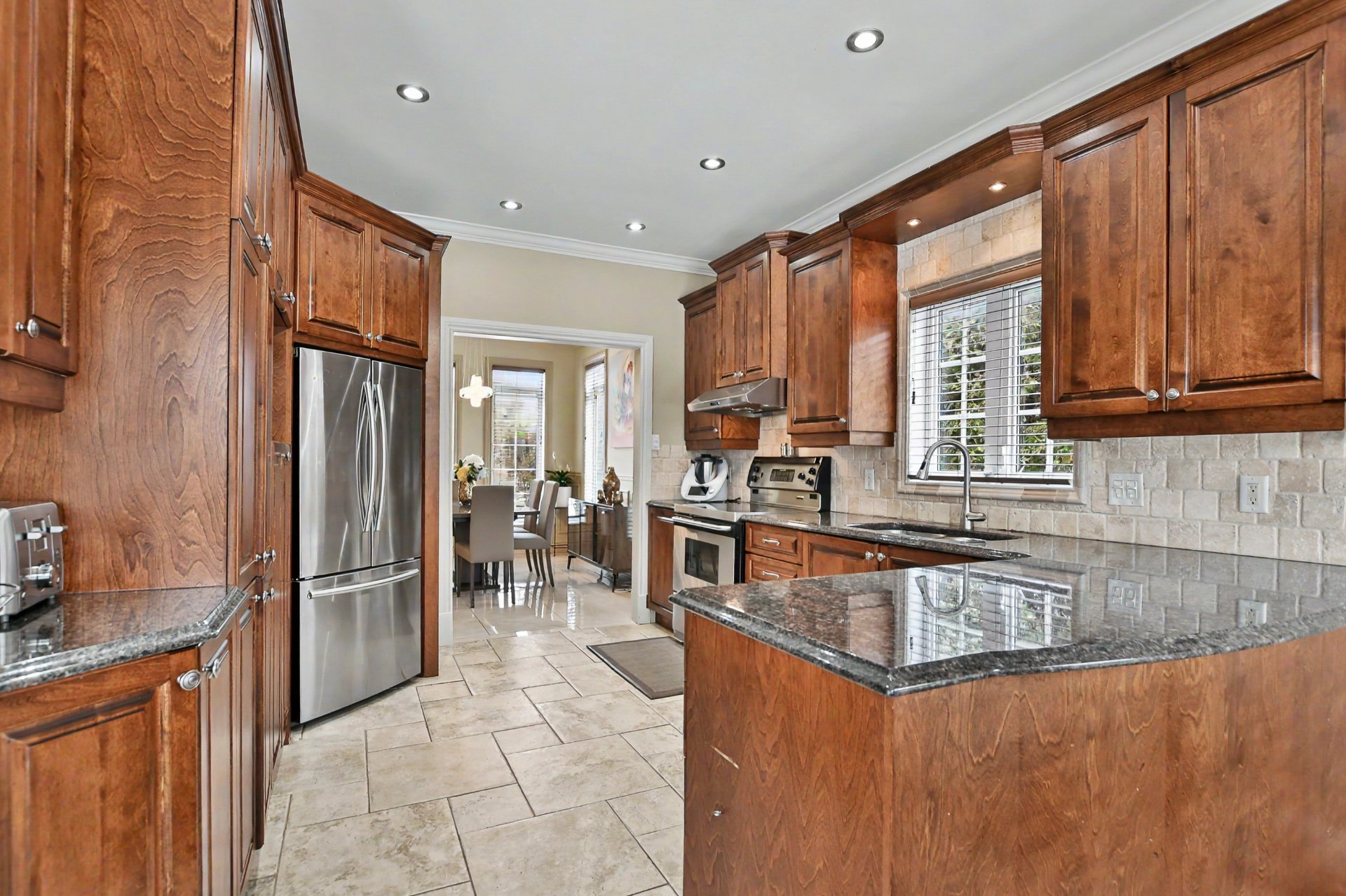La cuisine propose de riches armoires de bois, des comptoirs de granit et une céramique au goût du jour, ouverte sur une salle à manger lumineuse. Le salon se distingue par son plafond à caissons et son foyer au gaz, créant une atmosphère chaleureuse et sophistiquée. Une salle d'eau rénovée avec espace laveuse-sécheuse complète ce niveau.