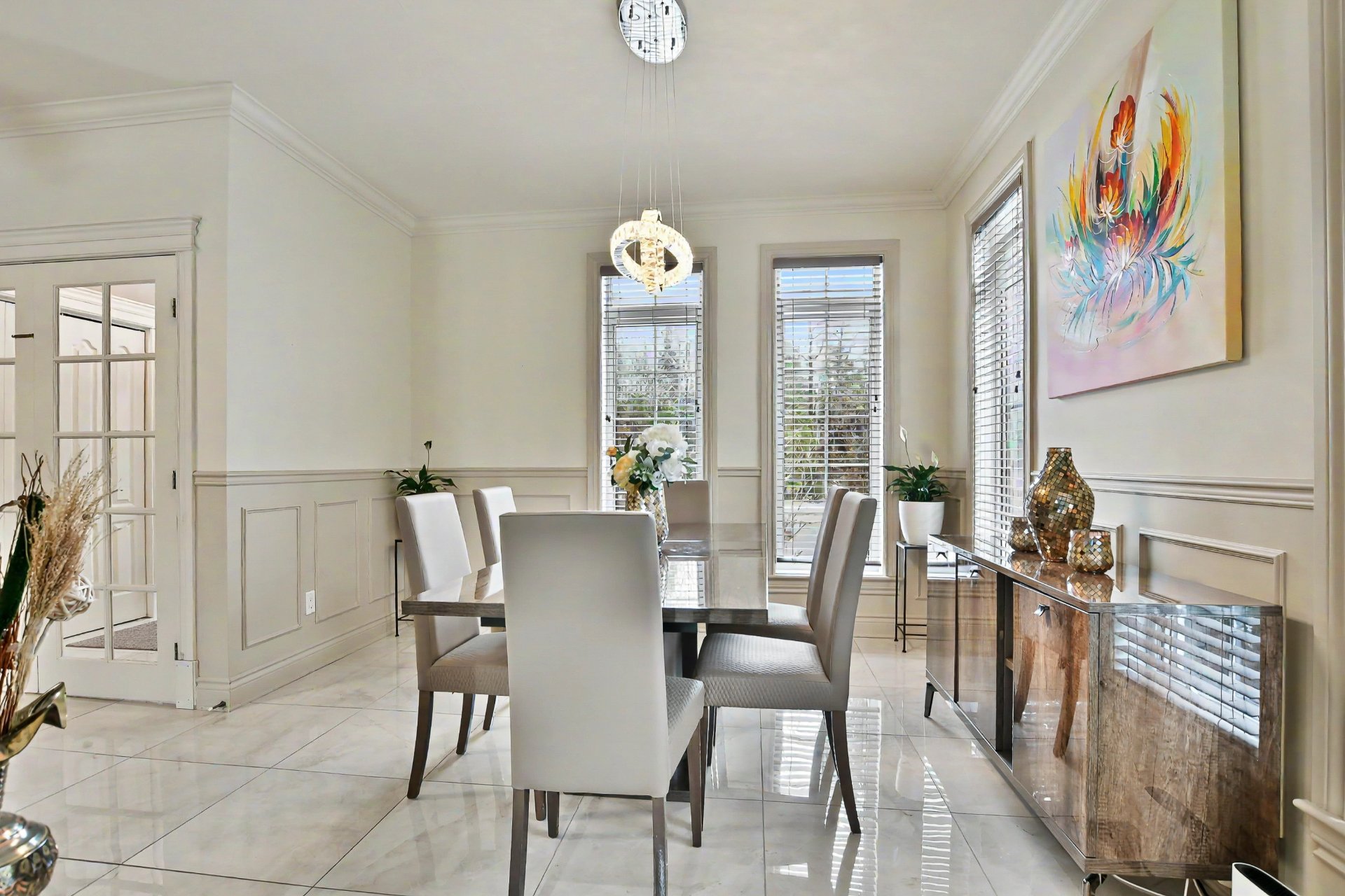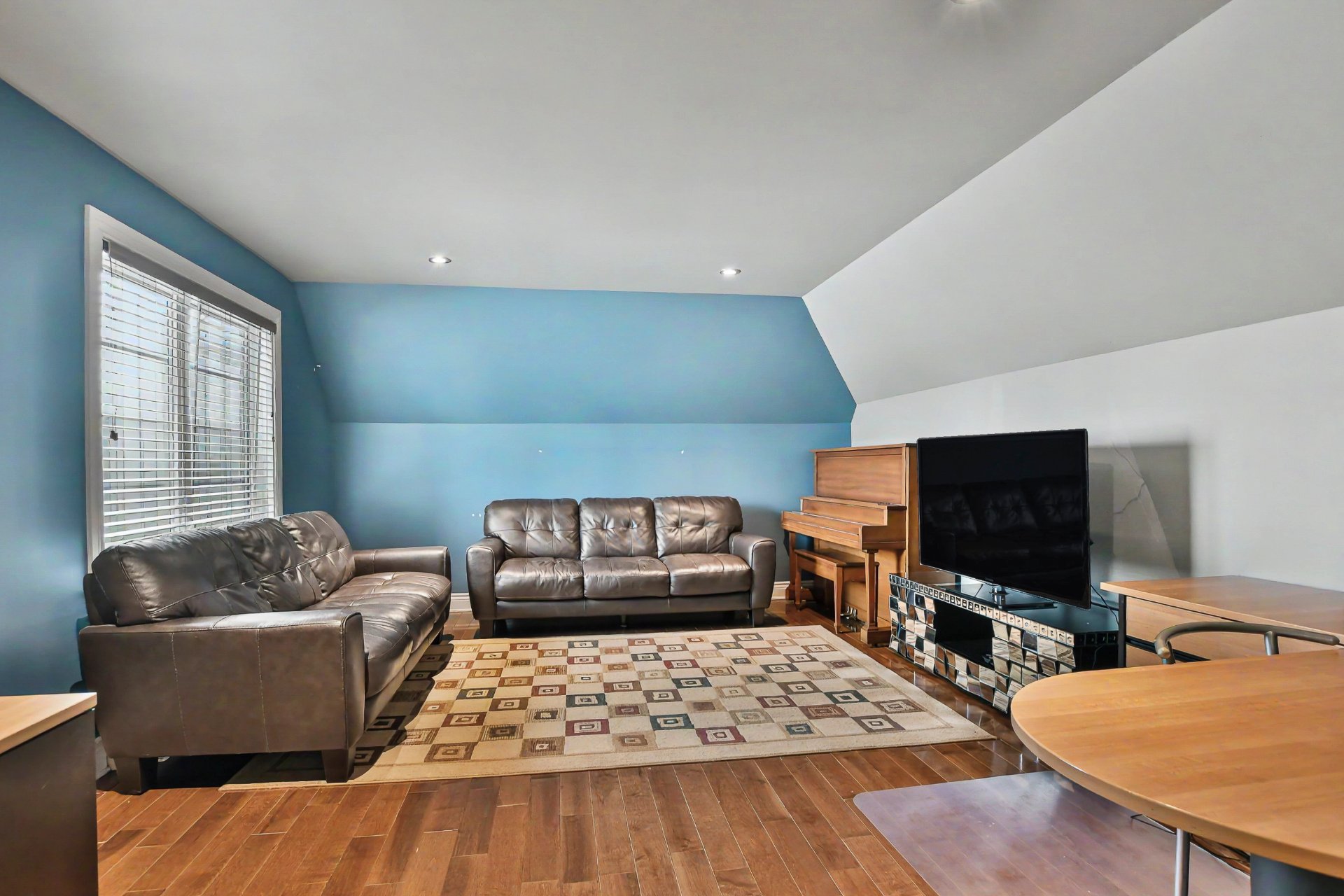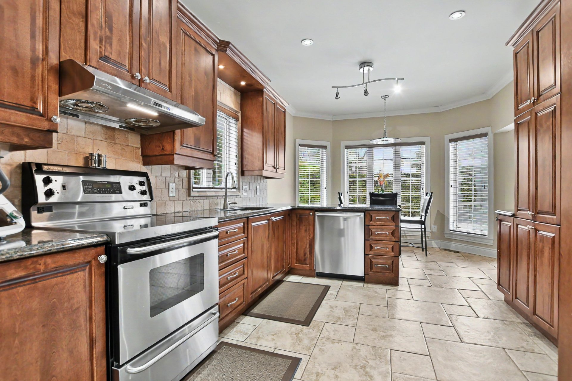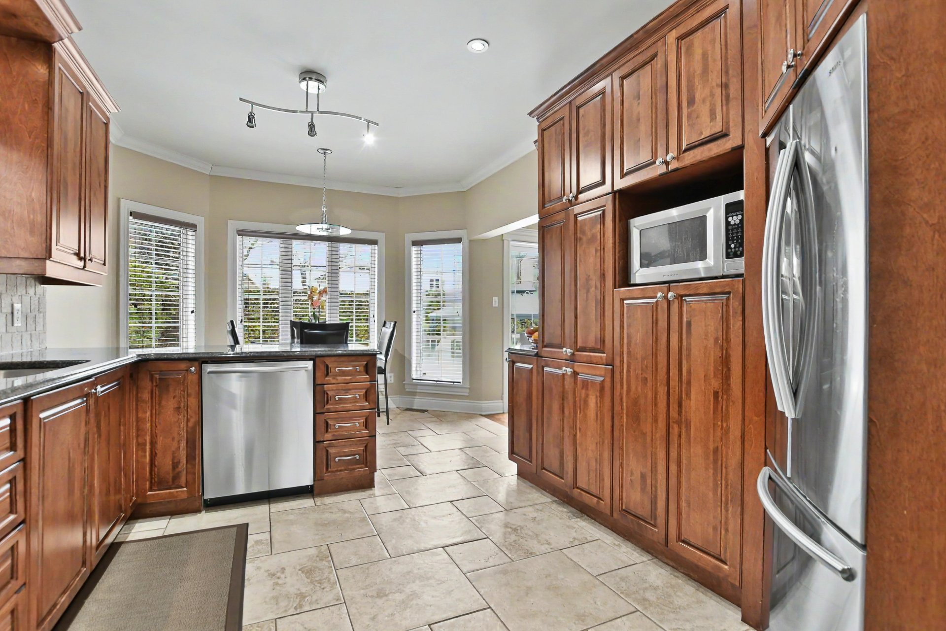 La cuisine propose de riches armoires de bois, des comptoirs de granit et une céramique au goût du jour, ouverte sur une salle à manger lumineuse. Le salon se distingue par son plafond à caissons et son foyer au gaz, créant une atmosphère chaleureuse et sophistiquée. Une salle d'eau rénovée avec espace laveuse-sécheuse complète ce niveau.