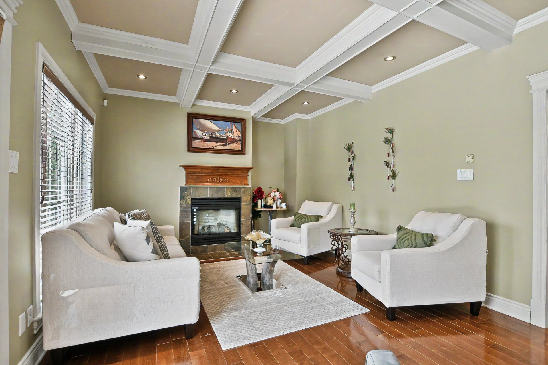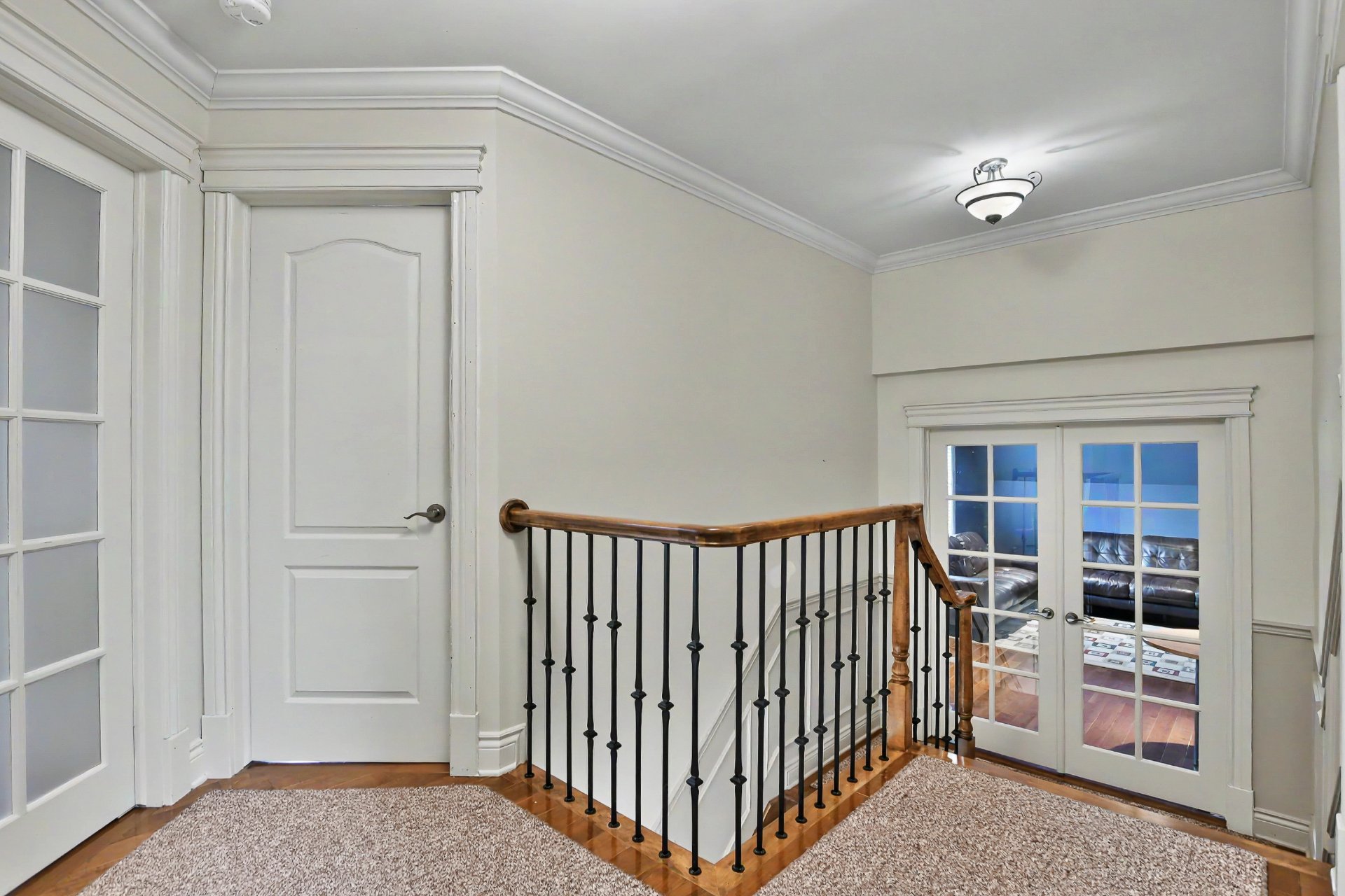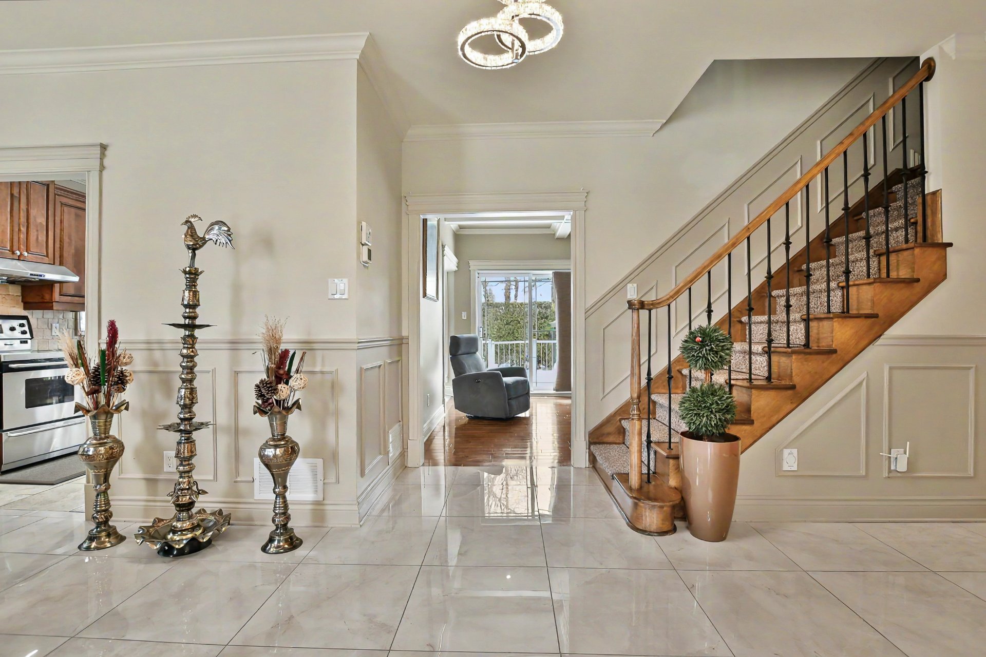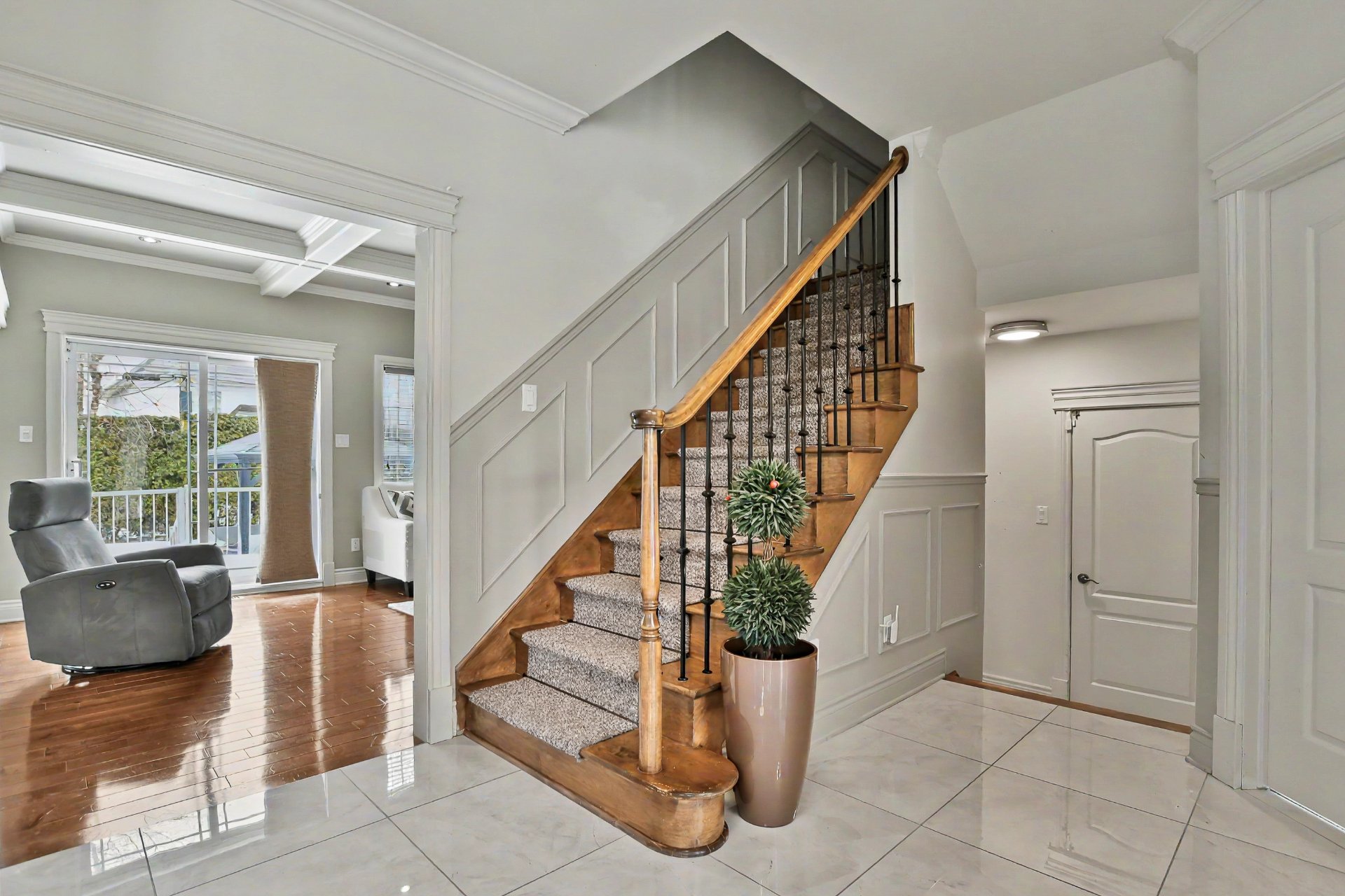La cuisine propose de riches armoires de bois, des comptoirs de granit et une céramique au goût du jour, ouverte sur une salle à manger lumineuse. Le salon se distingue par son plafond à caissons et son foyer au gaz, créant une atmosphère chaleureuse et sophistiquée. Une salle d'eau rénovée avec espace laveuse-sécheuse complète ce niveau.