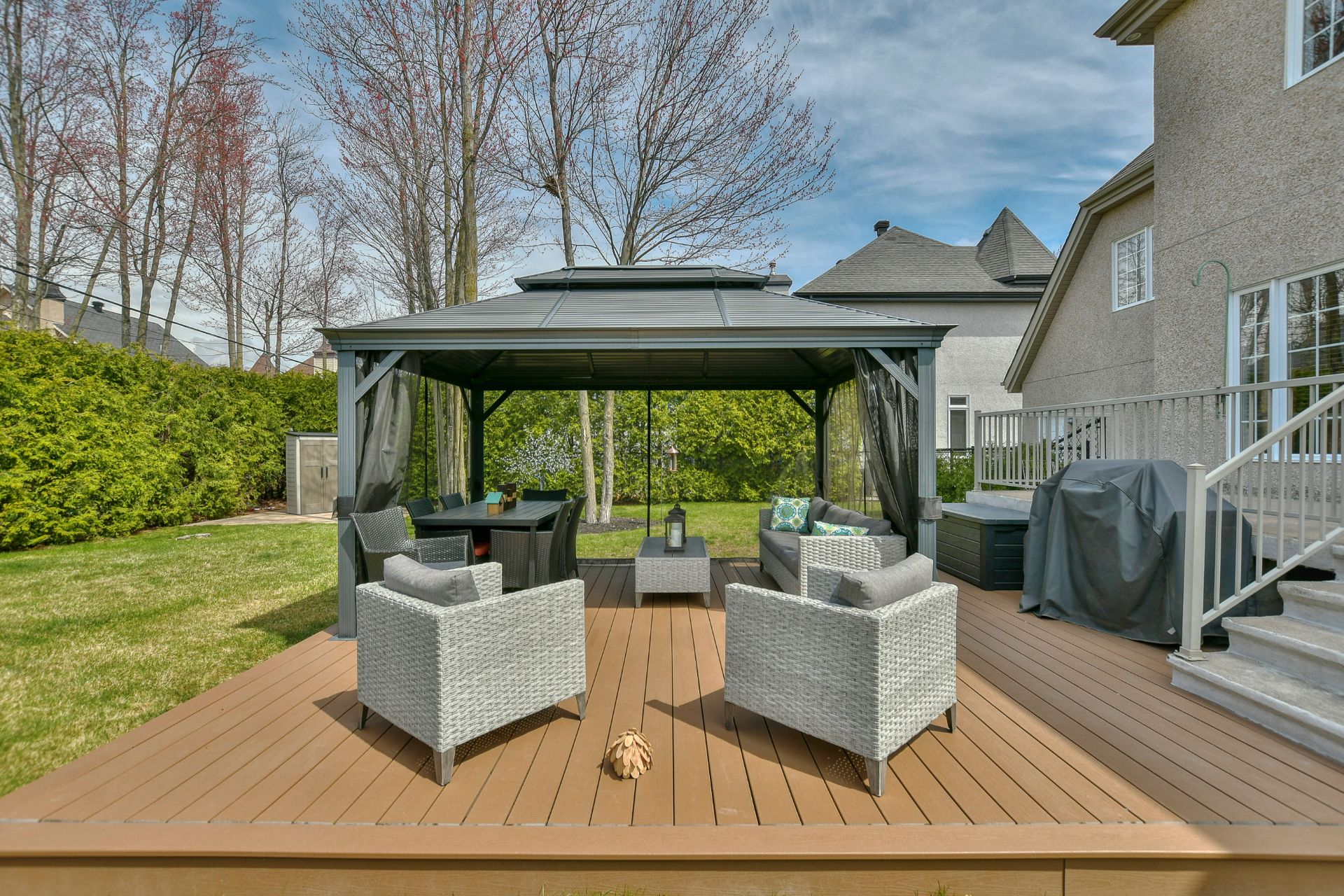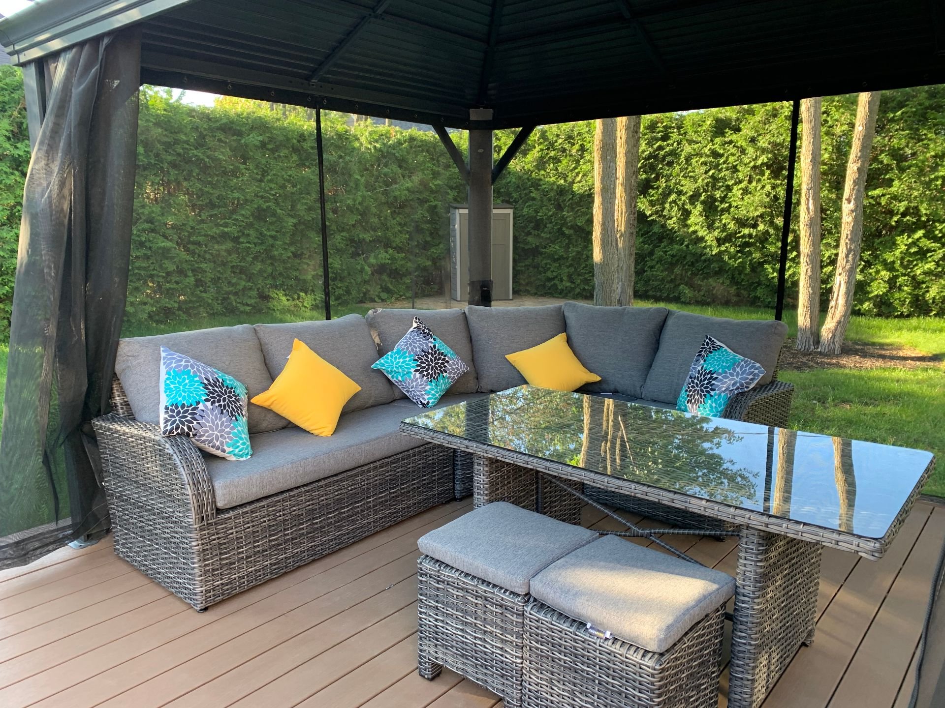 Le gazebo et le patio offrent un espace parfait pour profiter pleinement de la saison estivale, tandis que l'éclairage extérieur Illumidel transforme les lieux en une ambiance élégante et chaleureuse en soirée.