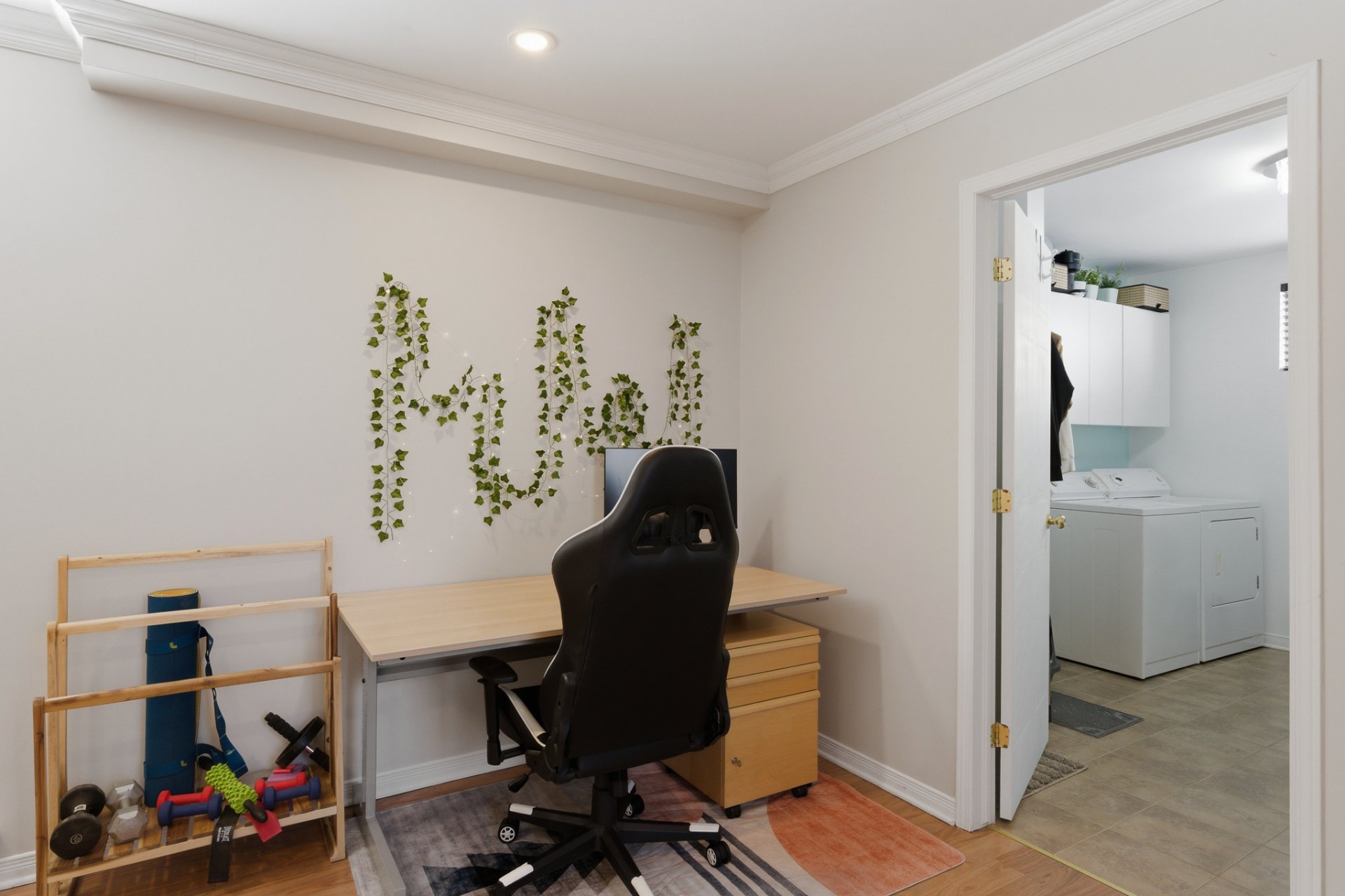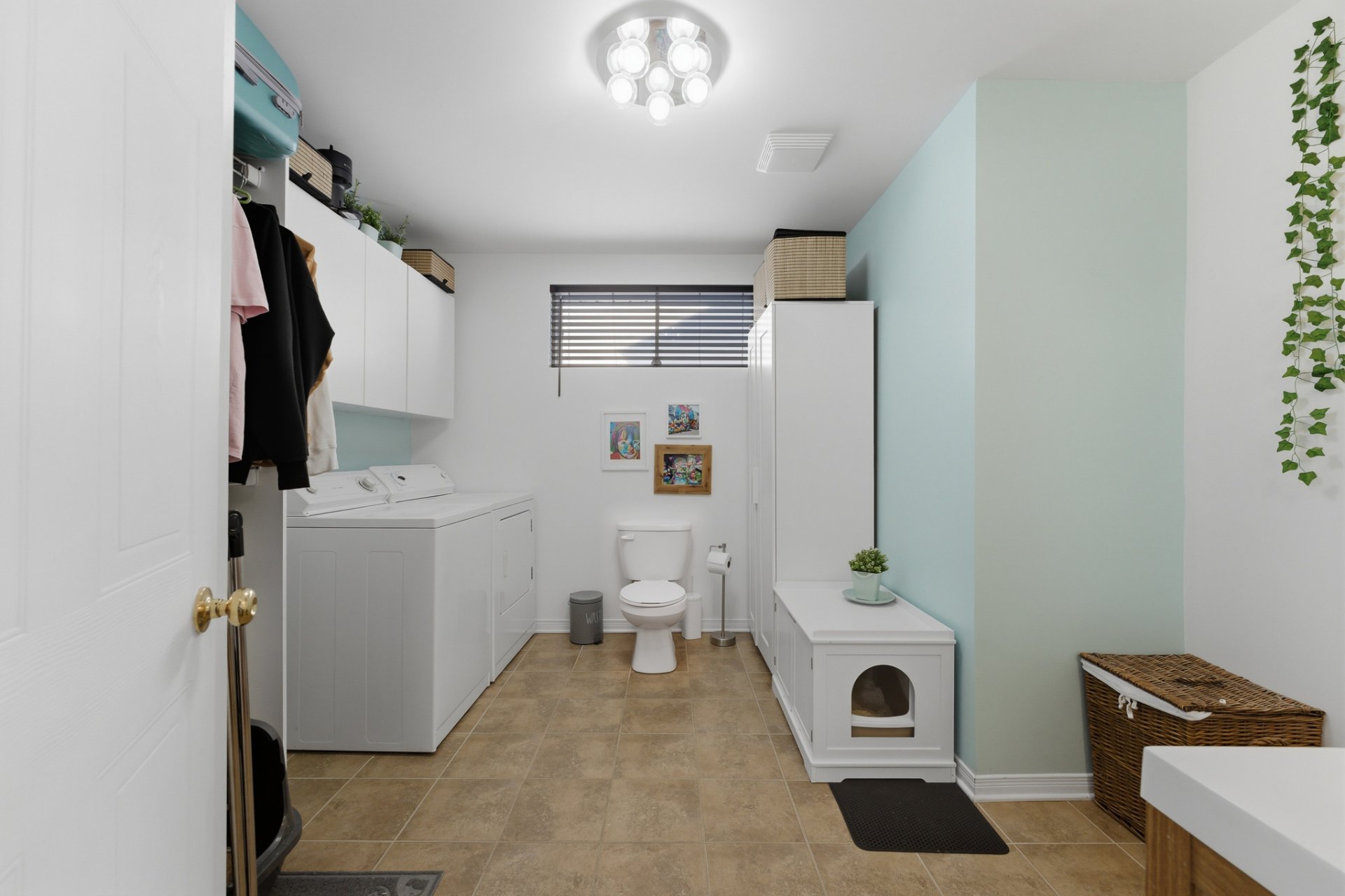 - Espace buanderie avec armoires de rangement.