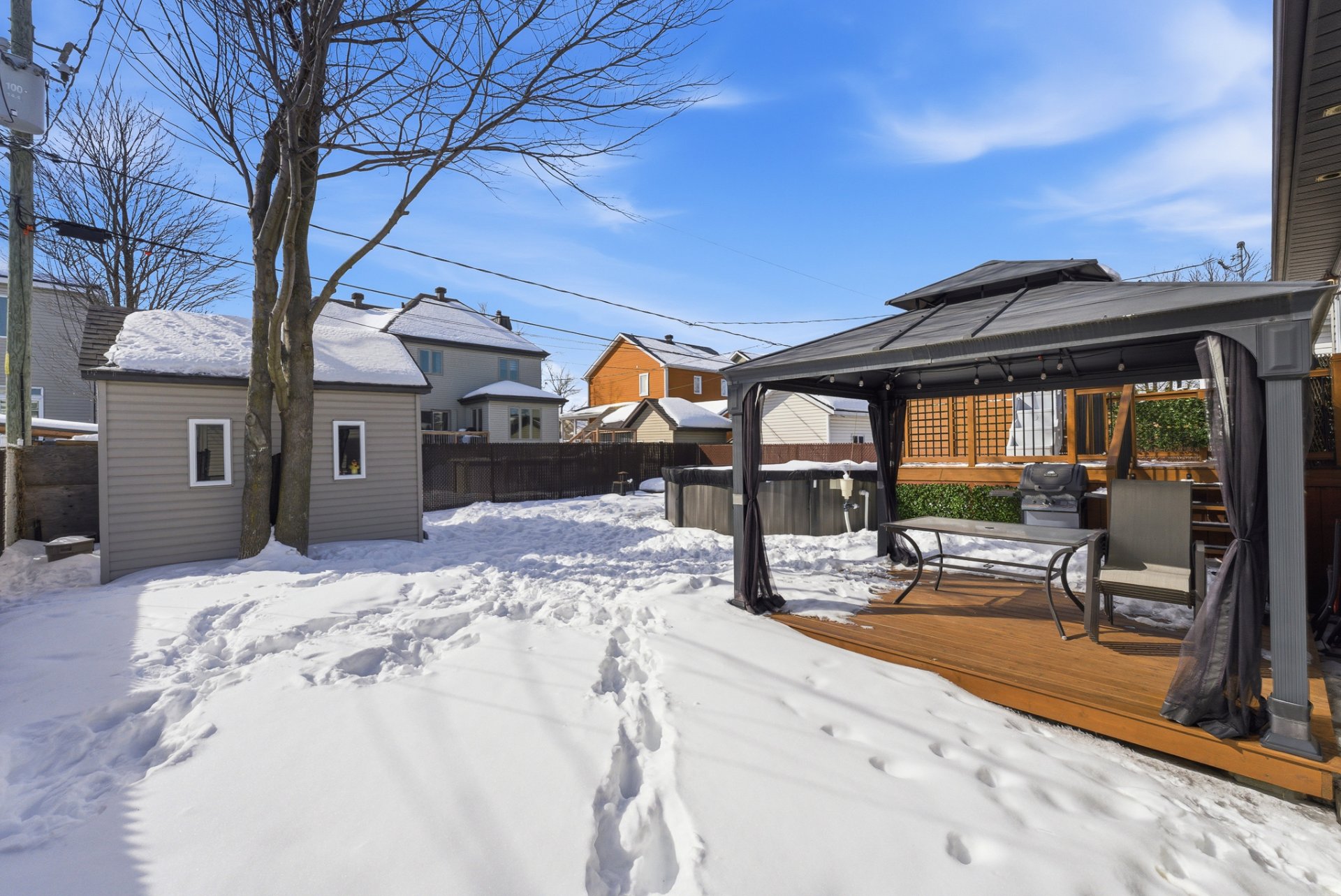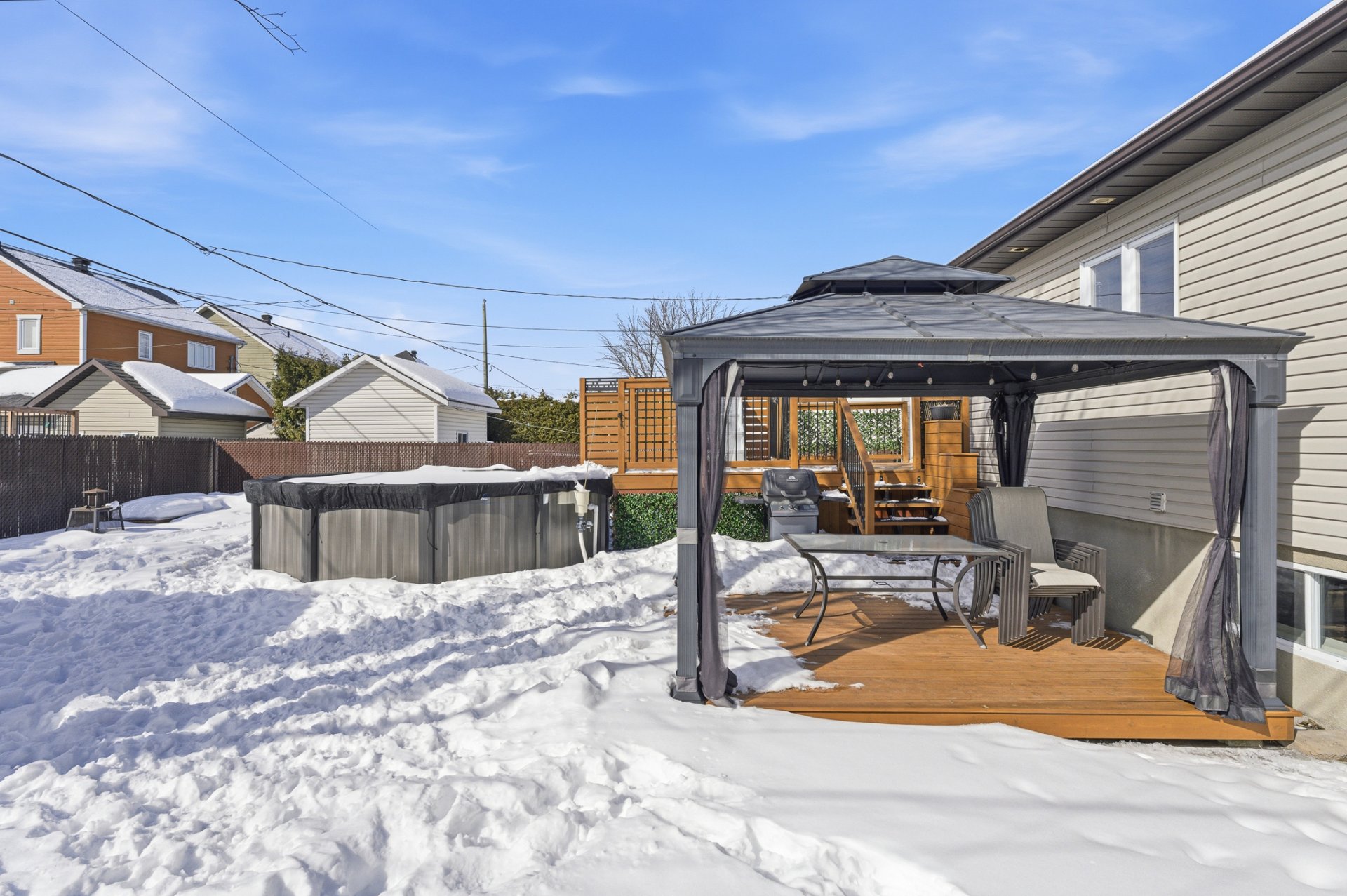 - Terrasse en bois avec gazebo, parfaite pour la saison estivale.