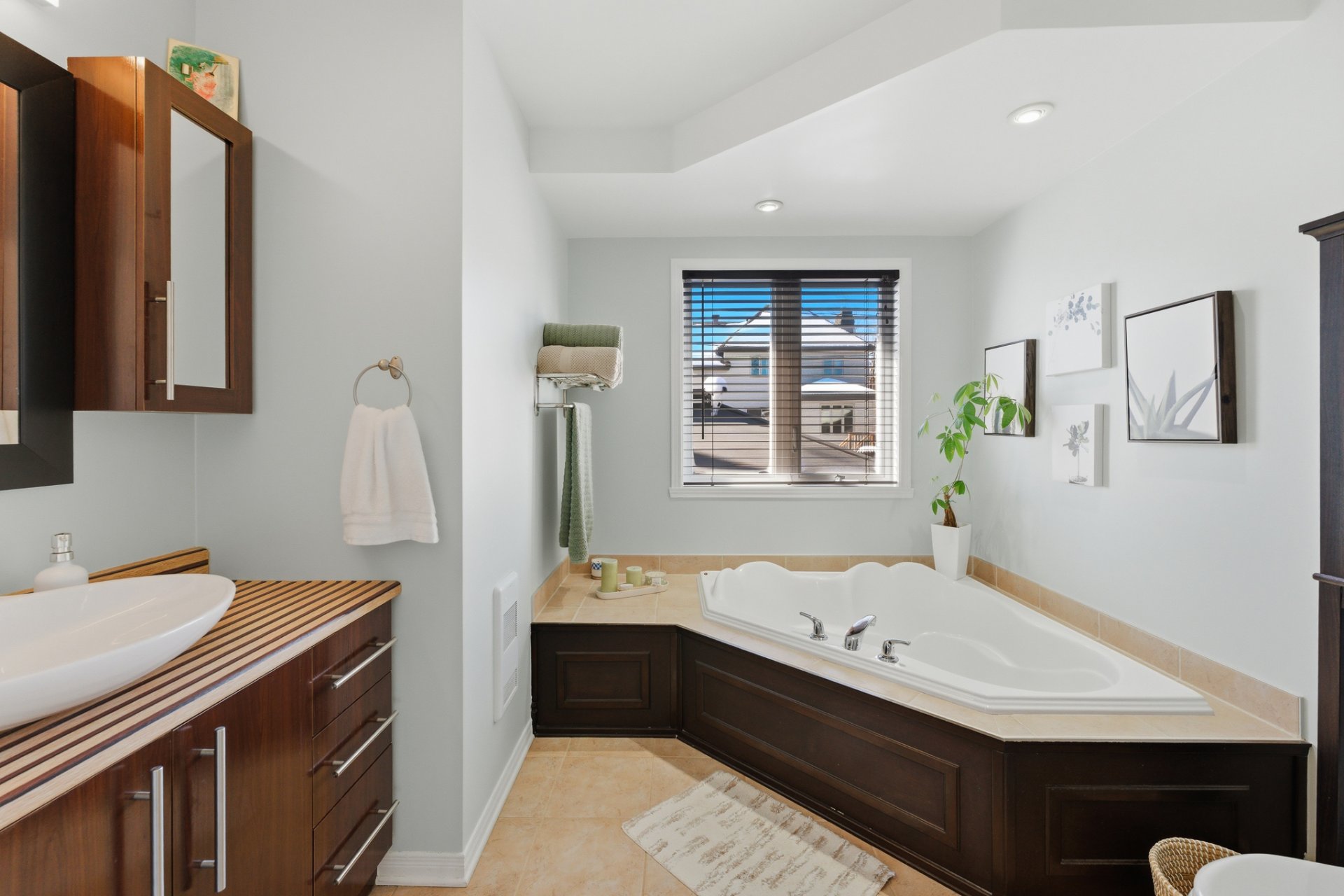 - Salle de bains complète avec bain podium, douche indépendante en coin et grande vanité.