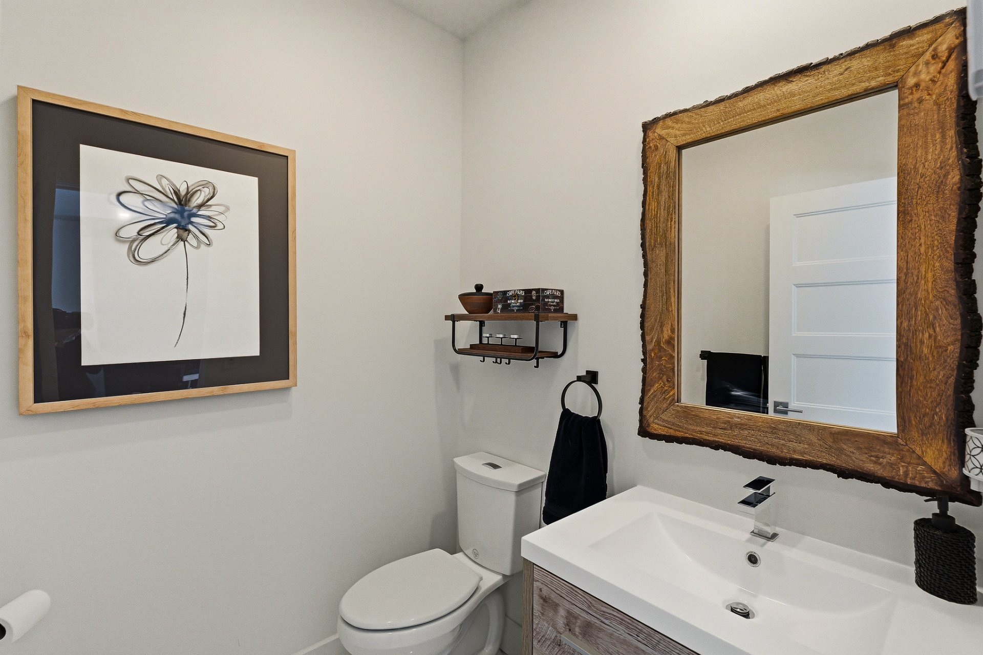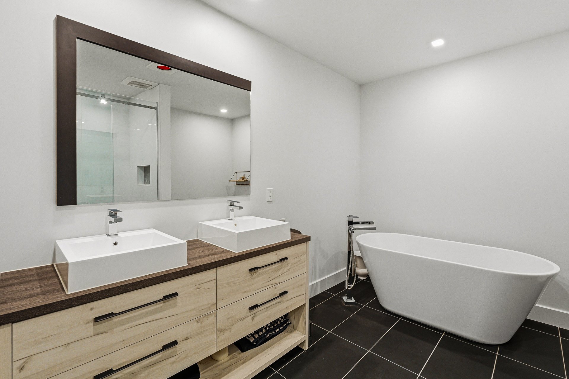 La propriété offre 3 chambres, 3 salles de bains, une salle d'eau ainsi qu'une salle de lavage distincte. À l'étage, deux chambres disposent chacune de leur propre salle de bains attenante, munies de planchers chauffants, ajoutant une touche de confort et de luxe. La salle de bain principale se démarque par son bain autoportant moderne.