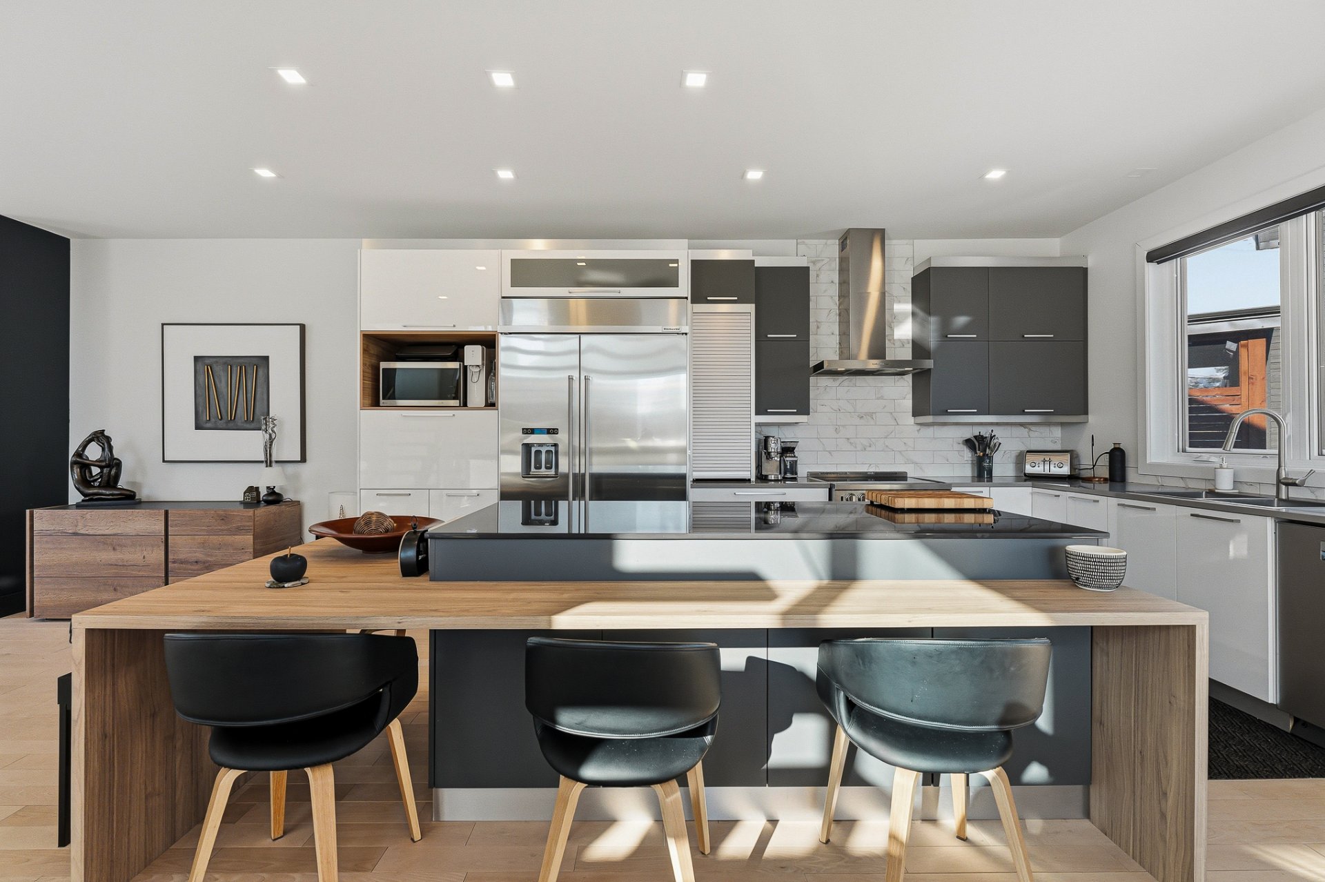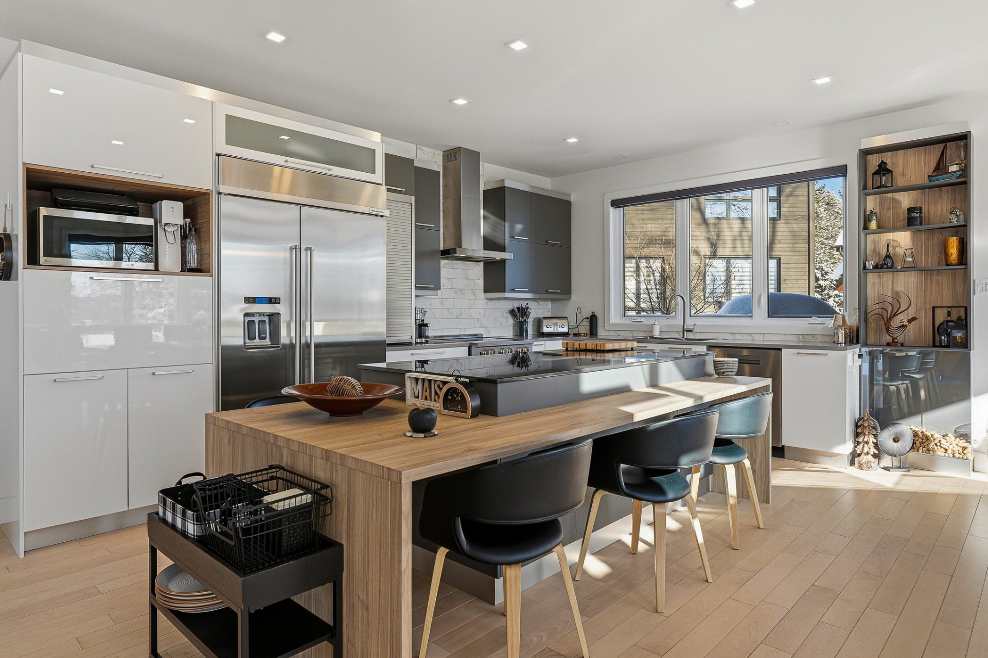 La cuisine agrandie, pensée pour les amateurs de design et de fonctionnalité, se distingue par son grand îlot central avec comptoir-lunch, ses comptoirs en quartz, ses armoires haut de gamme et ses nombreux rangements intelligents : cellier encastré, coin café, armoire à épices coulissante et étagère murale décorative. Les électroménagers haut de gamme, dont un réfrigérateur pleine hauteur avec distributeur de glace, complètent parfaitement cet espace, sans oublier l'évier double avec broyeur.