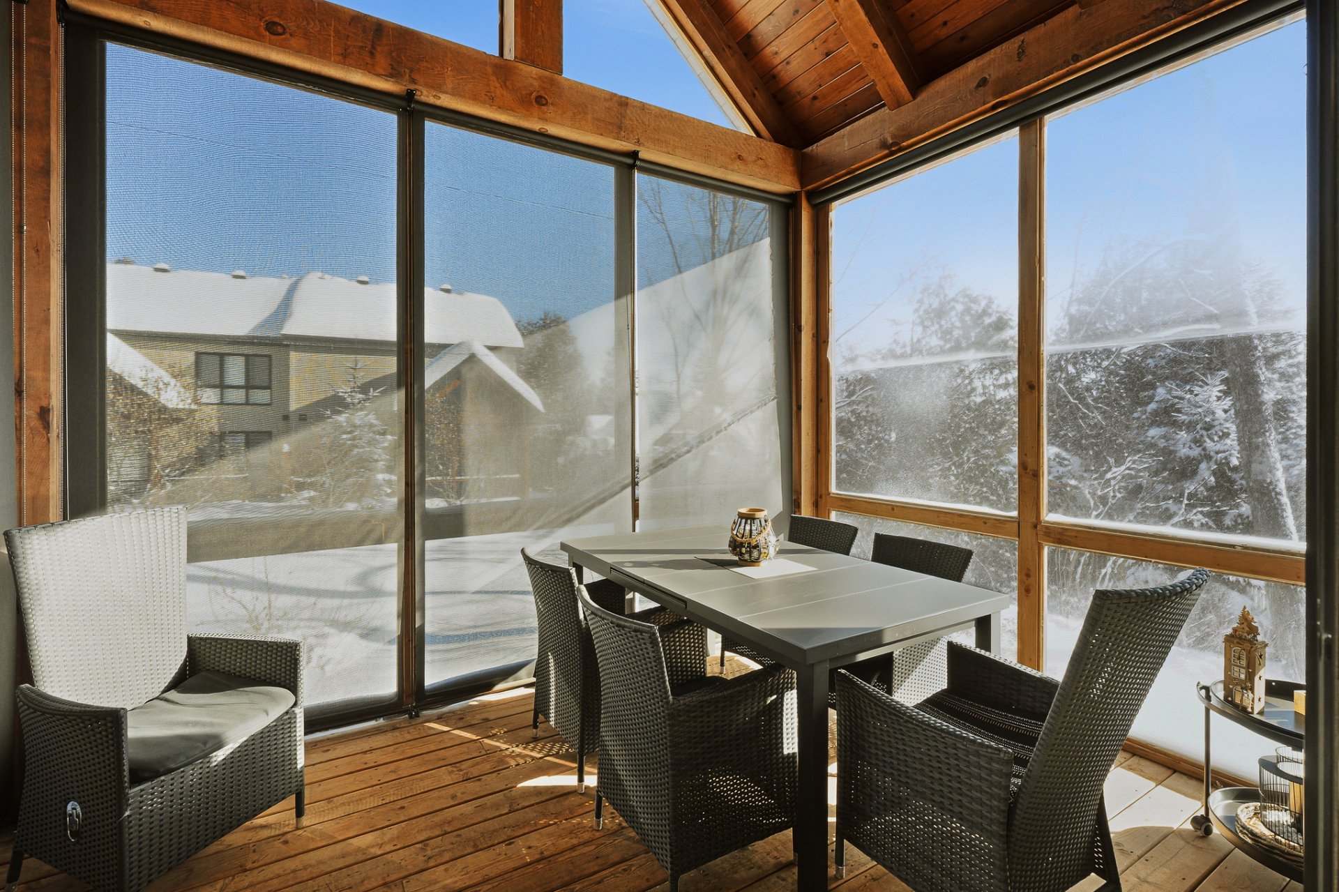 À l'extérieur, la terrasse couverte avec moustiquaires devient un véritable prolongement de l'espace de vie. Équipée de toiles rétractables sur trois côtés, elle permet un contrôle optimal du soleil, du vent et de l'intimité, en plus d'un chauffage infrarouge intégré, idéale pour profiter de l'espace en toute saison. L'environnement extérieur est intime et soigneusement protégé des regards.