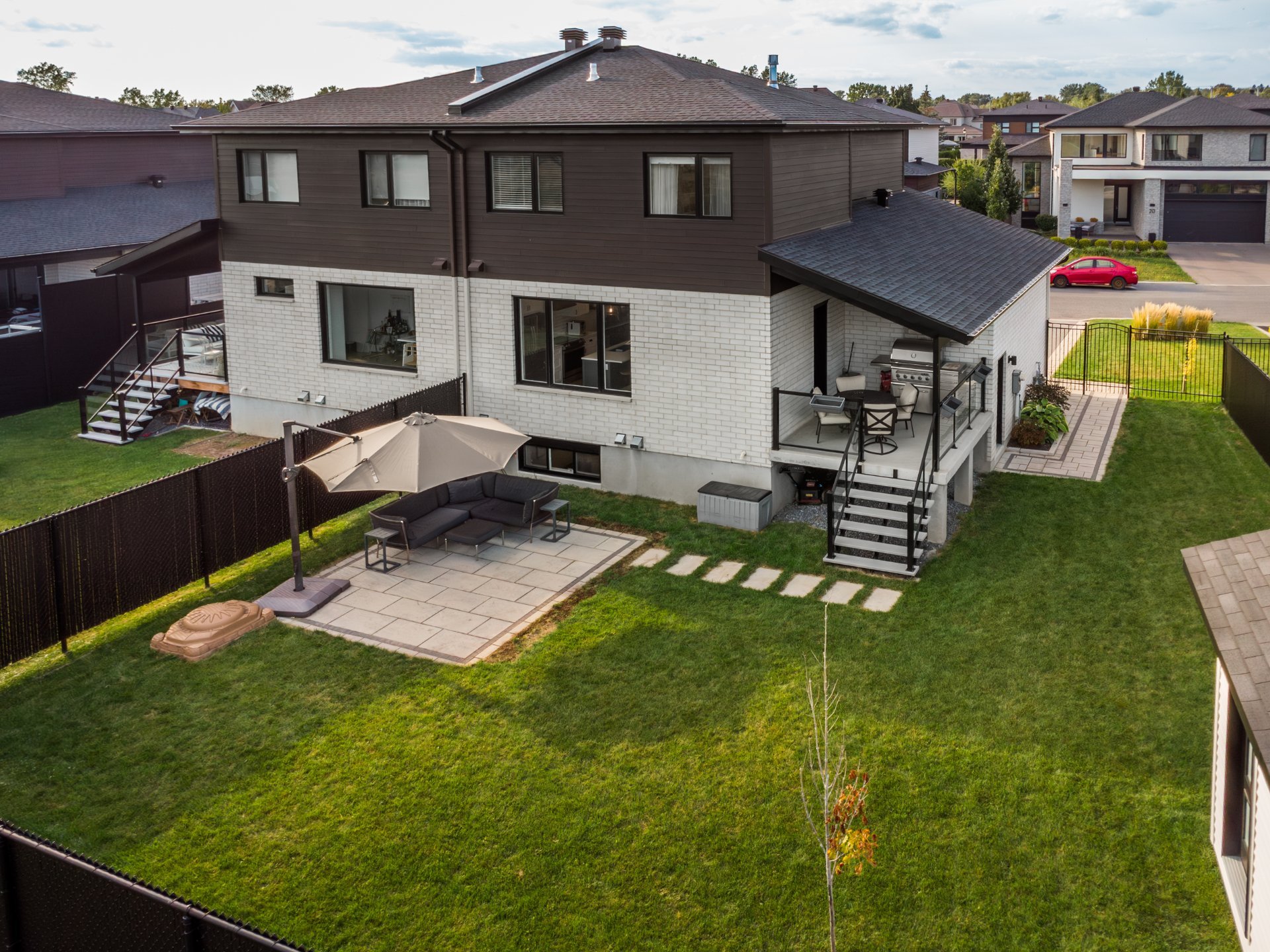 Profitez d'une grande cour sans voisin arrière, offrant intimité et vue sur un vaste parc. Deux terrasses distinctes et un cabanon complètent l'aménagement.