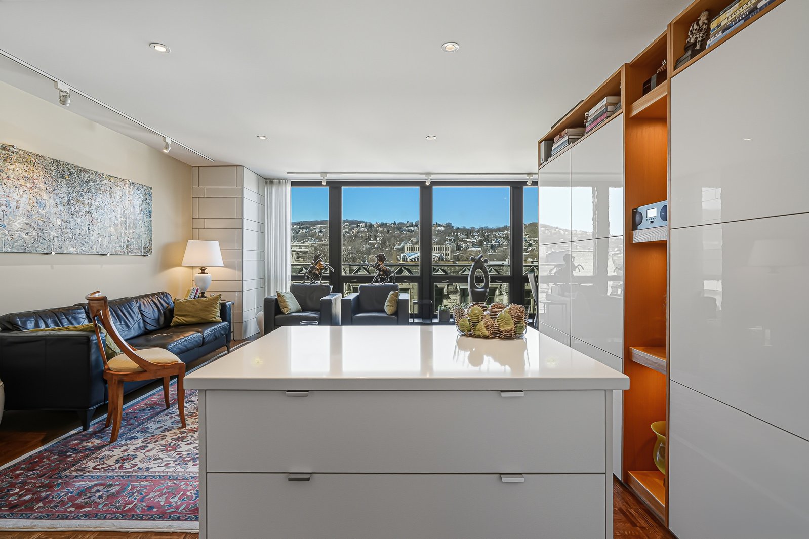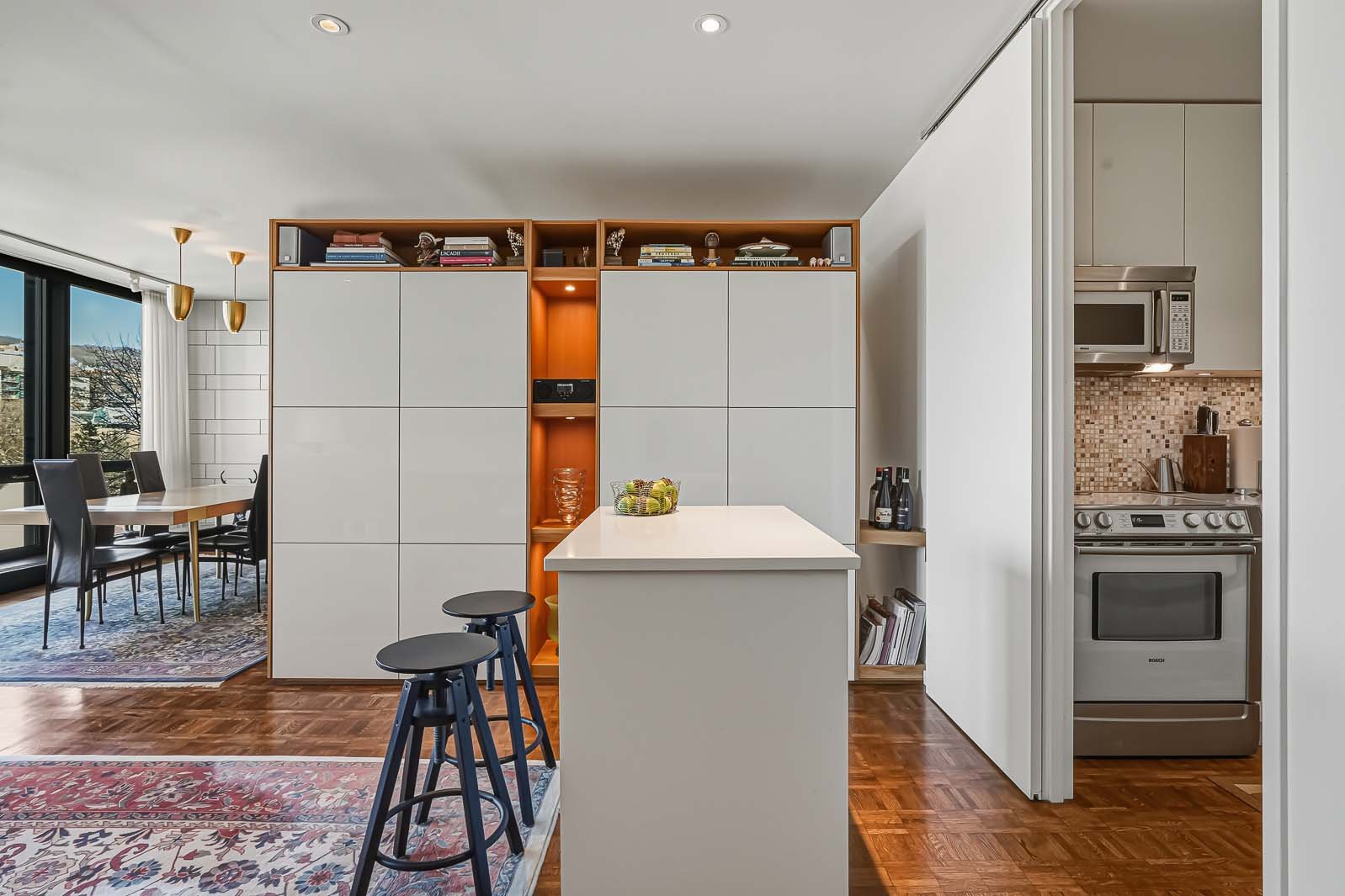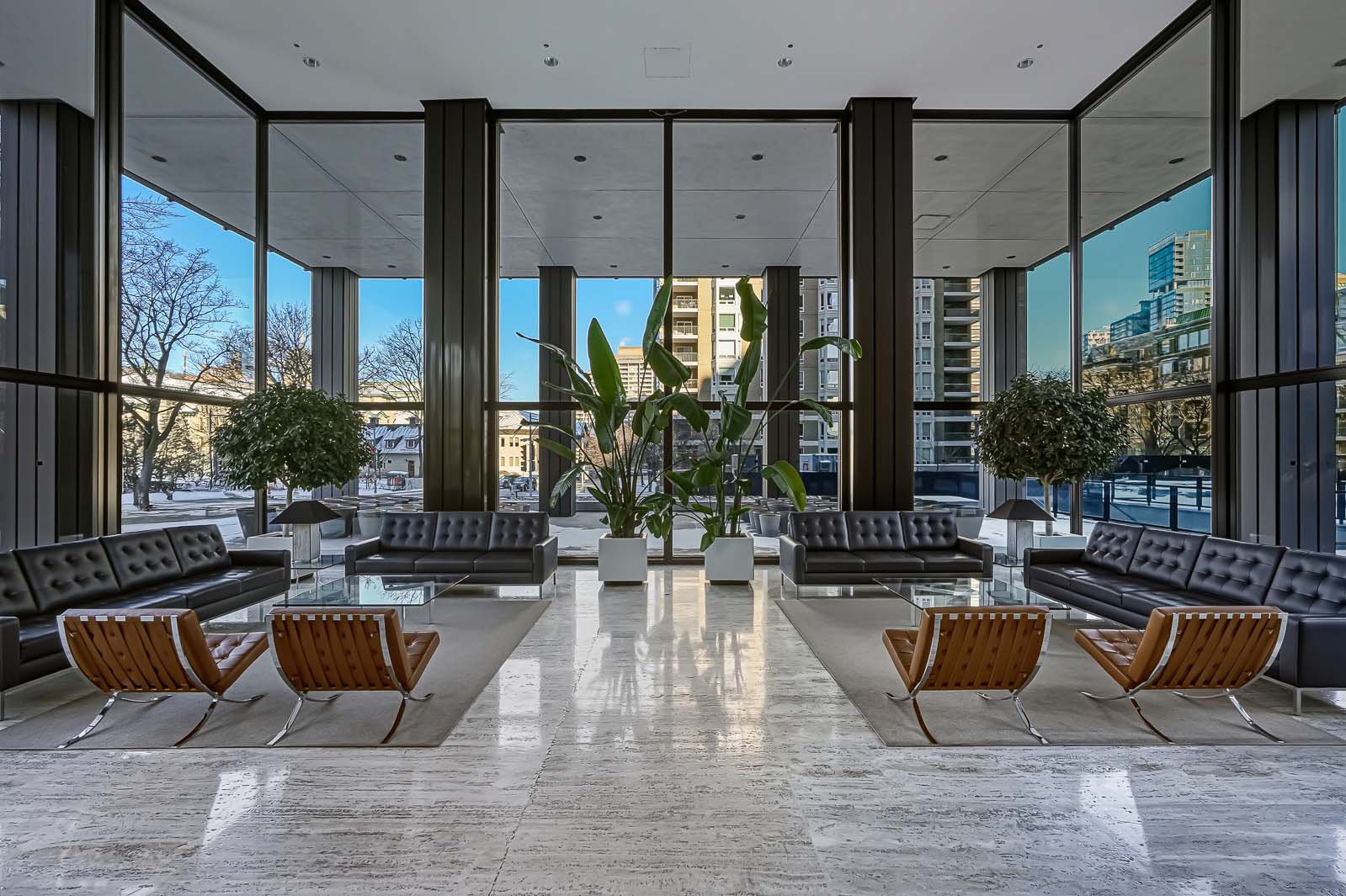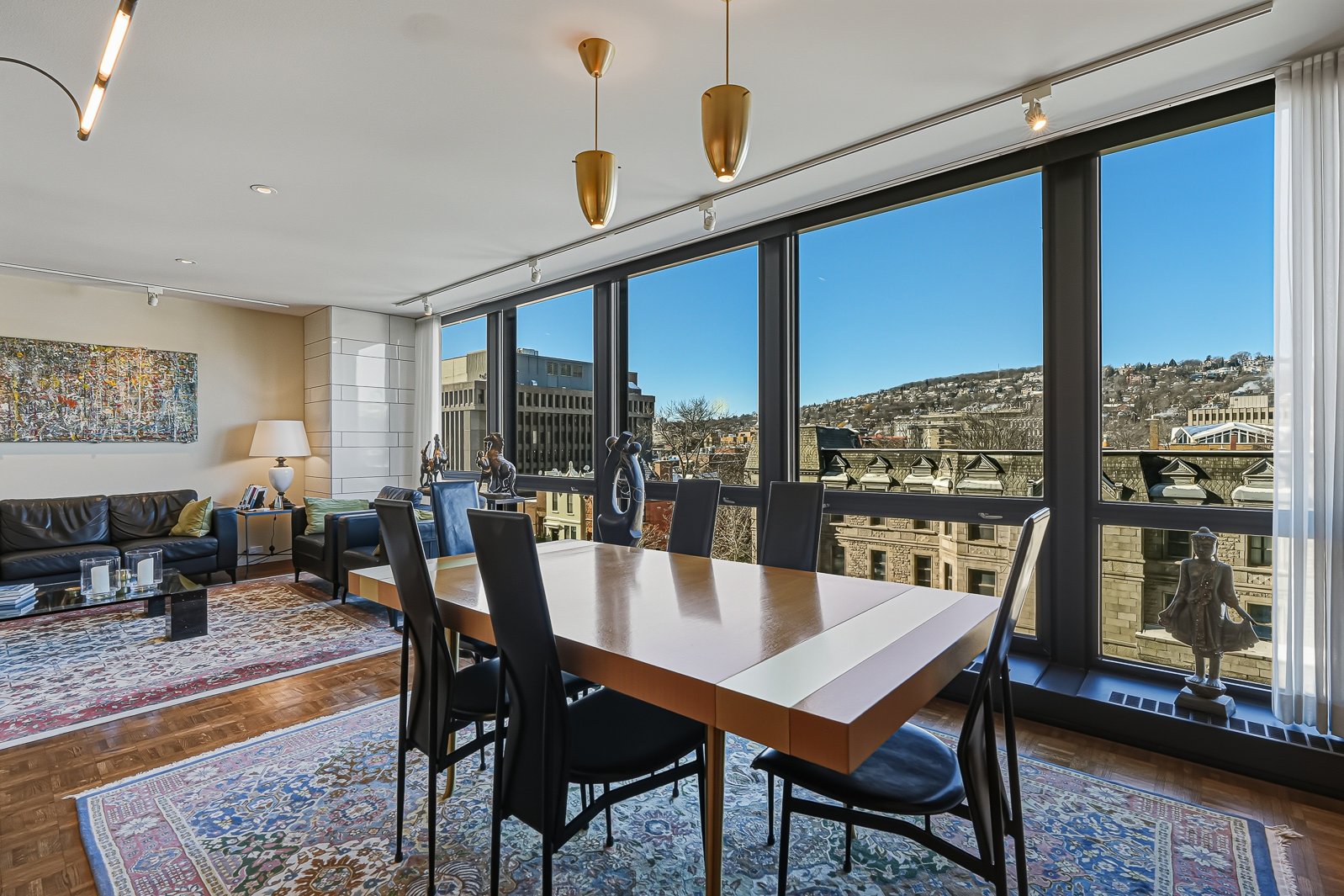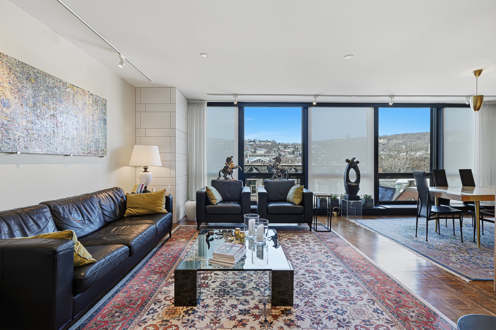 Westmount Square, immeuble iconique signé par le maître de l'architecture moderne Mies van der Rohe. Cette unité a été entièrement reconfigurée afin de mettre en valeur la vue spectaculaire et très recherchée sur le mont Royal, tout en optimisant la pièce de vie par l'ajout d'un espace salle à manger pouvant accueillir six convives -- absent du plan original. La rénovation respecte les principes du Bauhaus : lignes pures, formes sobres et matériaux nobles tels que le marbre, la laque et le chêne blond intégrés aux rangements et cloisons. Pied-à-terre idéal ou résidence principale, avec rangements généreux, éclairage et stores motorisés.