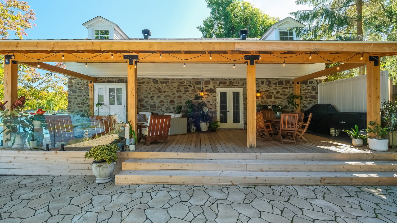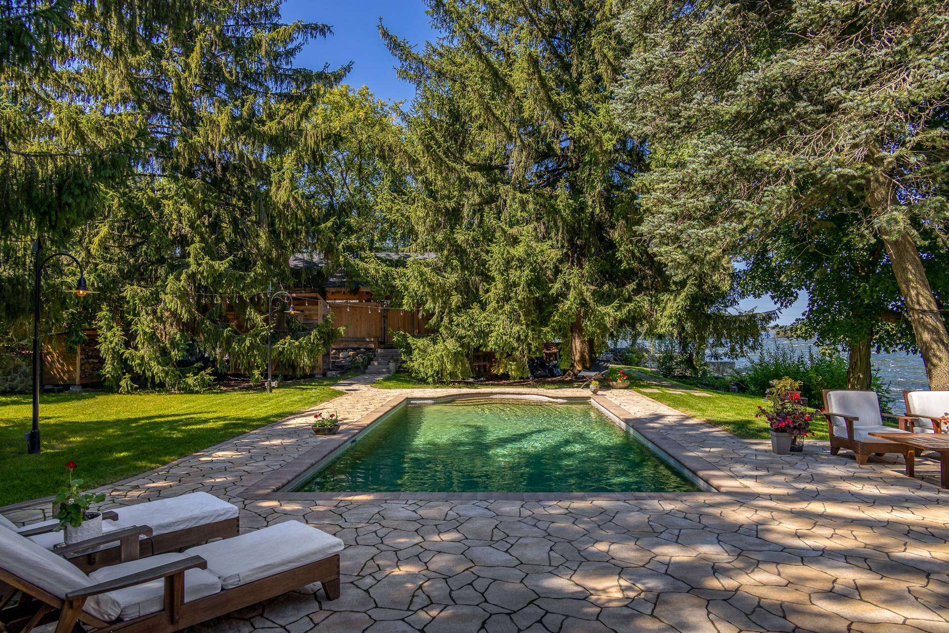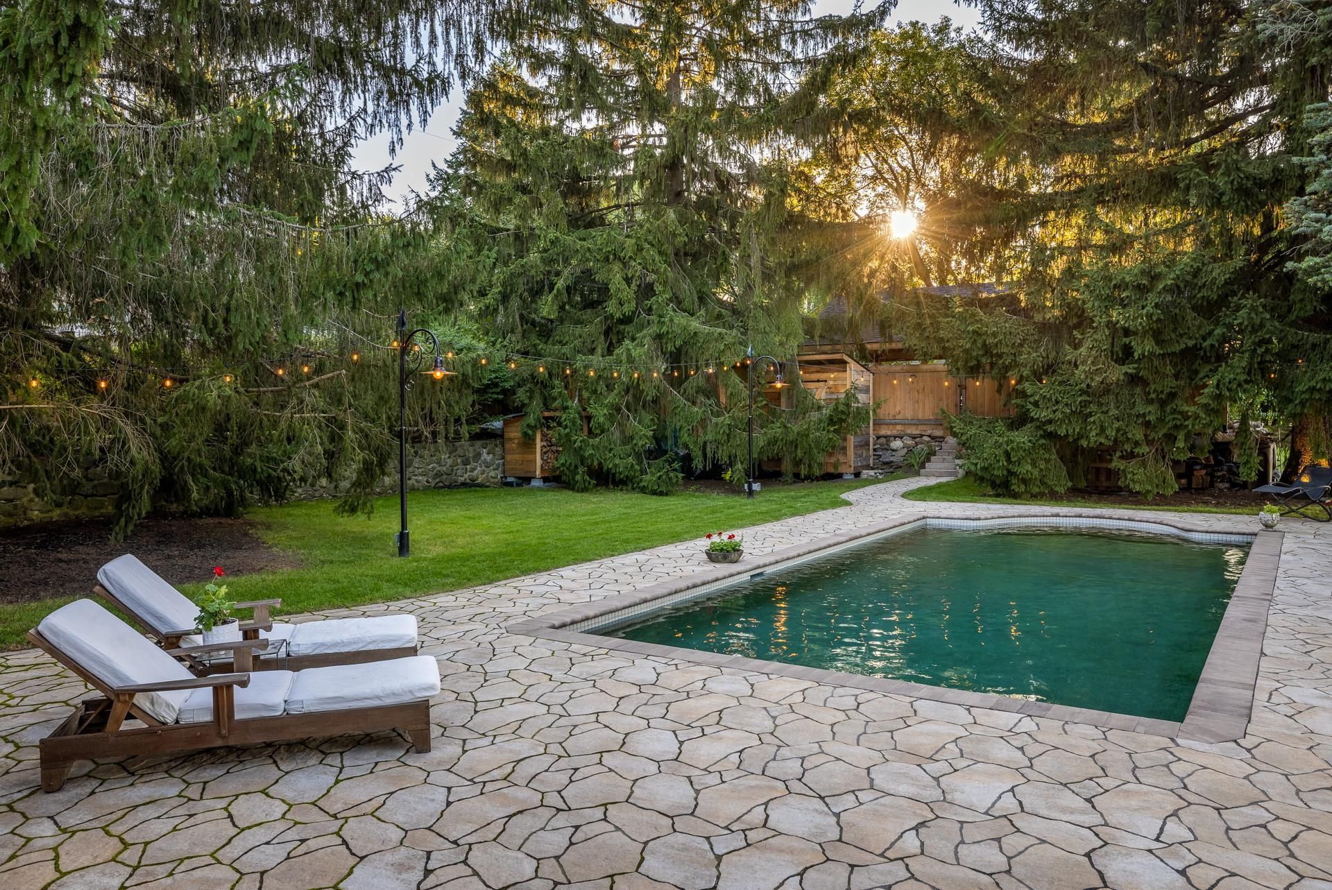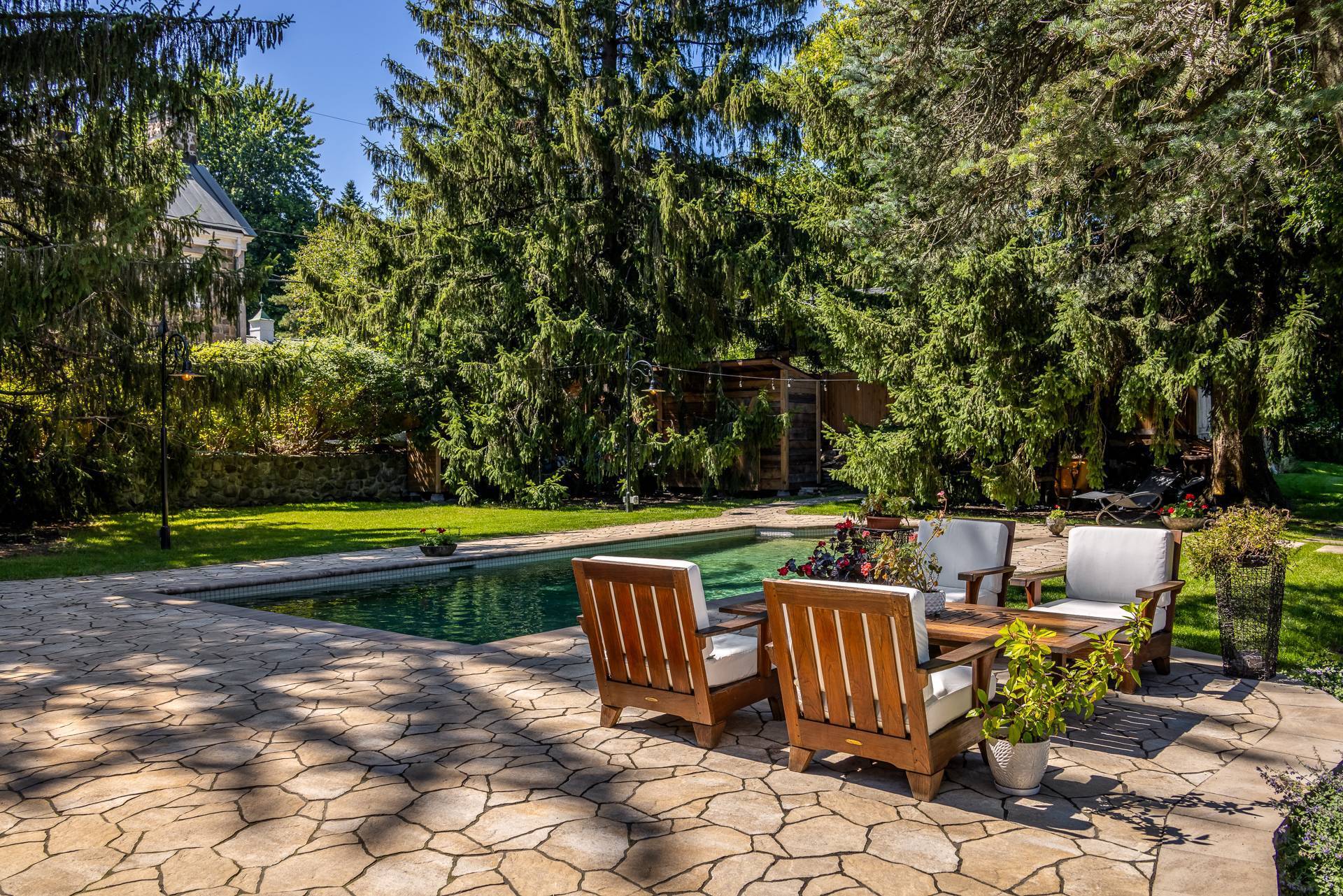 La terrasse, quant à elle, offre une parfaite symbiose entre nature et design réfléchi. Pavée de pierres naturelles aux formes et textures variées, elle crée un effet organique parfaitement intégré au paysage environnant. Bordée d'arbres matures offrant intimité et fraîcheur, elle devient un havre intemporel, à la fois esthétique et apaisant, conçu pour la contemplation et la relaxation.