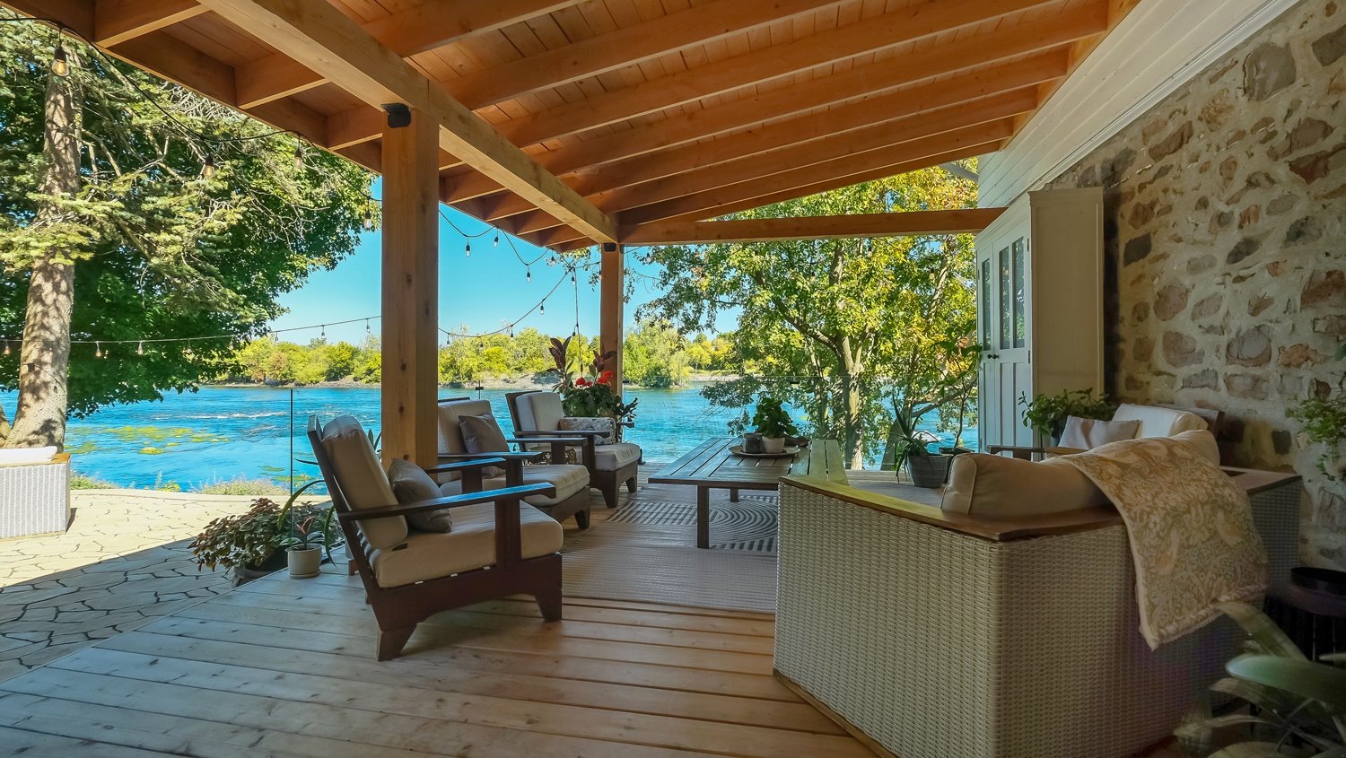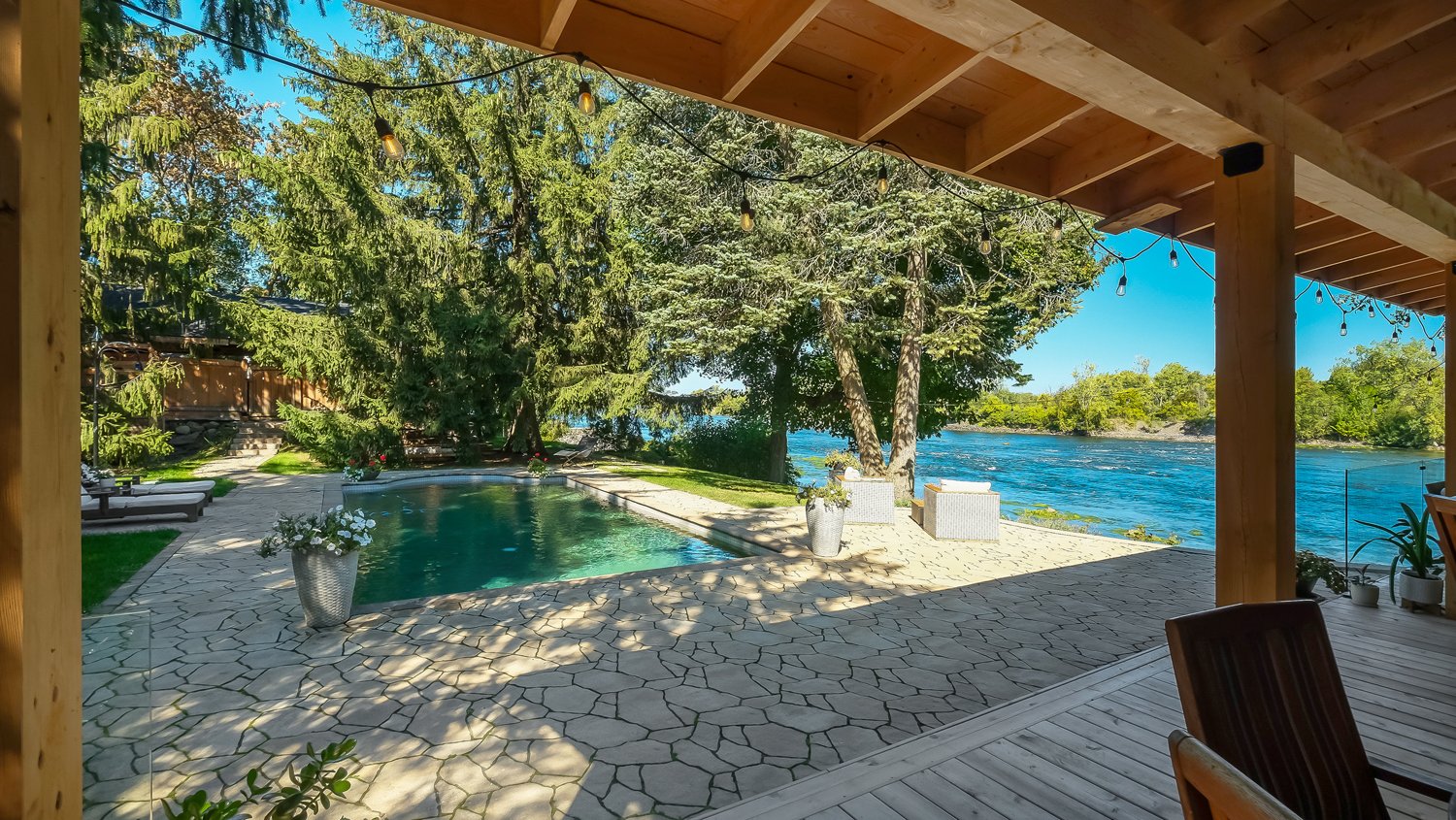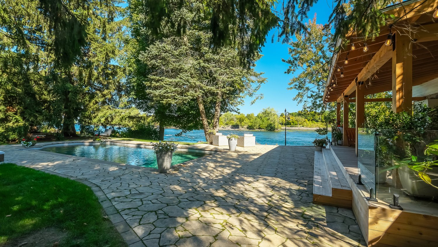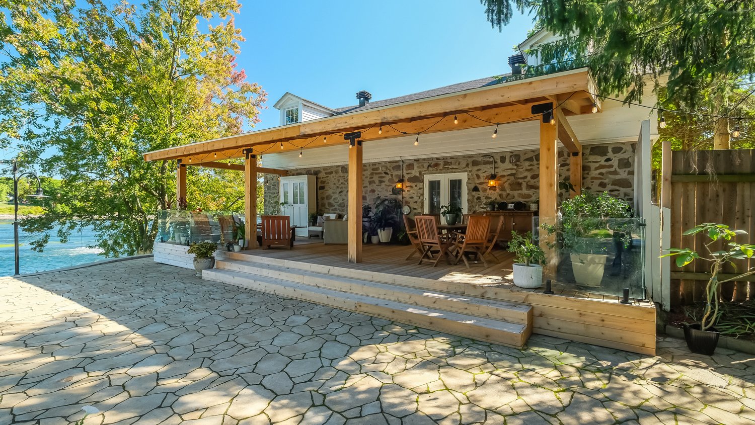 La terrasse, quant à elle, offre une parfaite symbiose entre nature et design réfléchi. Pavée de pierres naturelles aux formes et textures variées, elle crée un effet organique parfaitement intégré au paysage environnant. Bordée d'arbres matures offrant intimité et fraîcheur, elle devient un havre intemporel, à la fois esthétique et apaisant, conçu pour la contemplation et la relaxation.