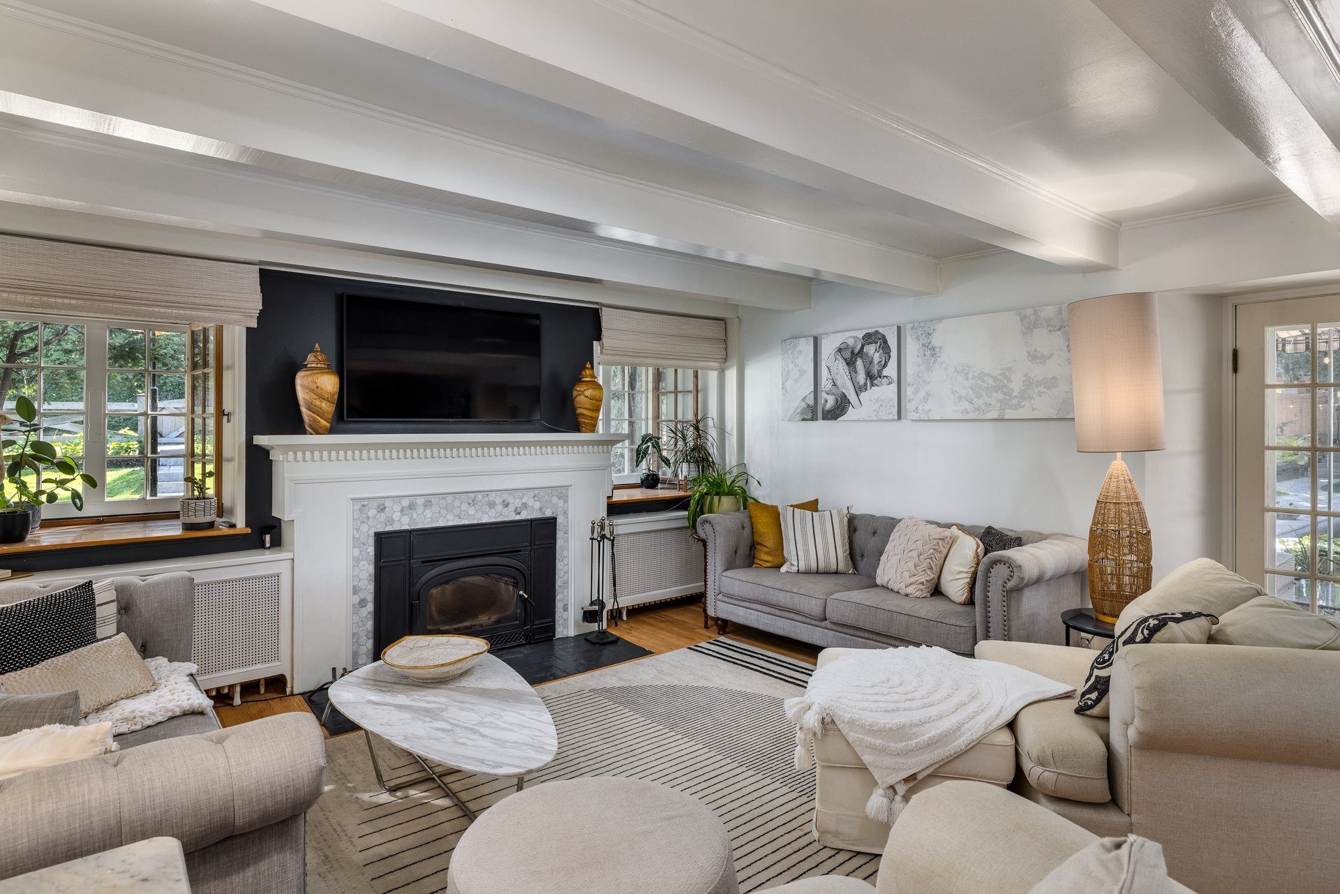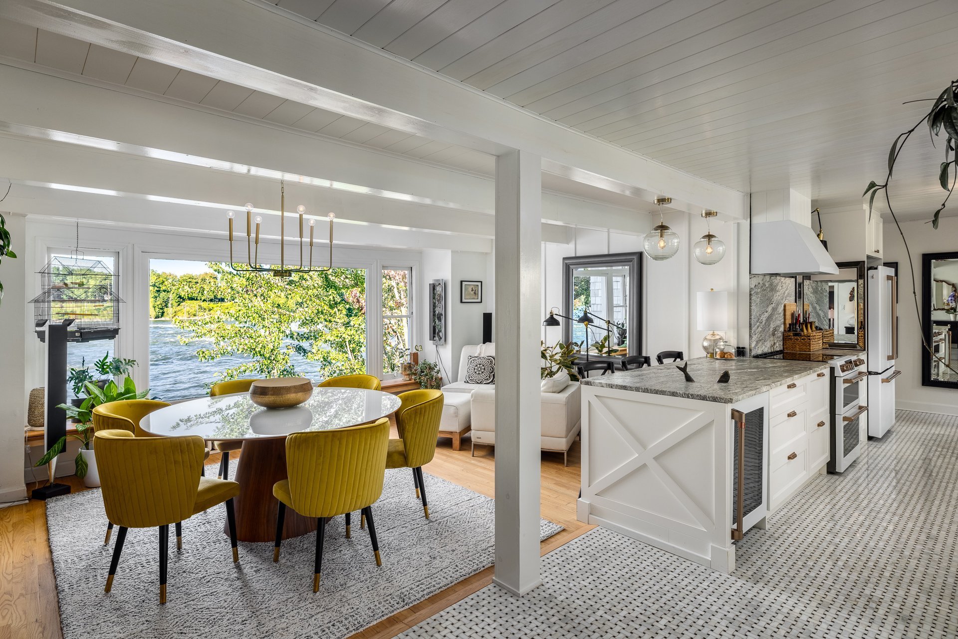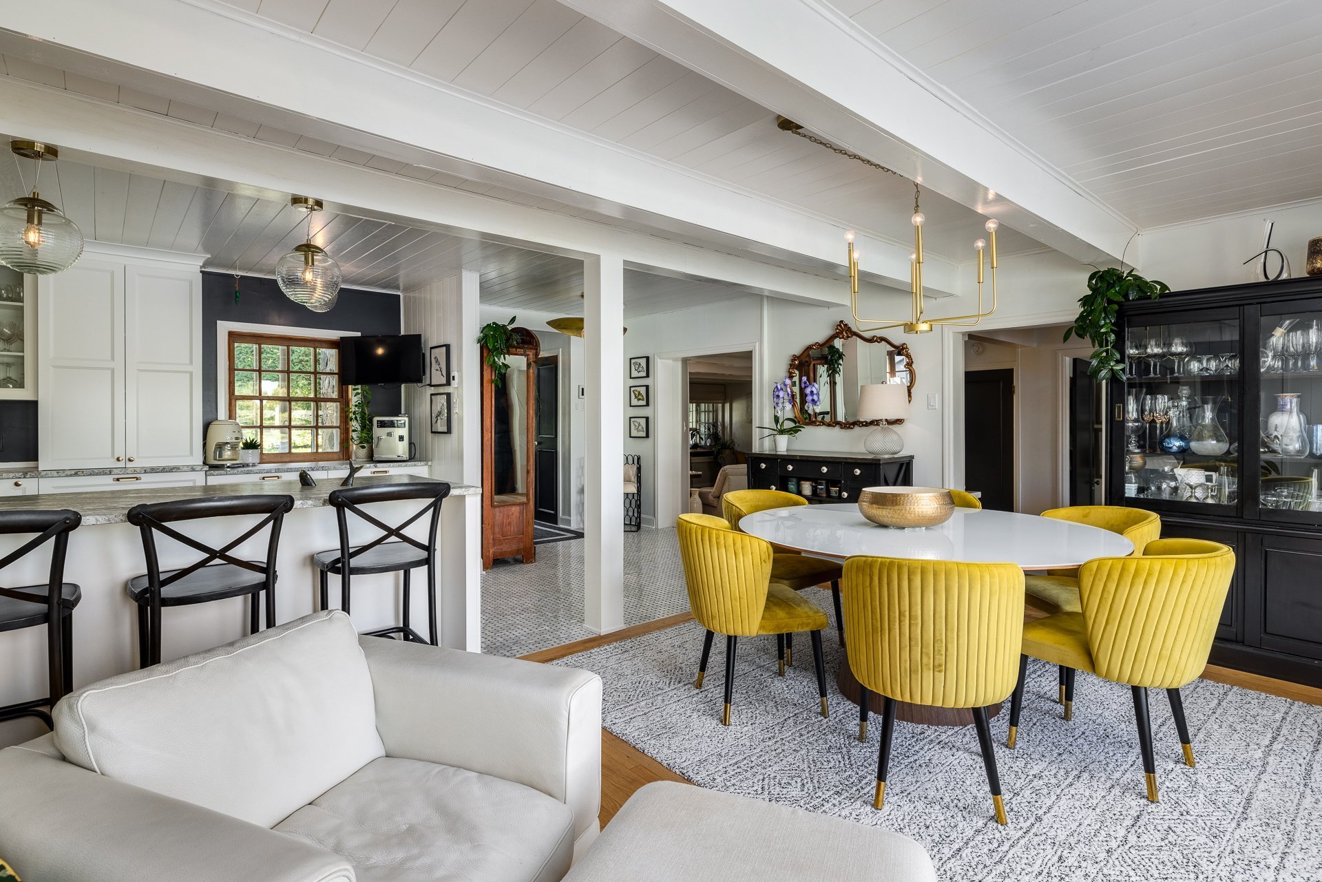 À l'intérieur, la propriété incarne à la fois modernité et sophistication. Les finitions haut de gamme se révèlent dans chaque détail : une cuisine à aire ouverte équipée d'un vaste îlot central et d'électroménagers de pointe, des baies vitrées spectaculaires inondant les pièces de lumière naturelle, ainsi qu'un mariage harmonieux de parquet poli et de carrelage en marbre, qui témoignent d'un artisanat d'exception.