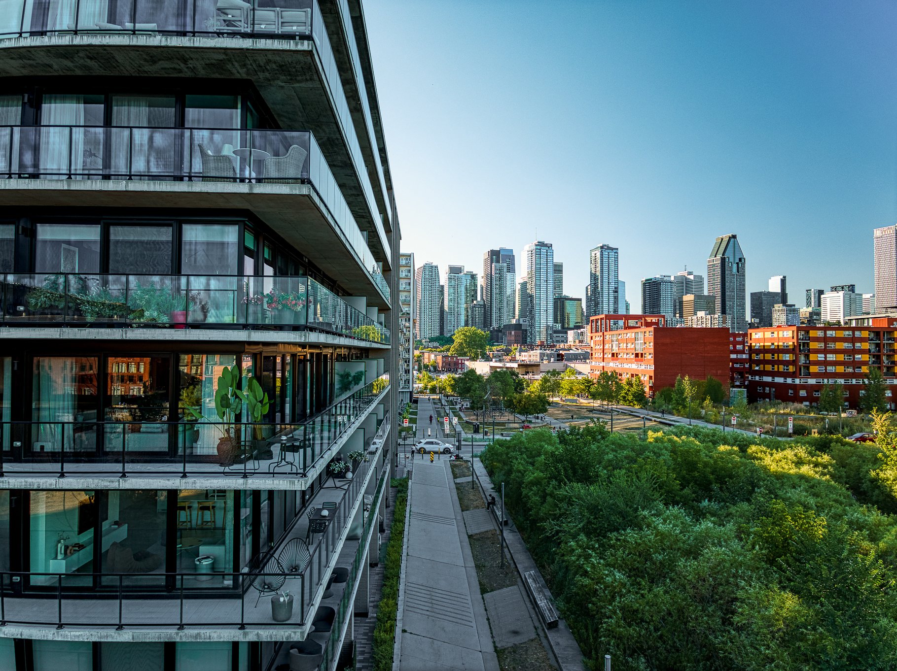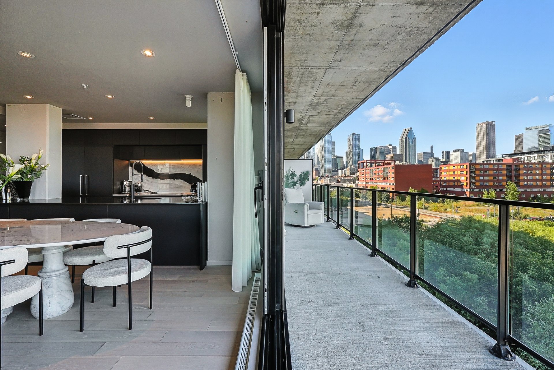 *Balcon en L (wrap-around) offrant toute la superficie extérieure de l'unité en terrasse.