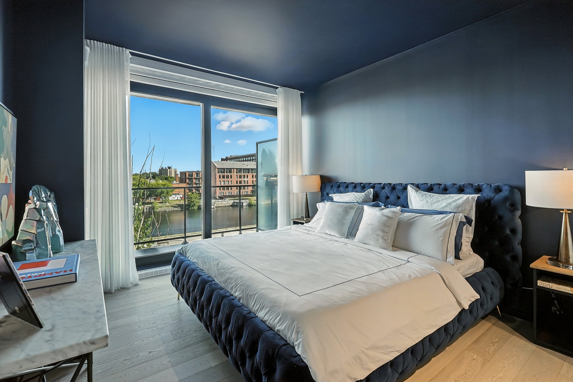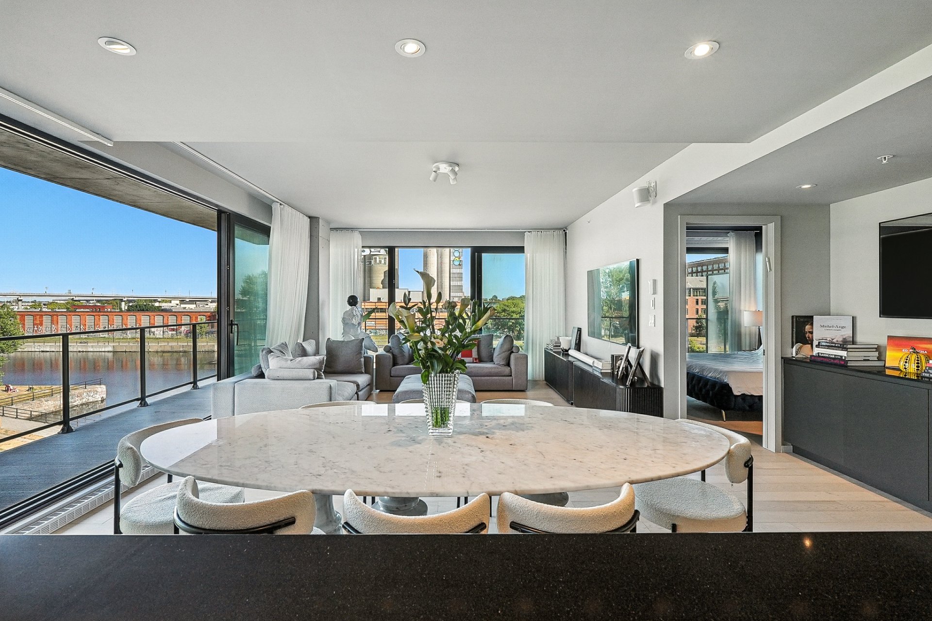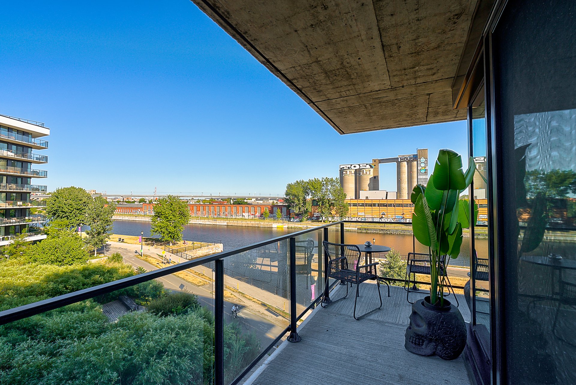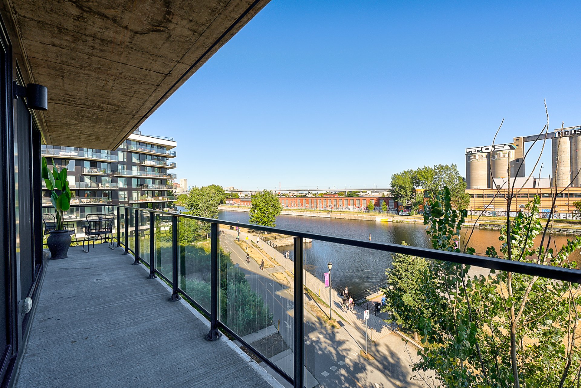 Le Charlotte, suite 401. Condo unique offrant un vaste espace de vie avec vues panoramiques sur le Canal Lachine et l'orientation sud-est assurant quiétude et luminosité. Grand 2 chambres initialement conçu pour être un 3 chambres. La suite des maîtres dégage chaleur et élégance avec vue directe sur le Canal et salle de bain attenante. La 2e chambre, actuellement aménagée en chambre d'enfant, peut servir de bureau ou chambre d'invité avec salle de bain adjacente. Finitions haut de gamme : marbre, rangements sur mesure, garage #201 et 4 lockers convertis en 1 grand espace. Condo unique avec vue bateau sur l'eau, une visite vous charmera.