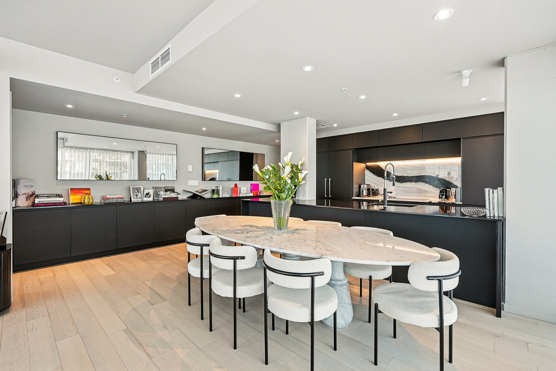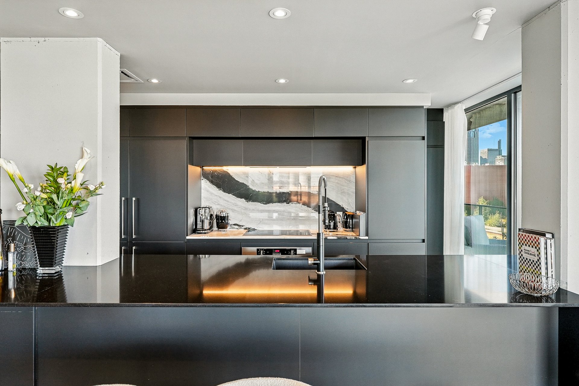 *Cuisine haut de gamme : dosseret en marbre italien unique, grand îlot sur mesure en quartz noir, électroménagers haut de gamme avec doubles réfrigérateurs/congélateurs et plaque de cuisson à induction.