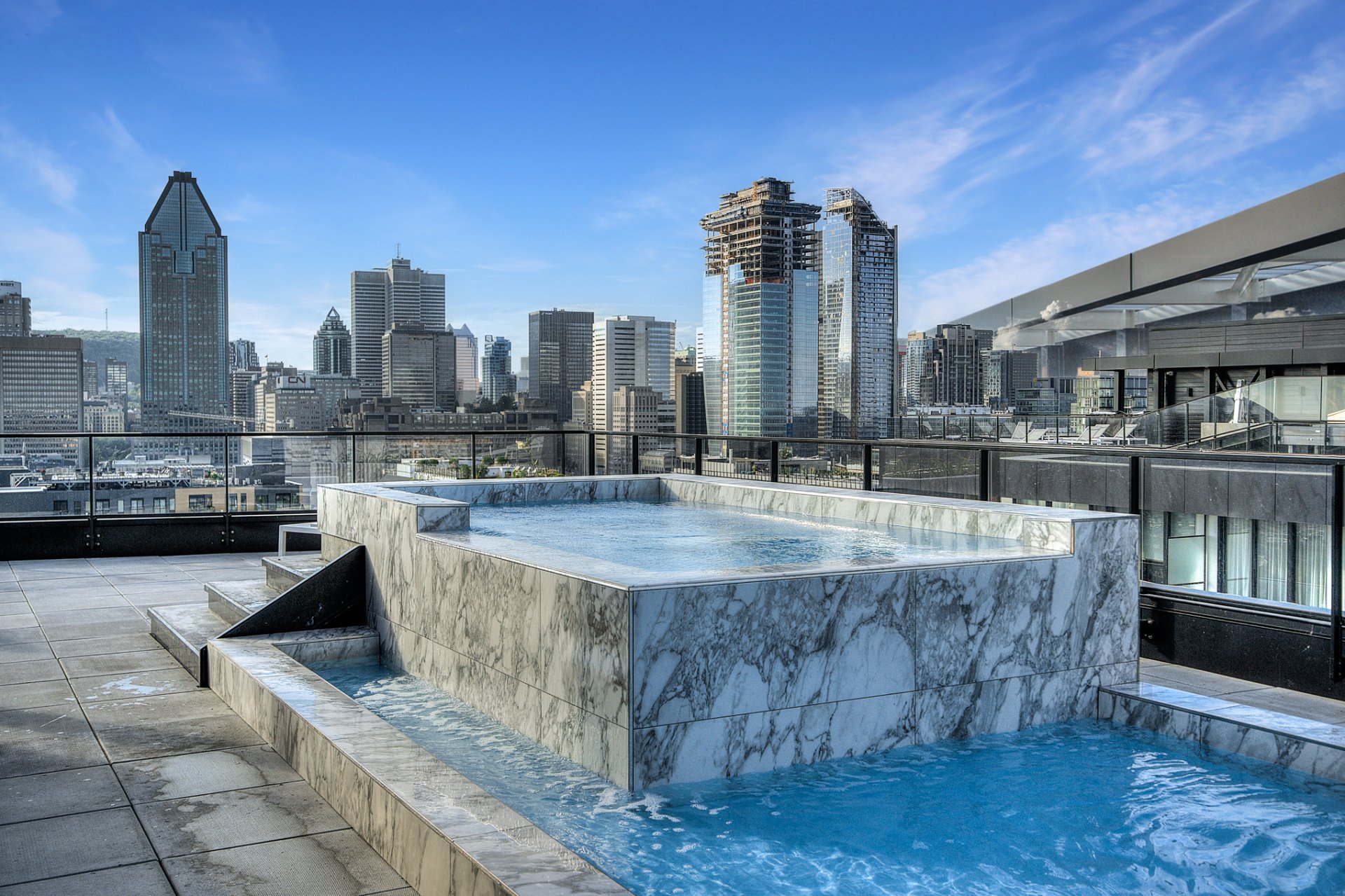 Les frais mensuels comprennent : condo, électricité et entretien des espaces communs, frais d'administration et de gestion, fonds de prévoyance, assurance du bâtiment, sécurité - horaire 24/7, salle de sport, piscine extérieure, bain à remous, sauna, eau chaude de la partie privative, salle de conférence, salle de fête - frais de réservation applicables, billard, salon.