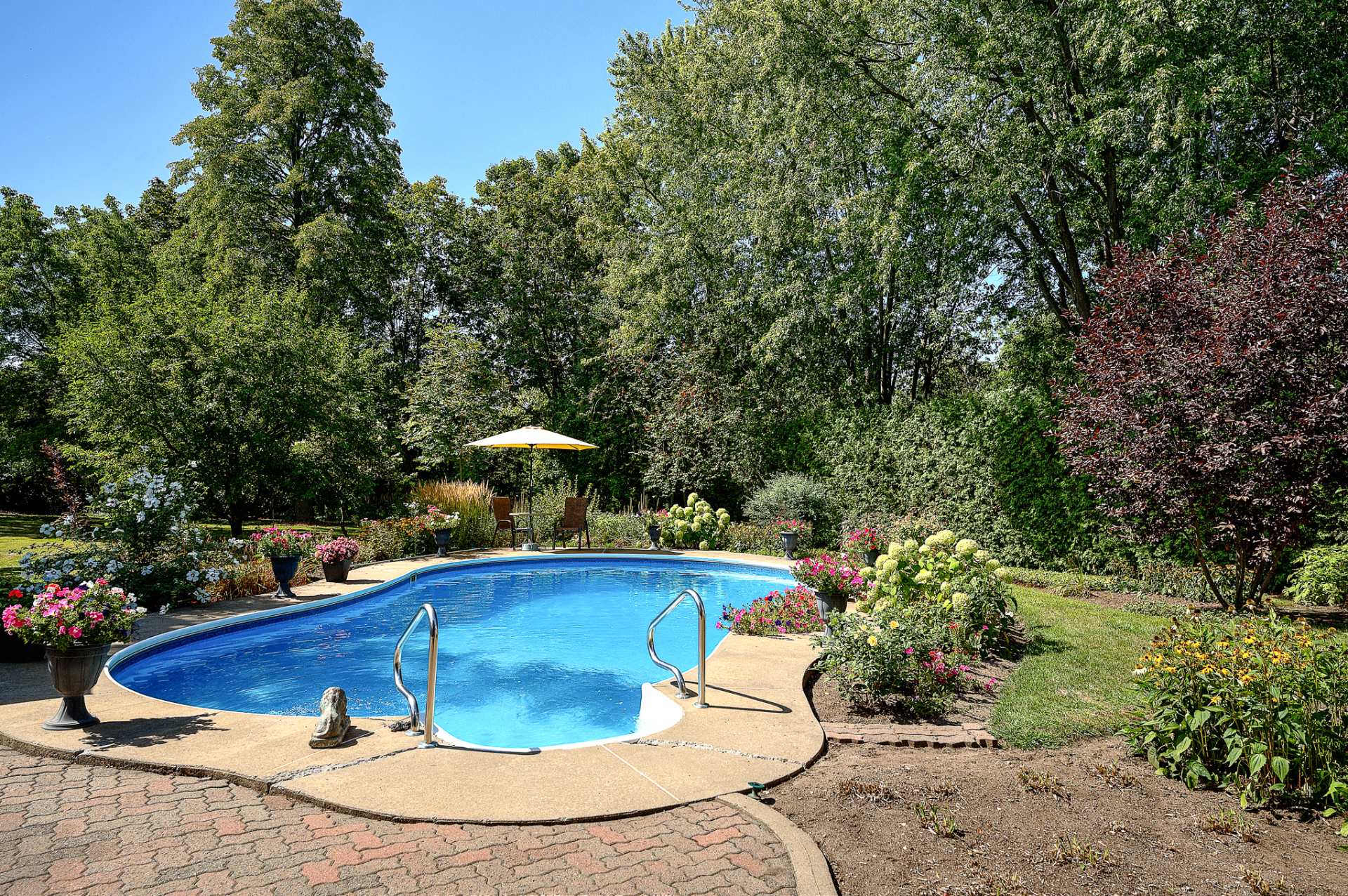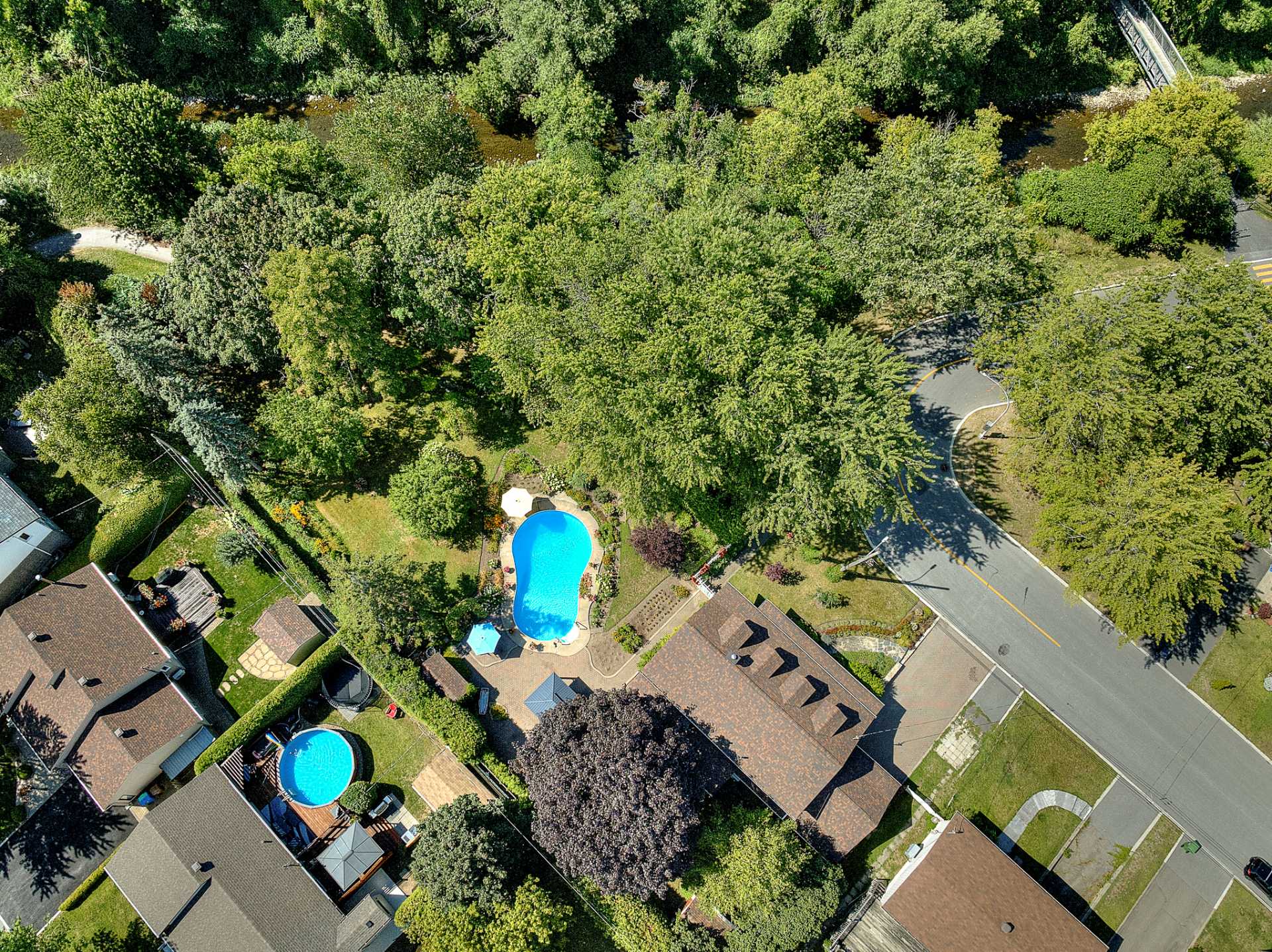 Extérieur : Piscine creusée chauffée, jardin paysager avec gazebo et deux cabanons. Située au bout d'une rue en U, la propriété bénéficie d'un environnement calme et intime, avec une proximité unique au fleuve.