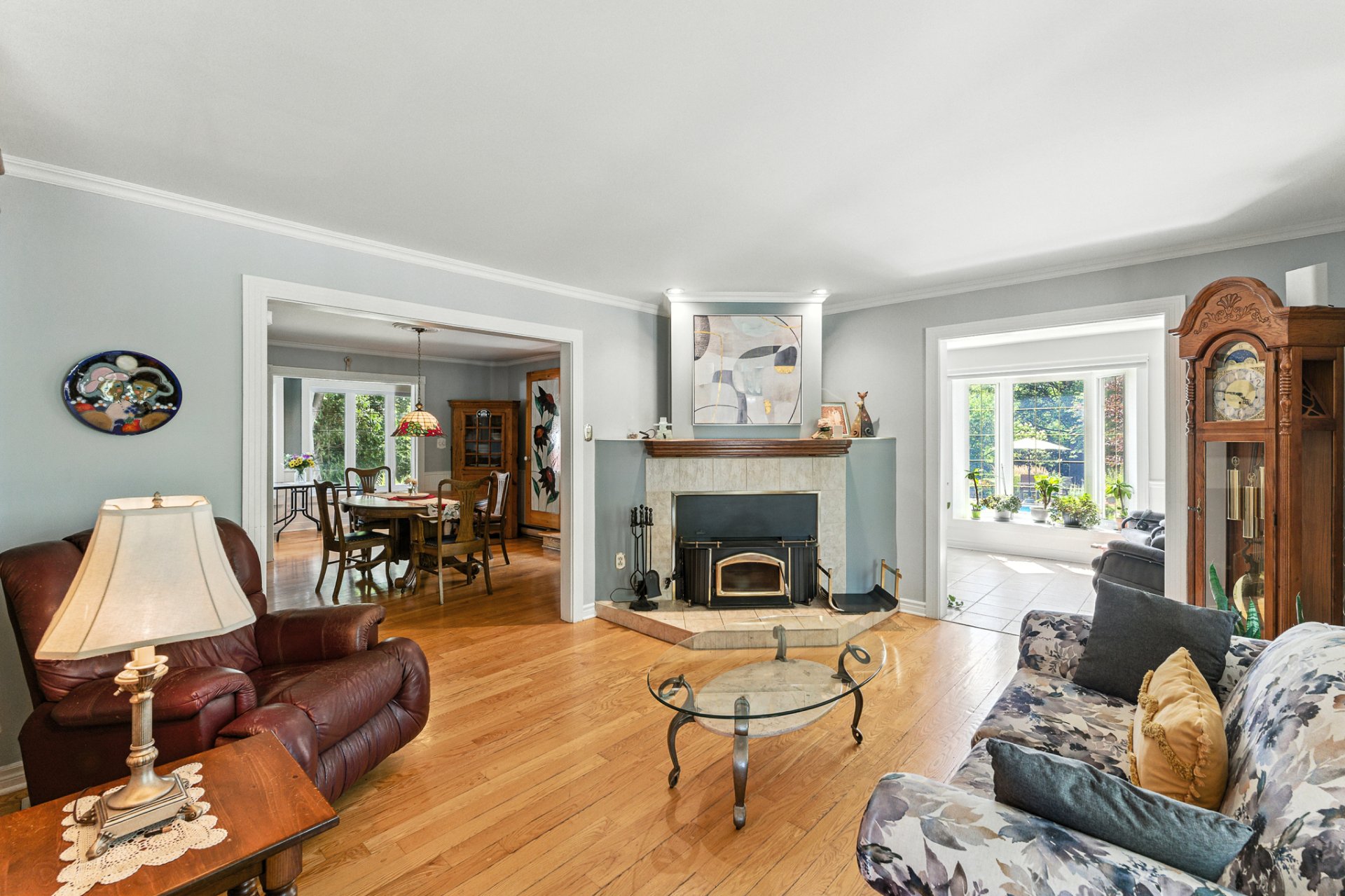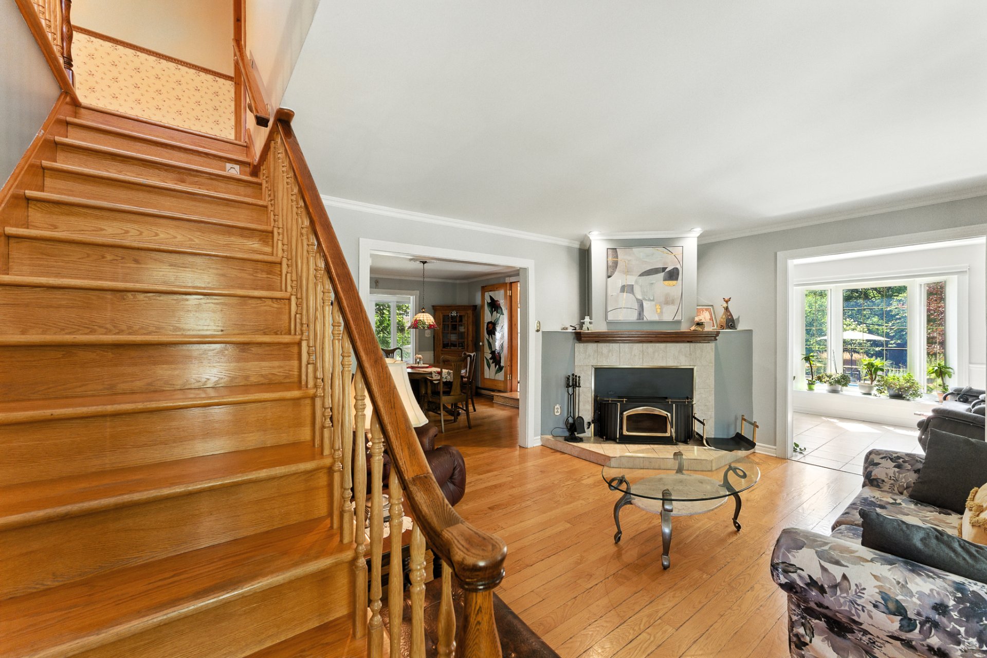 Rez-de-chaussée : Le hall d'entrée, accueillant et fonctionnel, s'ouvre directement sur le salon agrémenté d'un foyer au bois, créant une atmosphère chaleureuse dès l'arrivée. On retrouve également une salle à manger conviviale, un boudoir, une véranda lumineuse, ainsi qu'une cuisine pratique. L'accès au garage se situe au bout du couloir, garantissant discrétion et efficacité. Deux chambres confortables, une salle de bain complète et une salle de lavage indépendante complètent ce niveau.