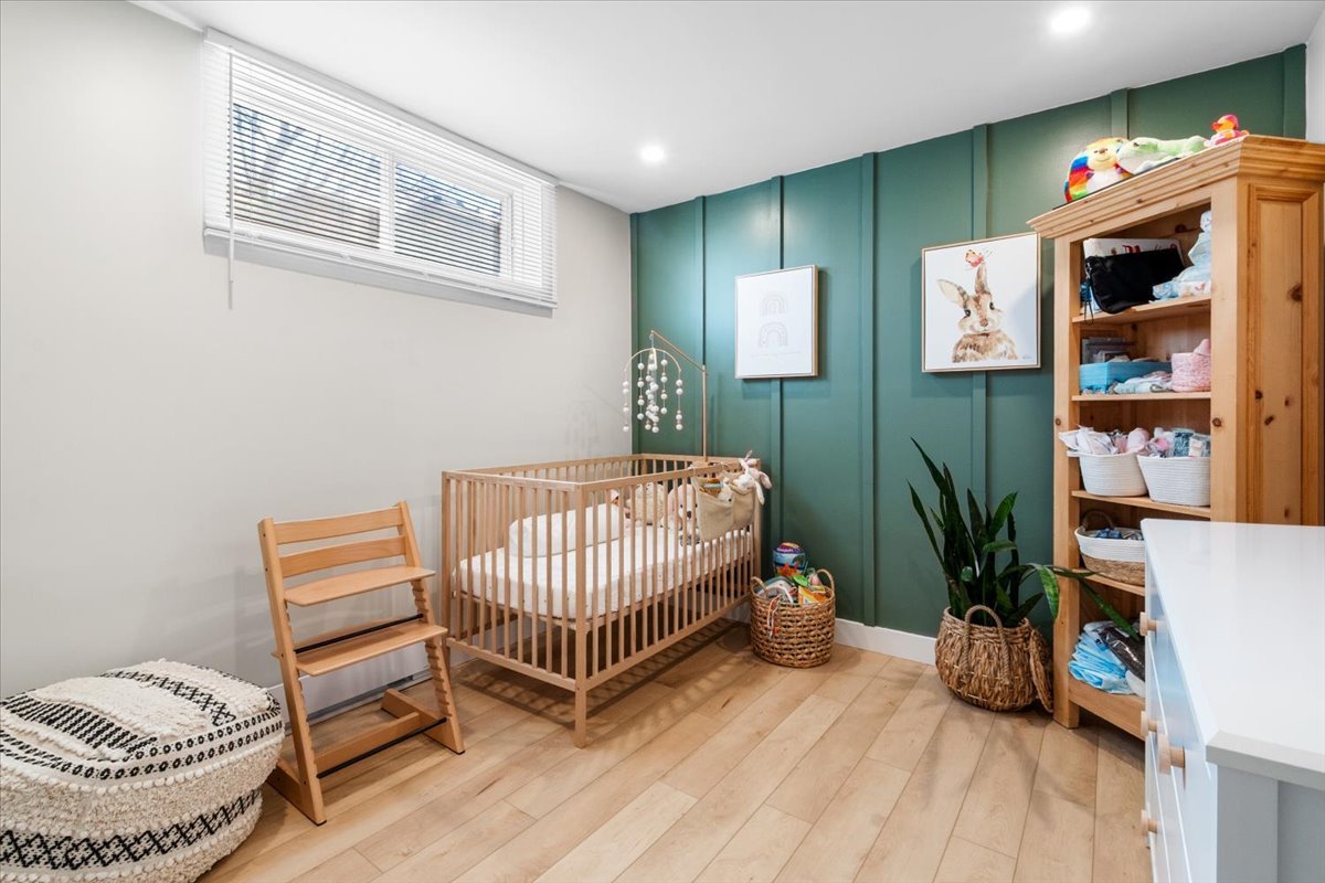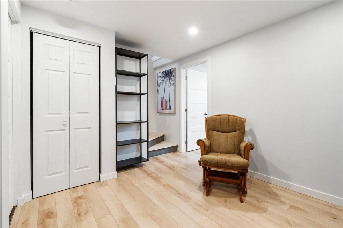 Le sous-sol propose une salle familiale, une chambre à coucher ainsi qu'une salle de lavage, formant un espace bien aménagé et fonctionnel.