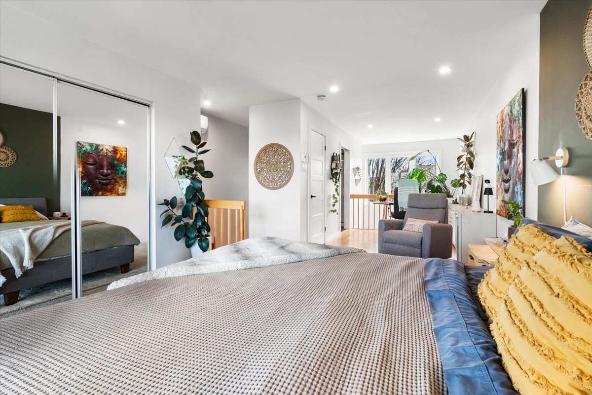 À l'étage, un espace bureau ou polyvalent s'adapte à vos besoins, profitant d'une belle luminosité grâce à l'effet mezzanine et à la grande fenestration. La chambre à coucher principale, spacieuse et apaisante, offre une vue dégagée. Une salle de bain s'y trouve également.