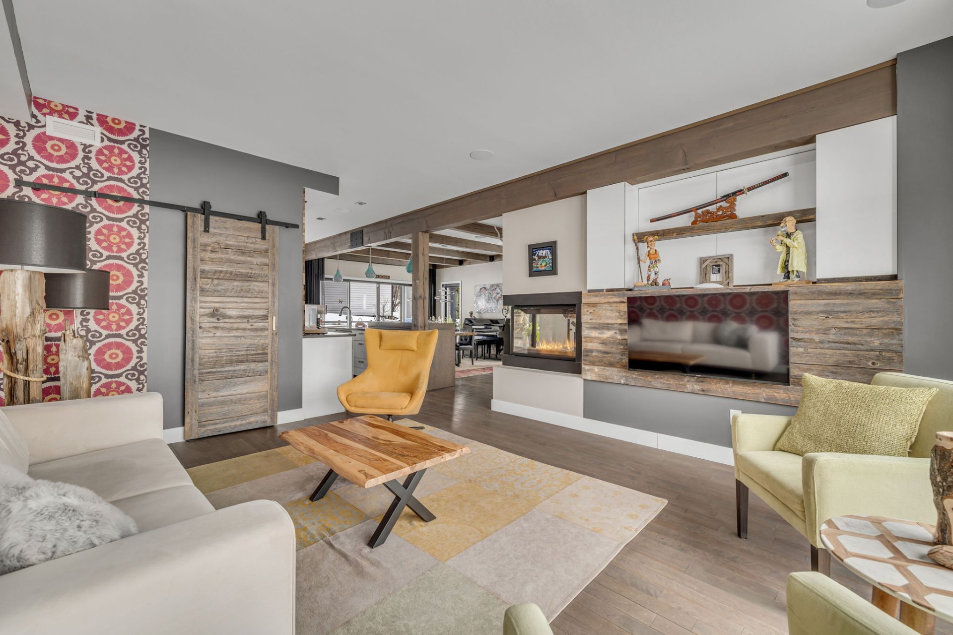 Le rez-de-chaussée propose une aire de vie ouverte où se côtoient confort et convivialité. Le salon, agrémenté d'un foyer au gaz, invite à la détente dans une ambiance chaleureuse, tandis que la cuisine moderne avec son grand îlot central et son garde-manger pratique devient le coeur de la maison, parfaite pour recevoir et partager des moments en toute simplicité.