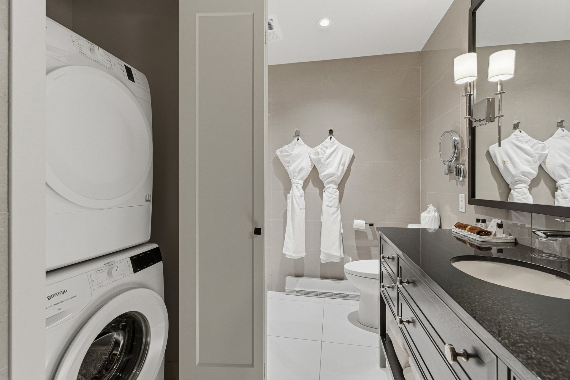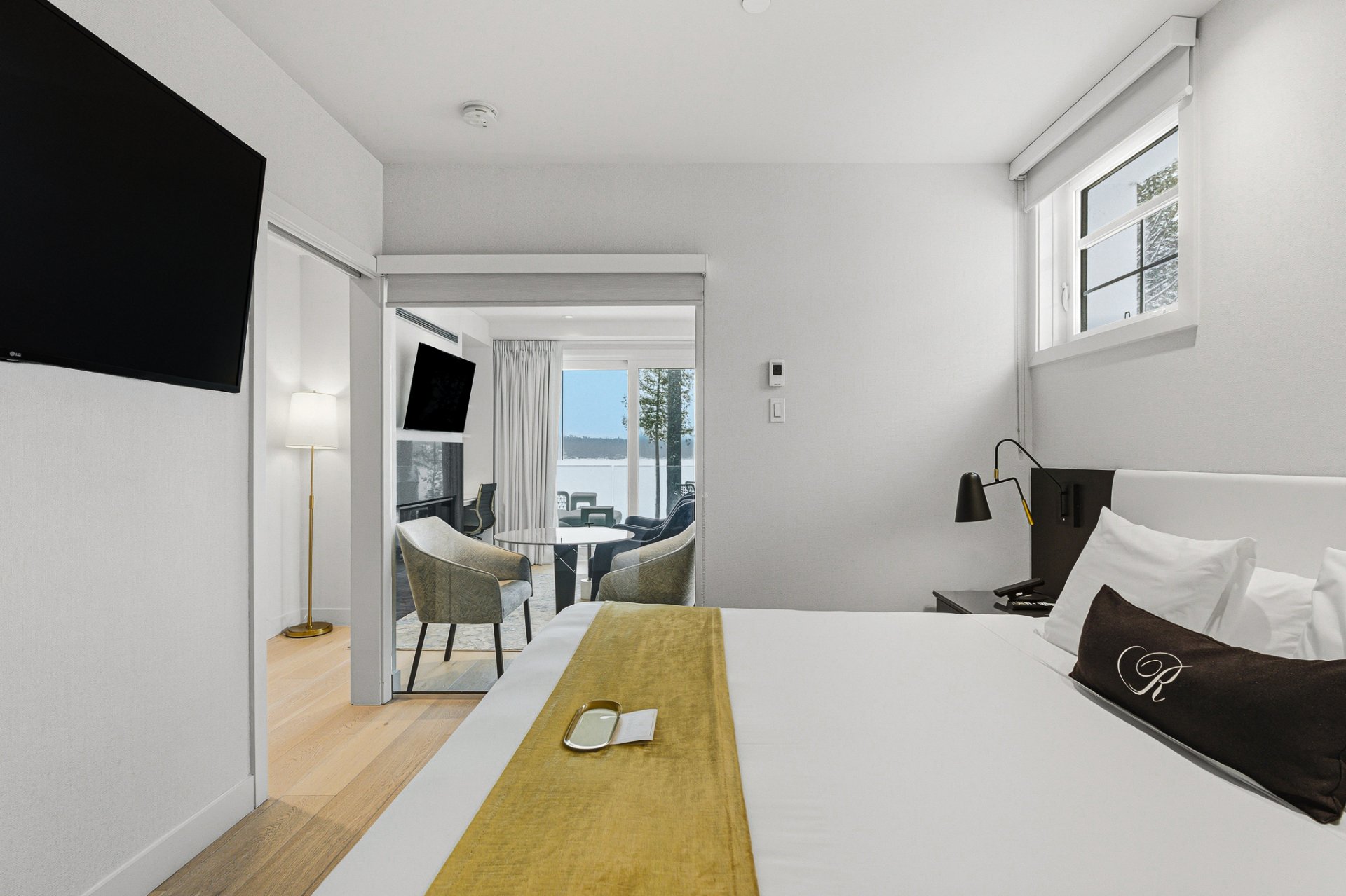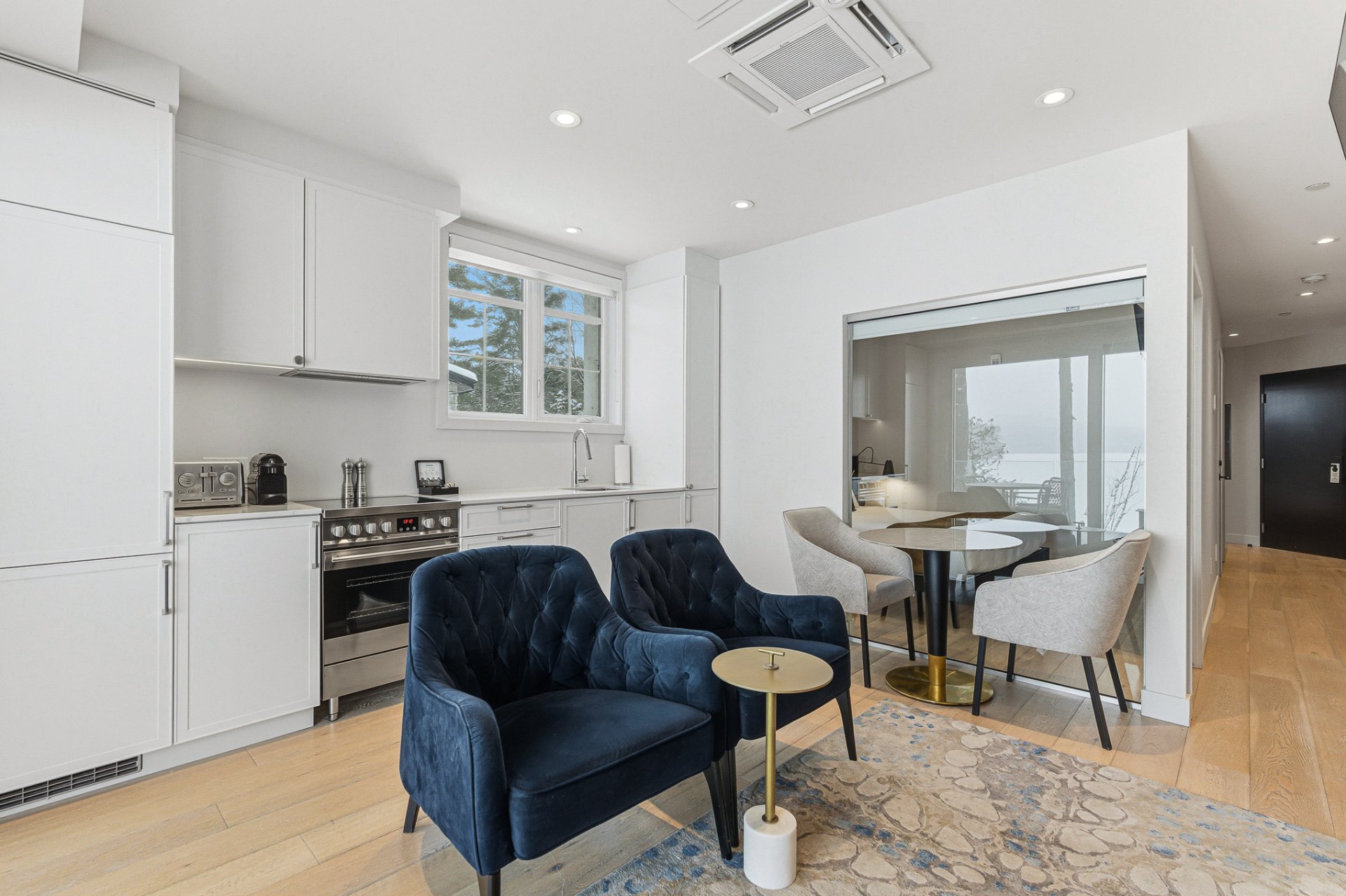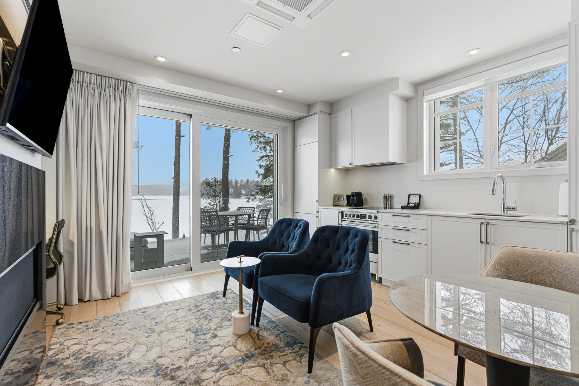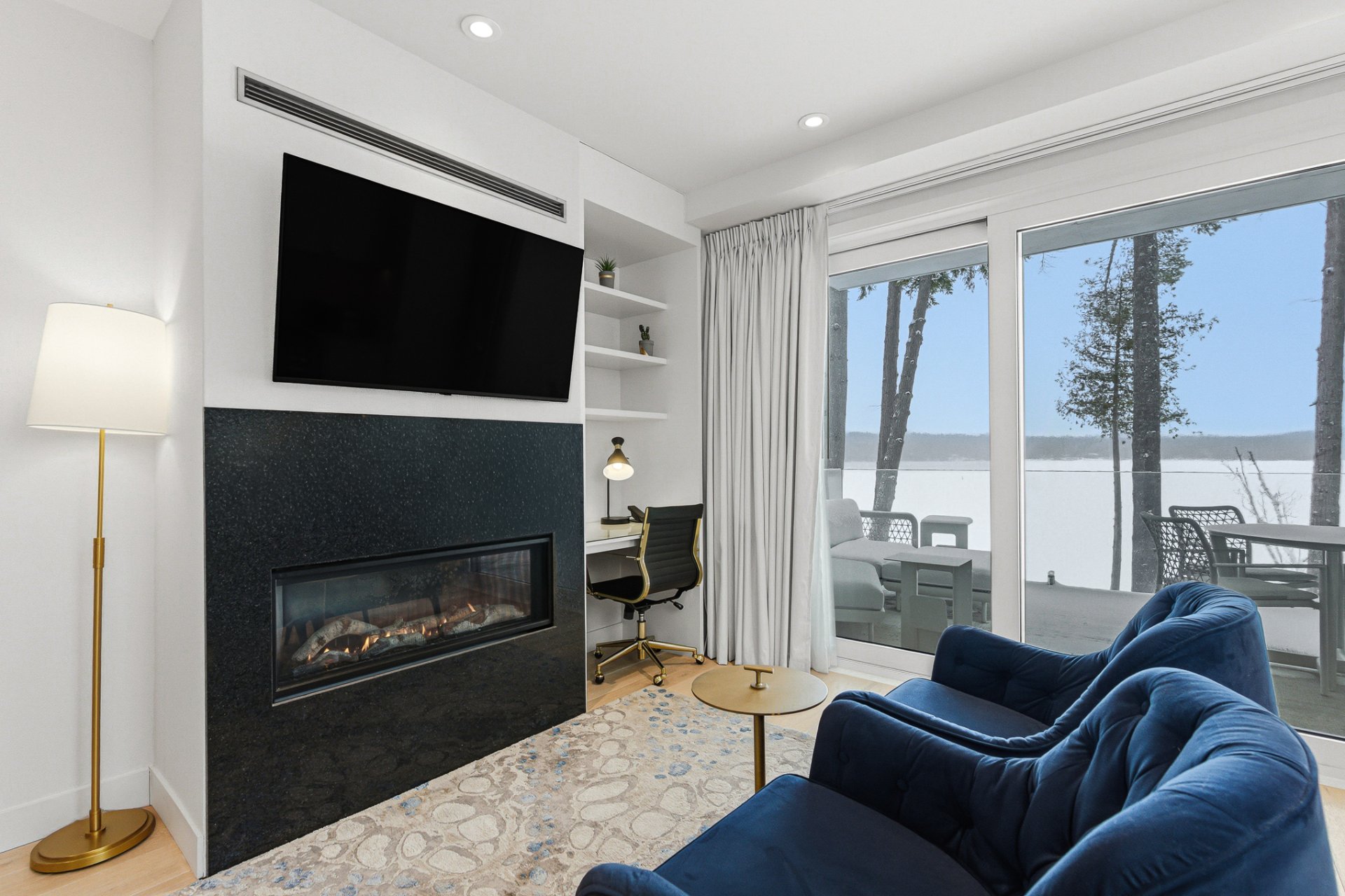 L'unité se démarque par son design contemporain à aire ouverte, ses lignes épurées et ses matériaux de qualité. La généreuse fenestration baigne l'espace de vie d'une lumière naturelle abondante et met en valeur la vue sur le lac. Le salon est agrémenté d'un foyer moderne, créant une ambiance chaleureuse et invitante en toute saison. La cuisine complète, à la fois élégante et fonctionnelle, est dotée d'un coin bureau intégré, parfaitement adapté au télétravail ou à une utilisation polyvalente.