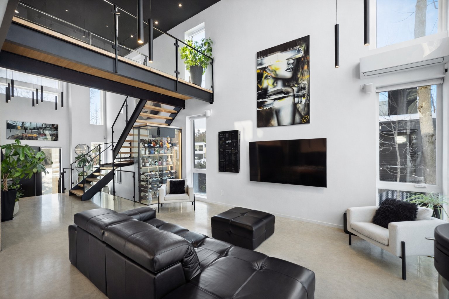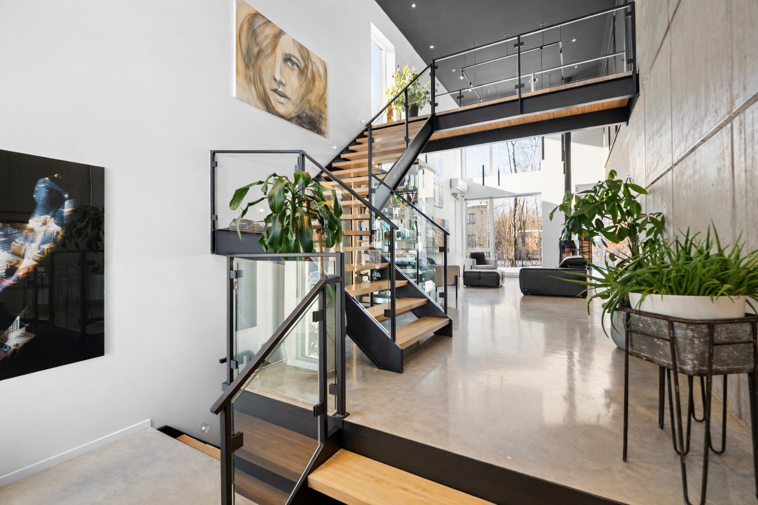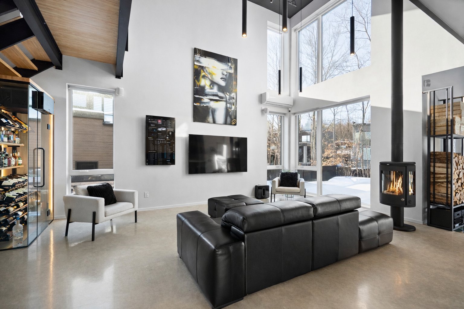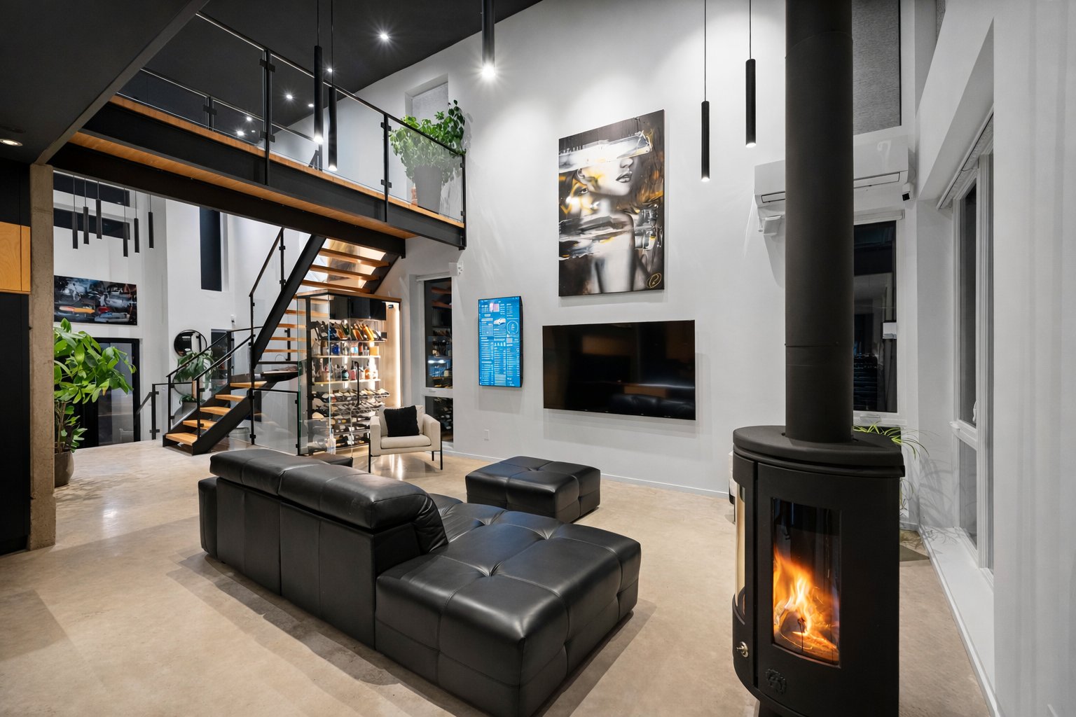 Dès l'entrée, le salon impressionne avec son plafond cathédrale, sa passerelle au 2e étage et son mur de verre qui créent un effet architectural spectaculaire. L'escalier acier/bois avec garde-corps de verre et le foyer scandinave viennent renforcer le caractère unique et contemporain de l'espace.
