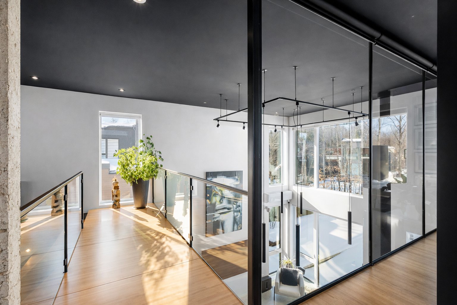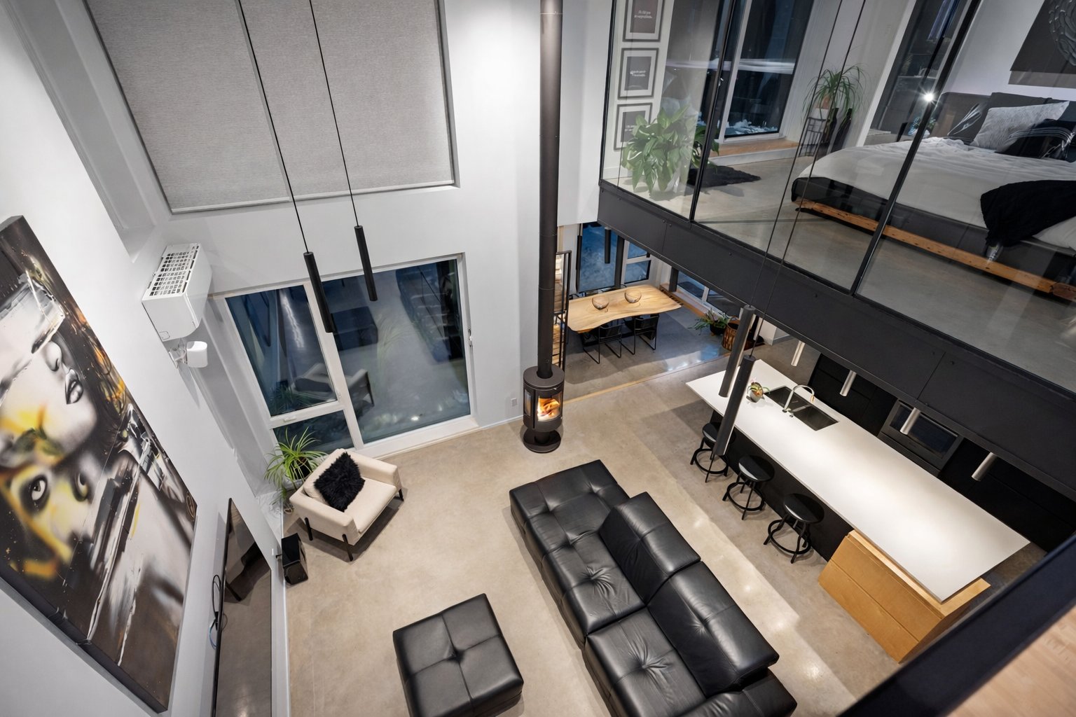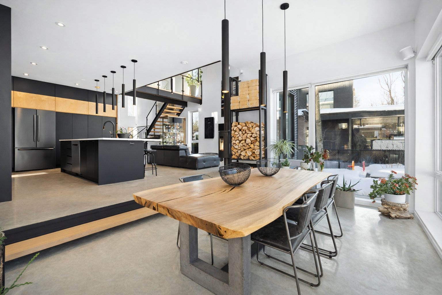 Dès l'entrée, le salon impressionne avec son plafond cathédrale, sa passerelle au 2e étage et son mur de verre qui créent un effet architectural spectaculaire. L'escalier acier/bois avec garde-corps de verre et le foyer scandinave viennent renforcer le caractère unique et contemporain de l'espace.