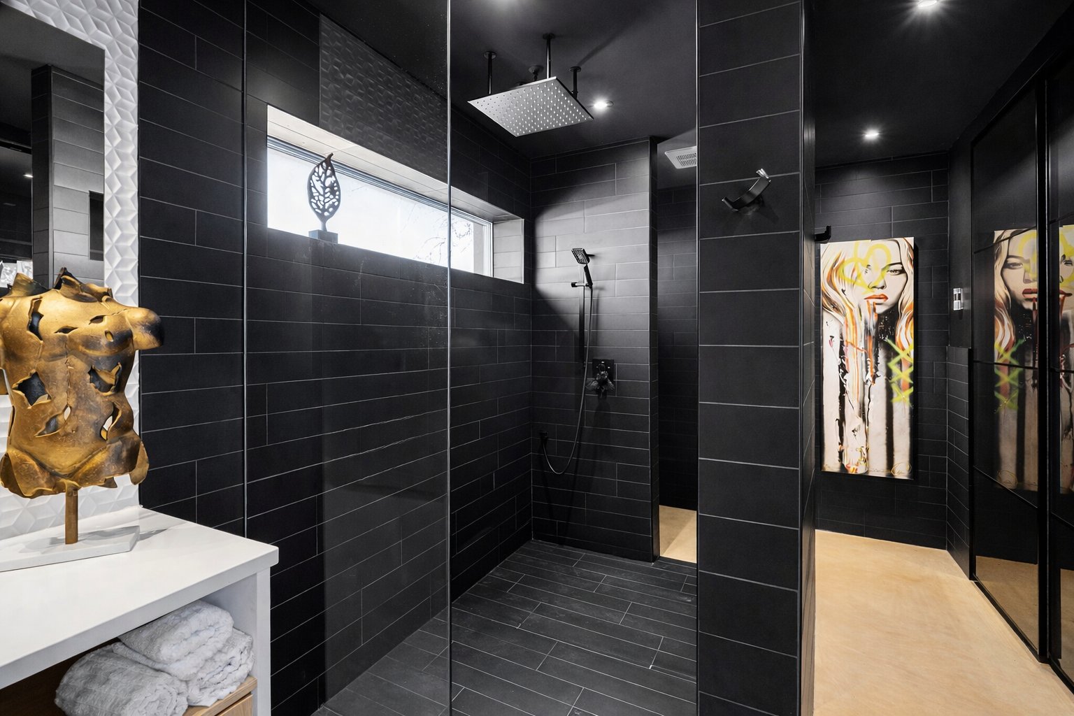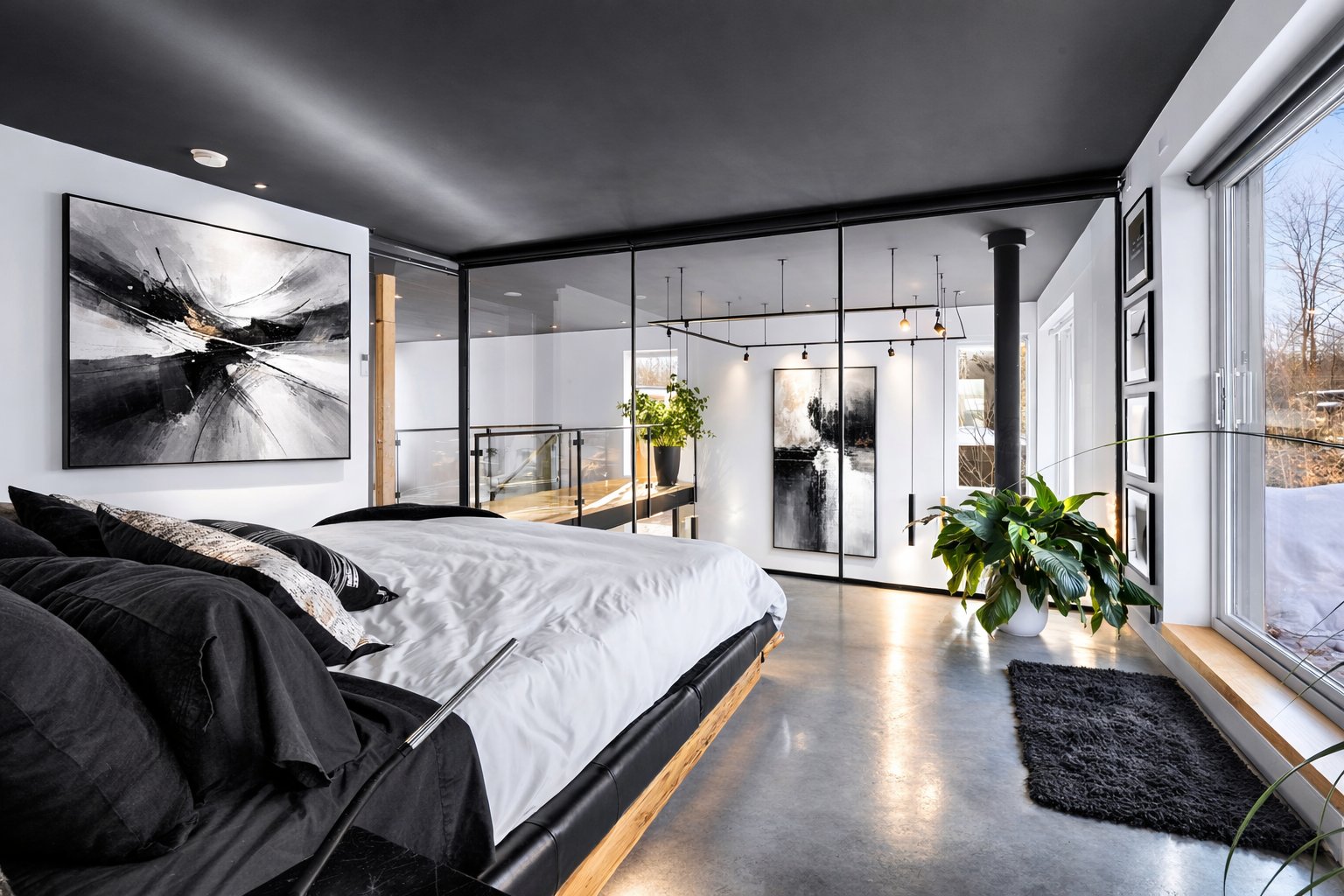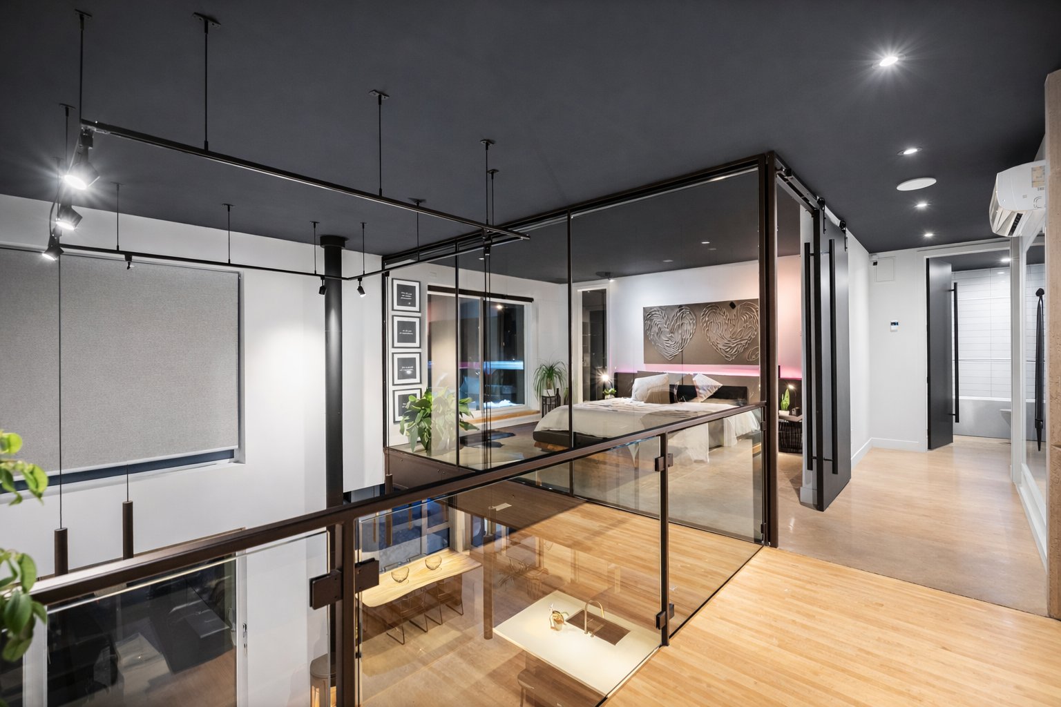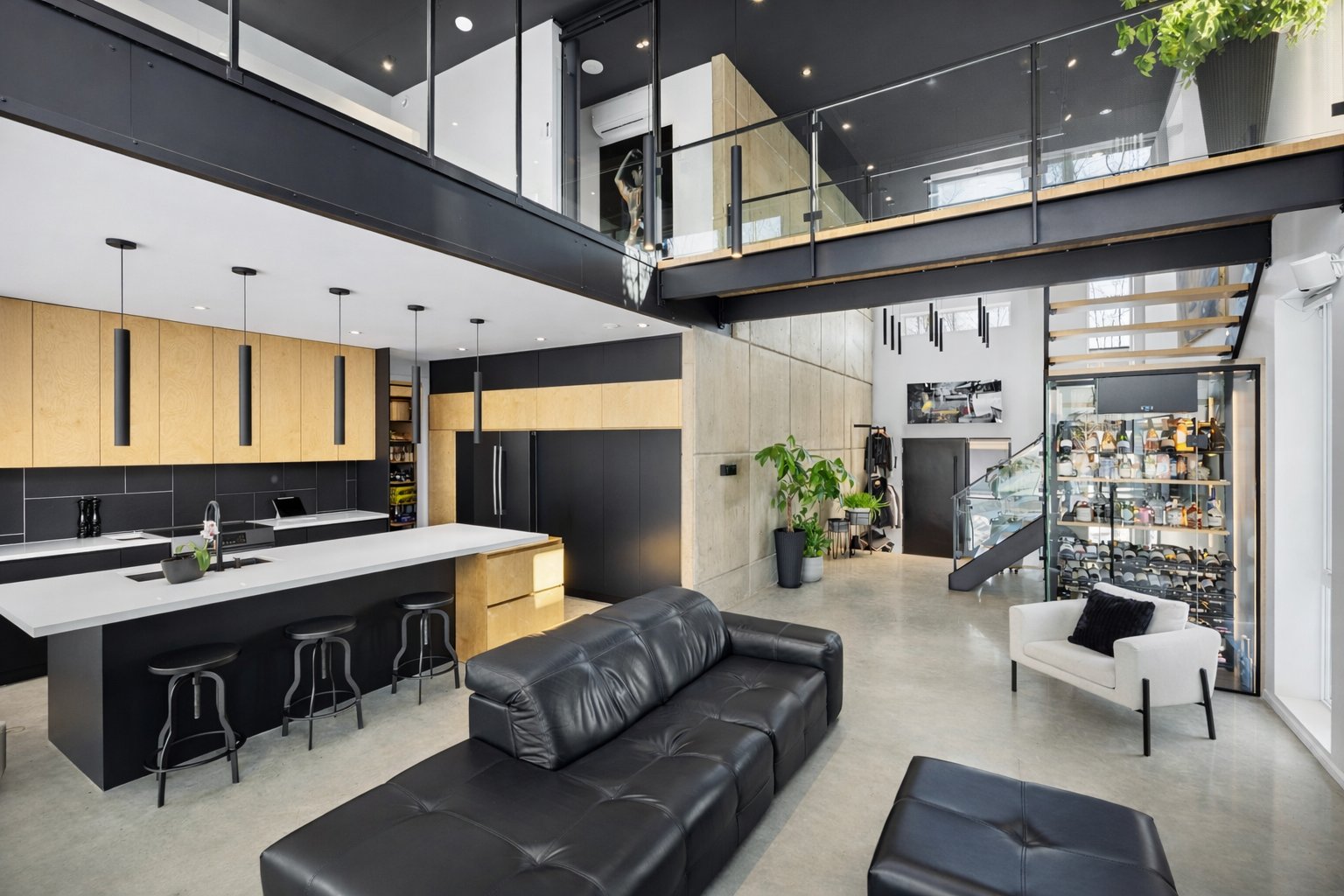 Dès l'entrée, le salon impressionne avec son plafond cathédrale, sa passerelle au 2e étage et son mur de verre qui créent un effet architectural spectaculaire. L'escalier acier/bois avec garde-corps de verre et le foyer scandinave viennent renforcer le caractère unique et contemporain de l'espace.