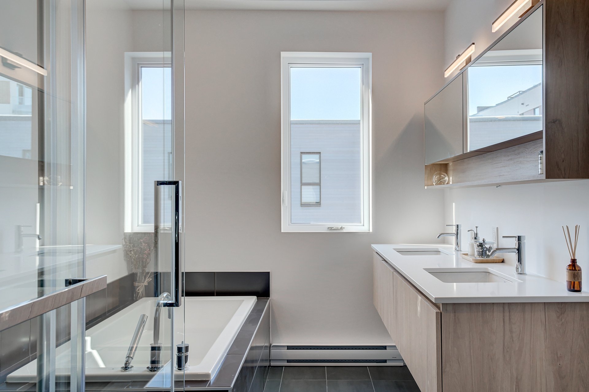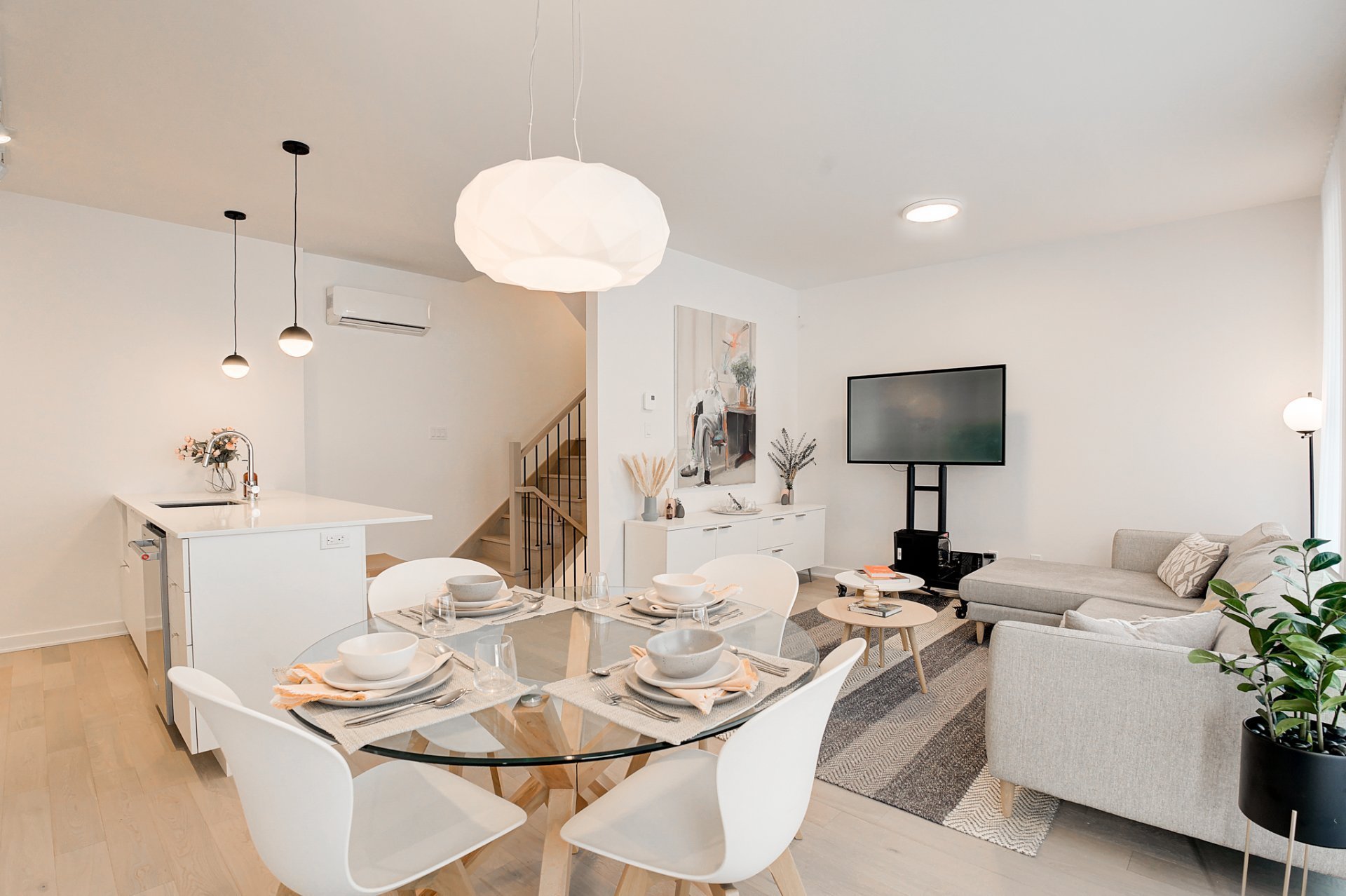 TAK VILLAGE | ANGUS | PHASE 3. Luxueuse maison de ville adossée offerte dans le très convoité secteur d'Angus à Rosemont. Bordée par un parc linéaire de plus de 16 000 pieds carrés, à quelques pas de tous les commerces de quartier. Elle vous offre un espace de vie lumineux donnant sur une immense terrasse privée de 349 pieds carrés. 3 chambres et 2+1 salles de bain. Finitions haut de gamme sobres, choisies avec soin. À quelques minutes du centre-ville. Présentation privée sur rendez-vous seulement.