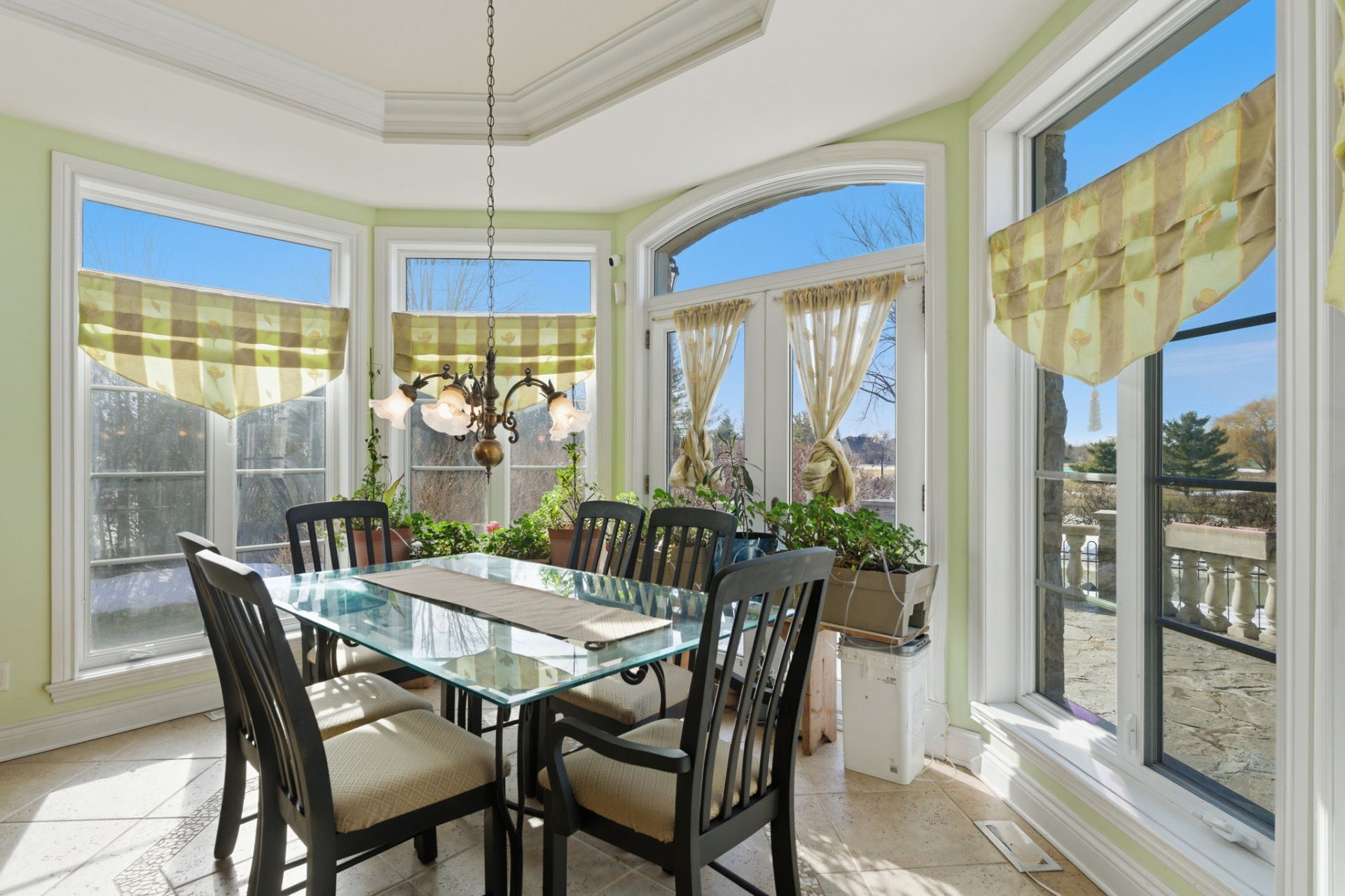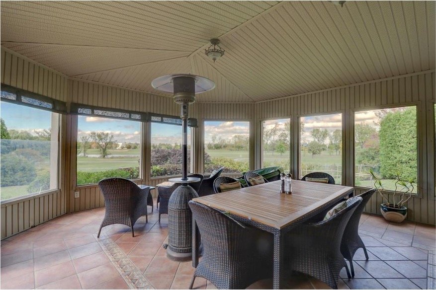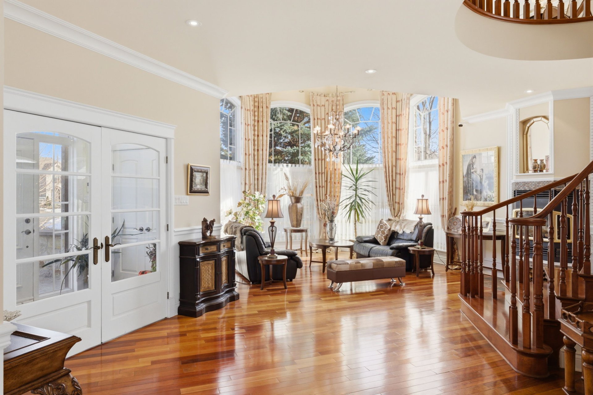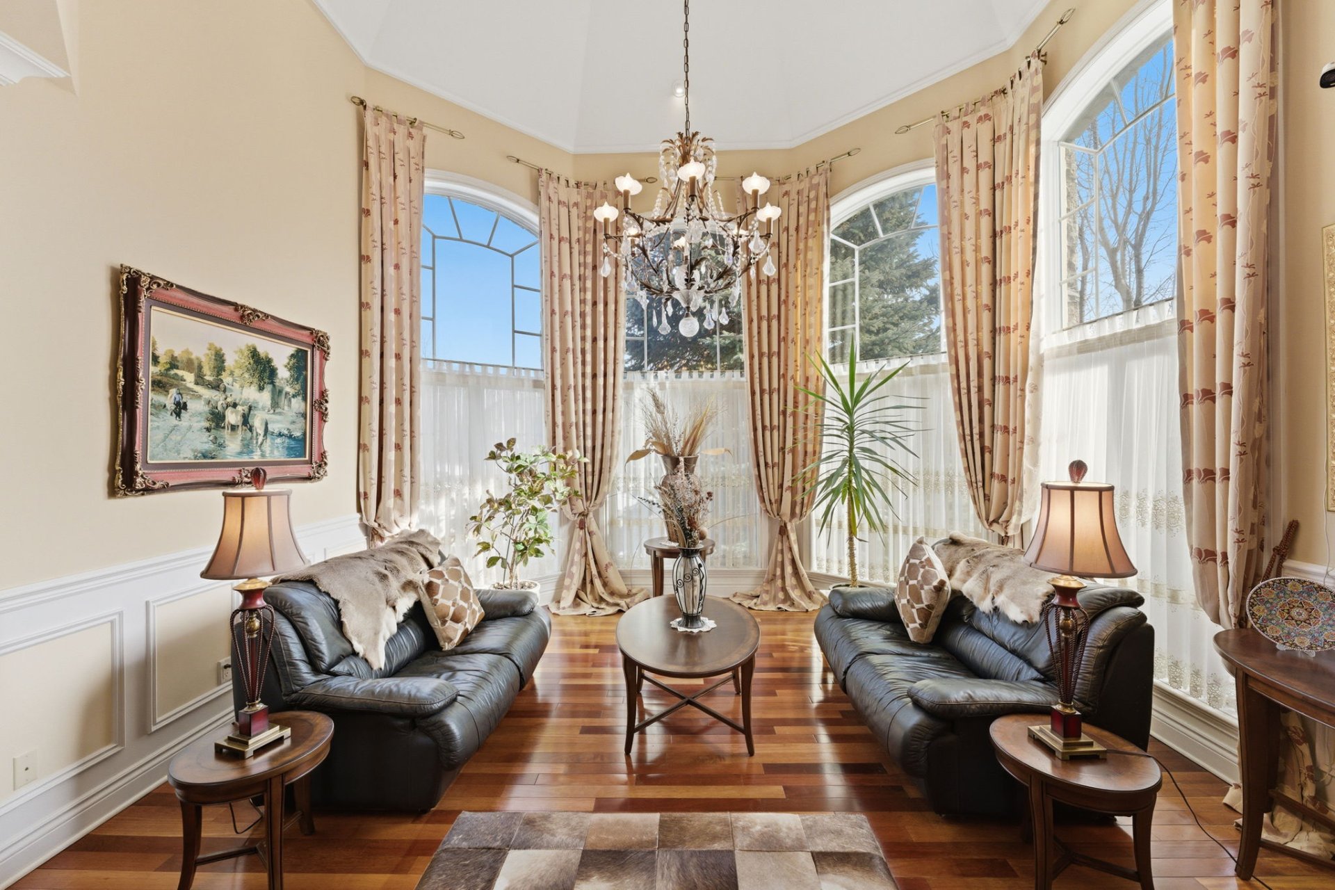 - Salon situé dans la tourelle, inondé de lumière naturelle par ses immenses fenêtres, plafond de près de 20 pieds, foyer à combustion lente;