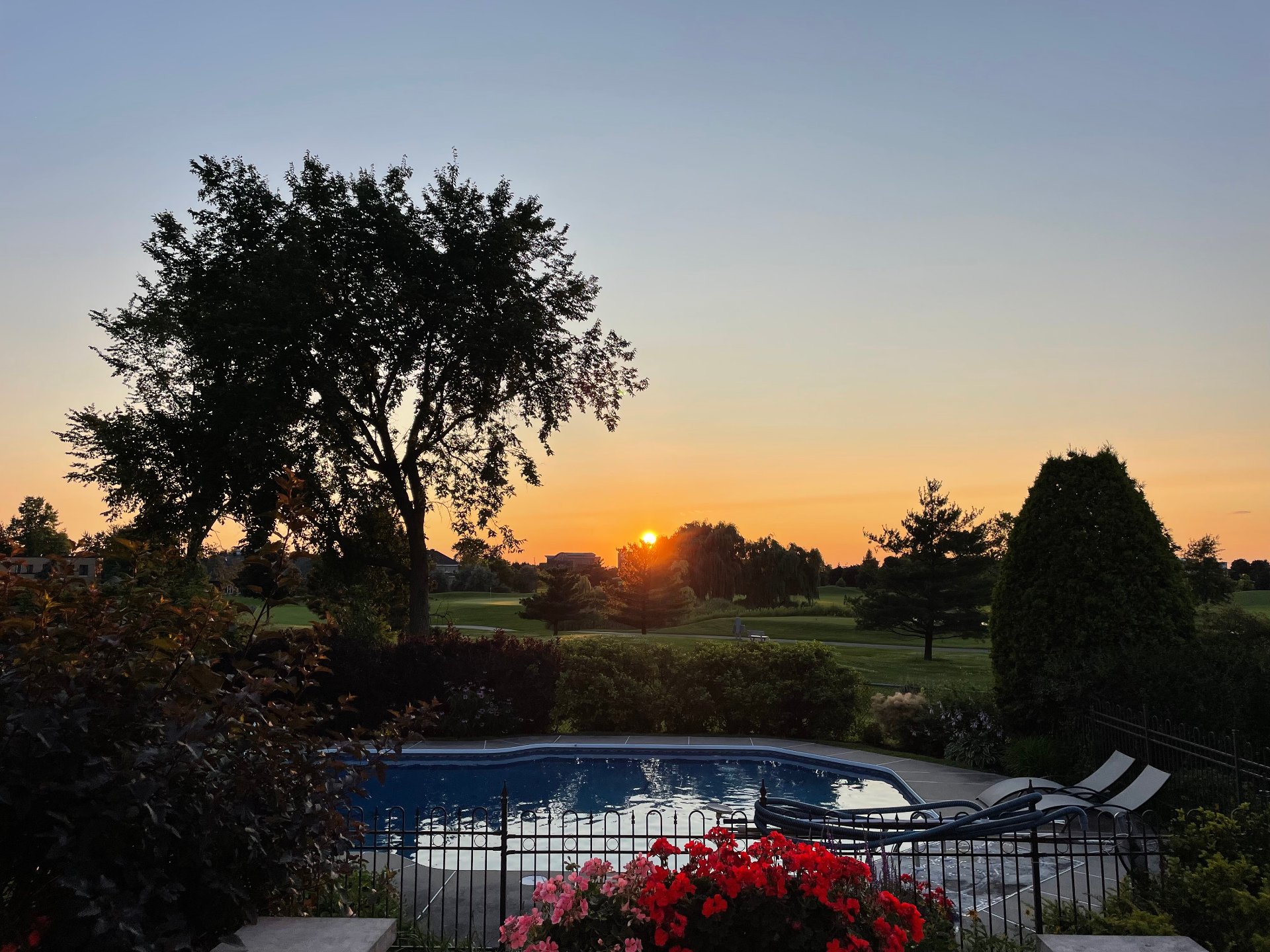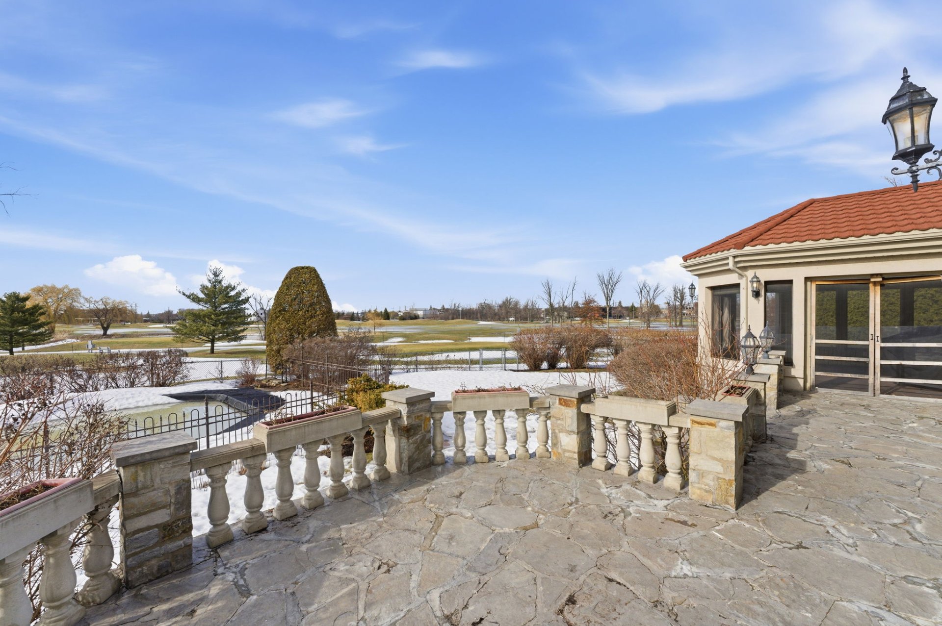 Cour arrière qui donne sur le golf, aménagée avec terrasses, espace repas et de magnifiques jardins.