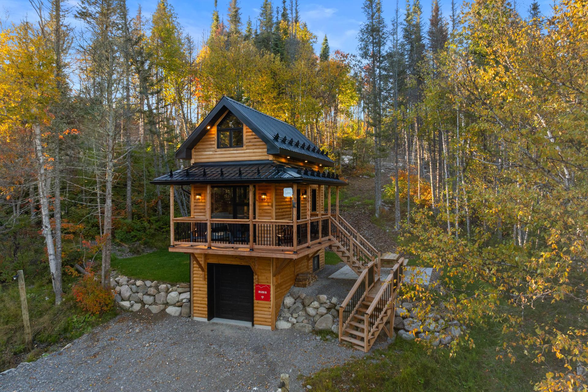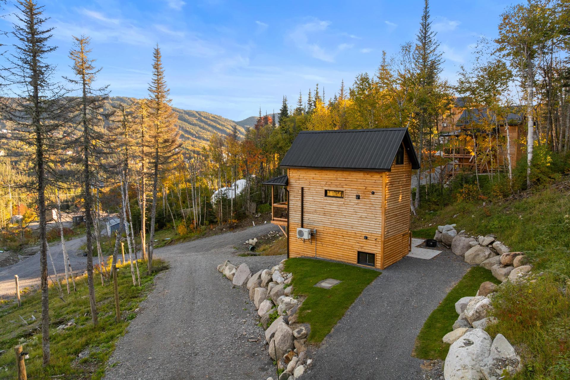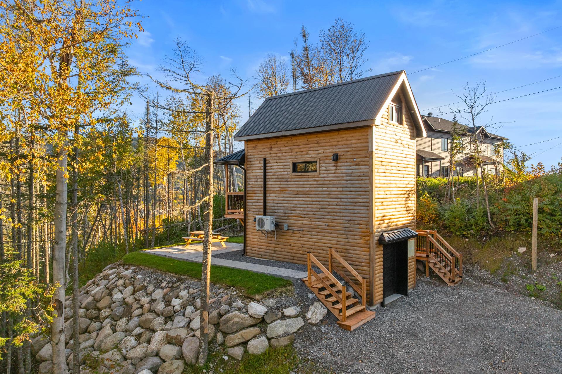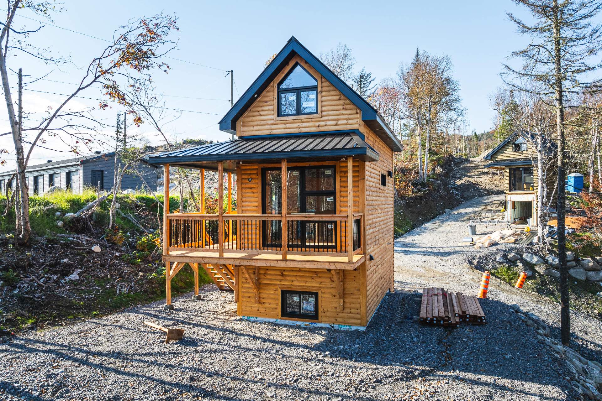 Mini-chalet sur deux étages de ± 20' x 10', avec sous-sol et petit garage intégré, dalle de béton radiant pour une superficie totale de 600 pi². Peut accueillir de 2 à 4 personnes dans un cadre idyllique et comprend tous les services : eau, électricité, chauffage et système d'égout.