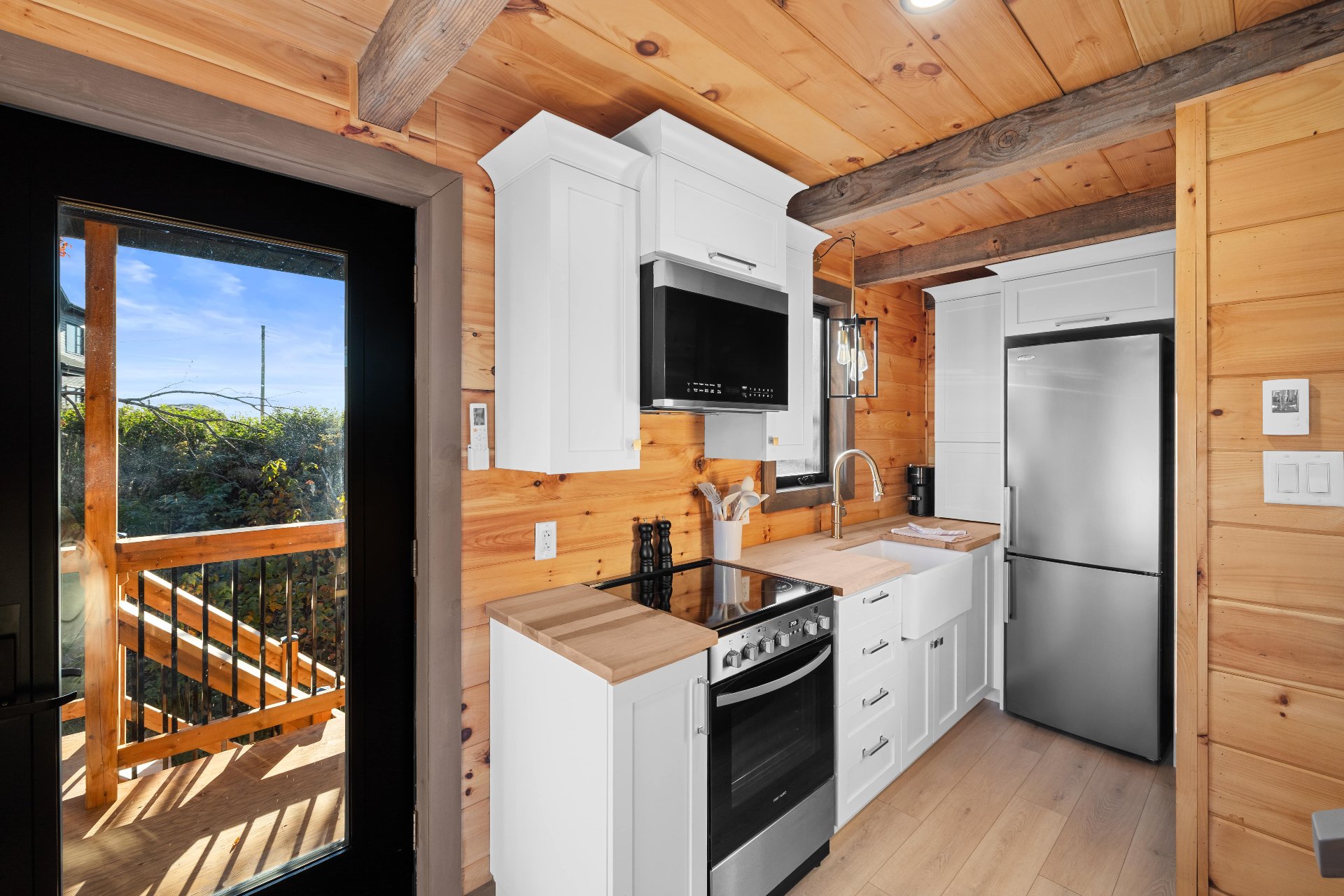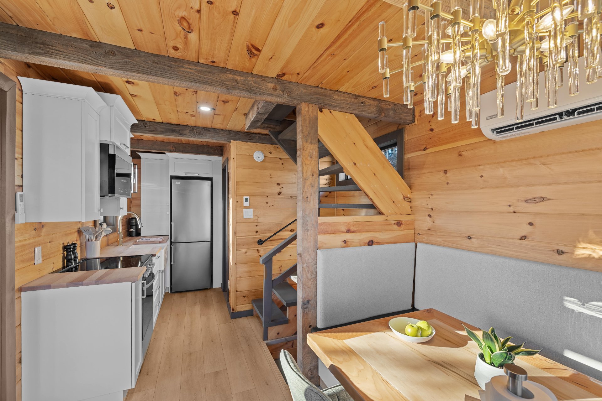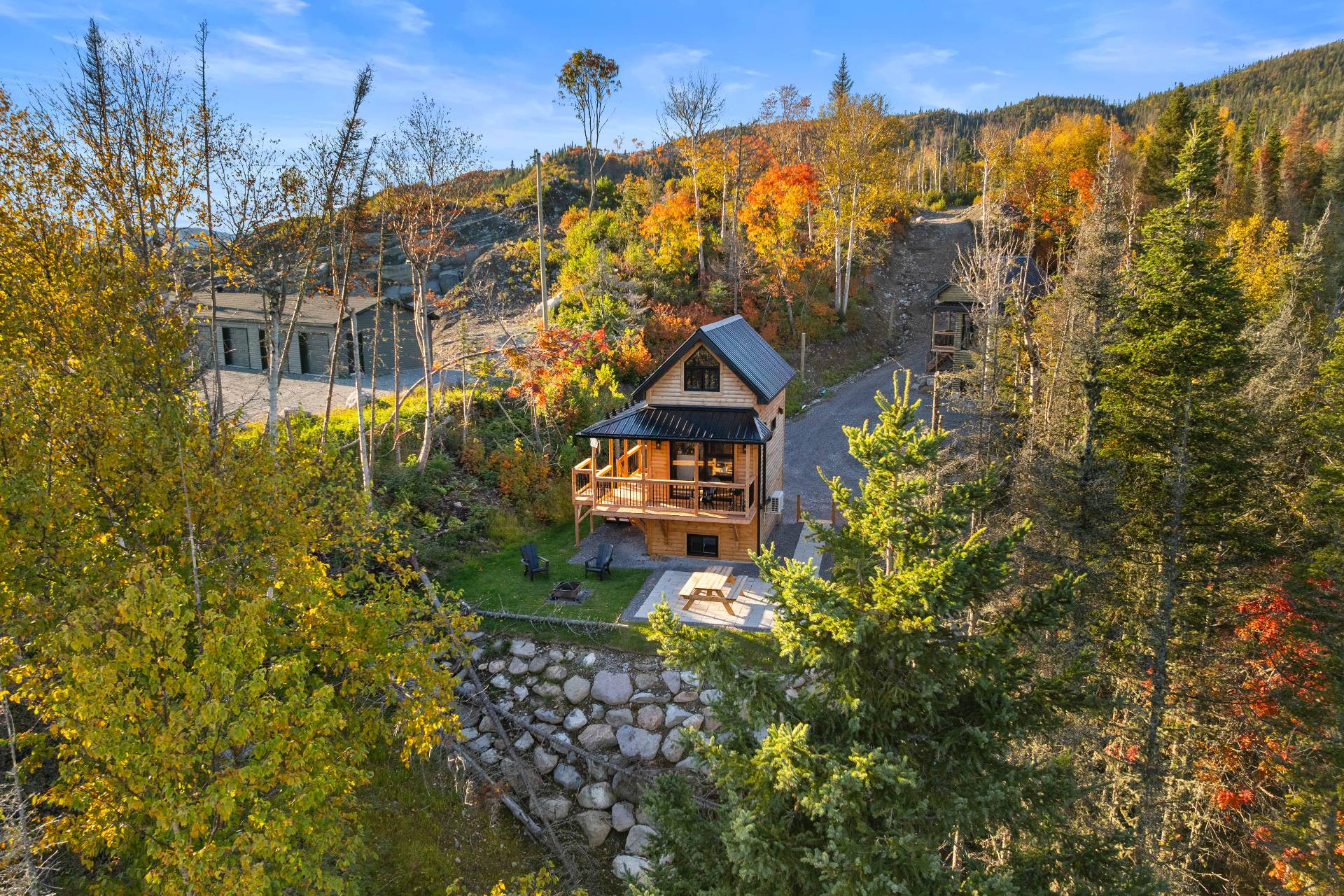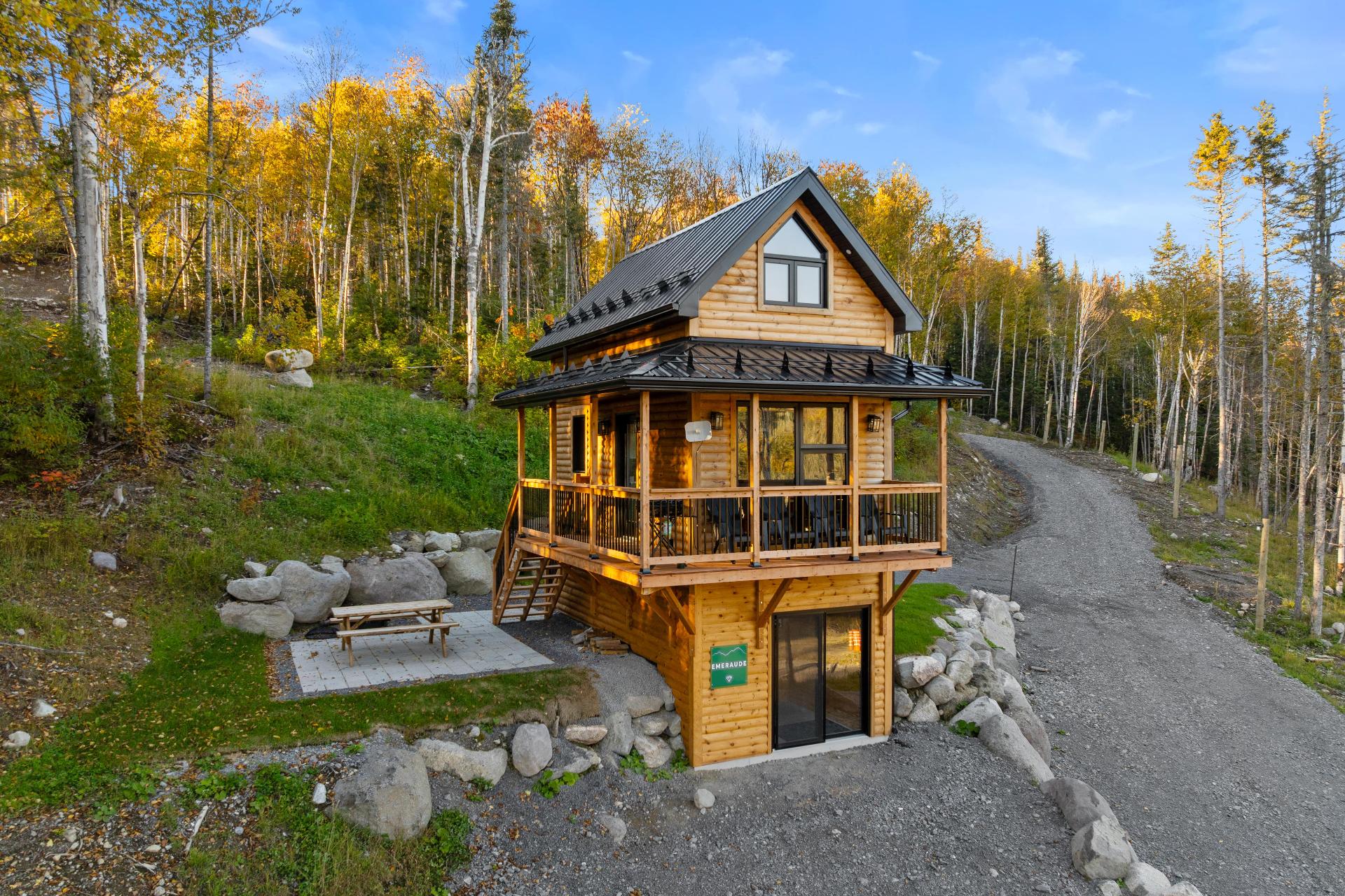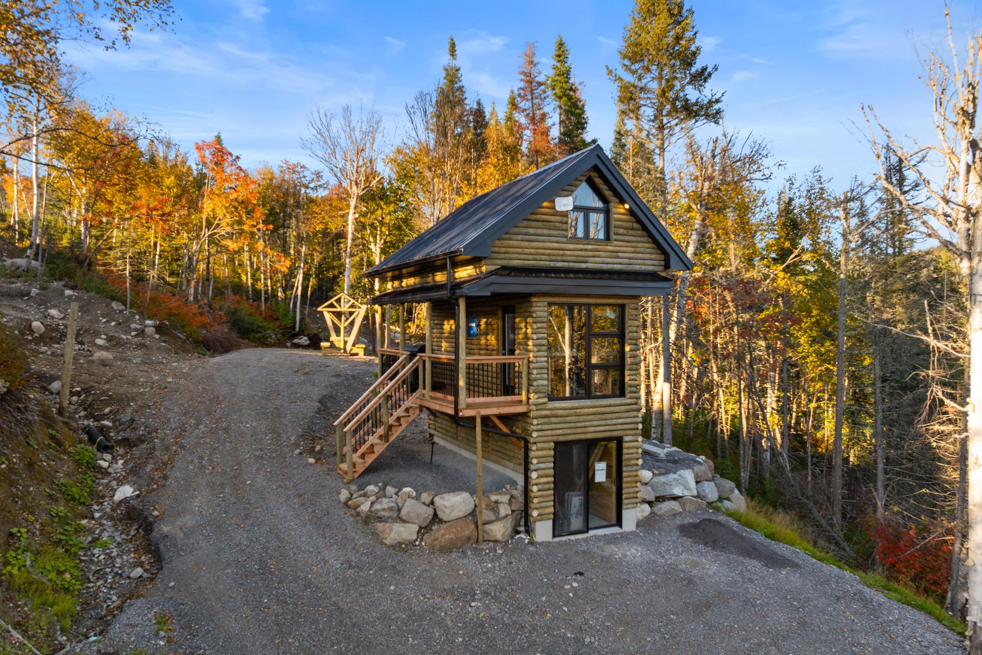 Mini-chalet sur deux étages de ± 20' x 10', avec sous-sol et petit garage intégré, dalle de béton radiant pour une superficie totale de 600 pi². Peut accueillir de 2 à 4 personnes dans un cadre idyllique et comprend tous les services : eau, électricité, chauffage et système d'égout.