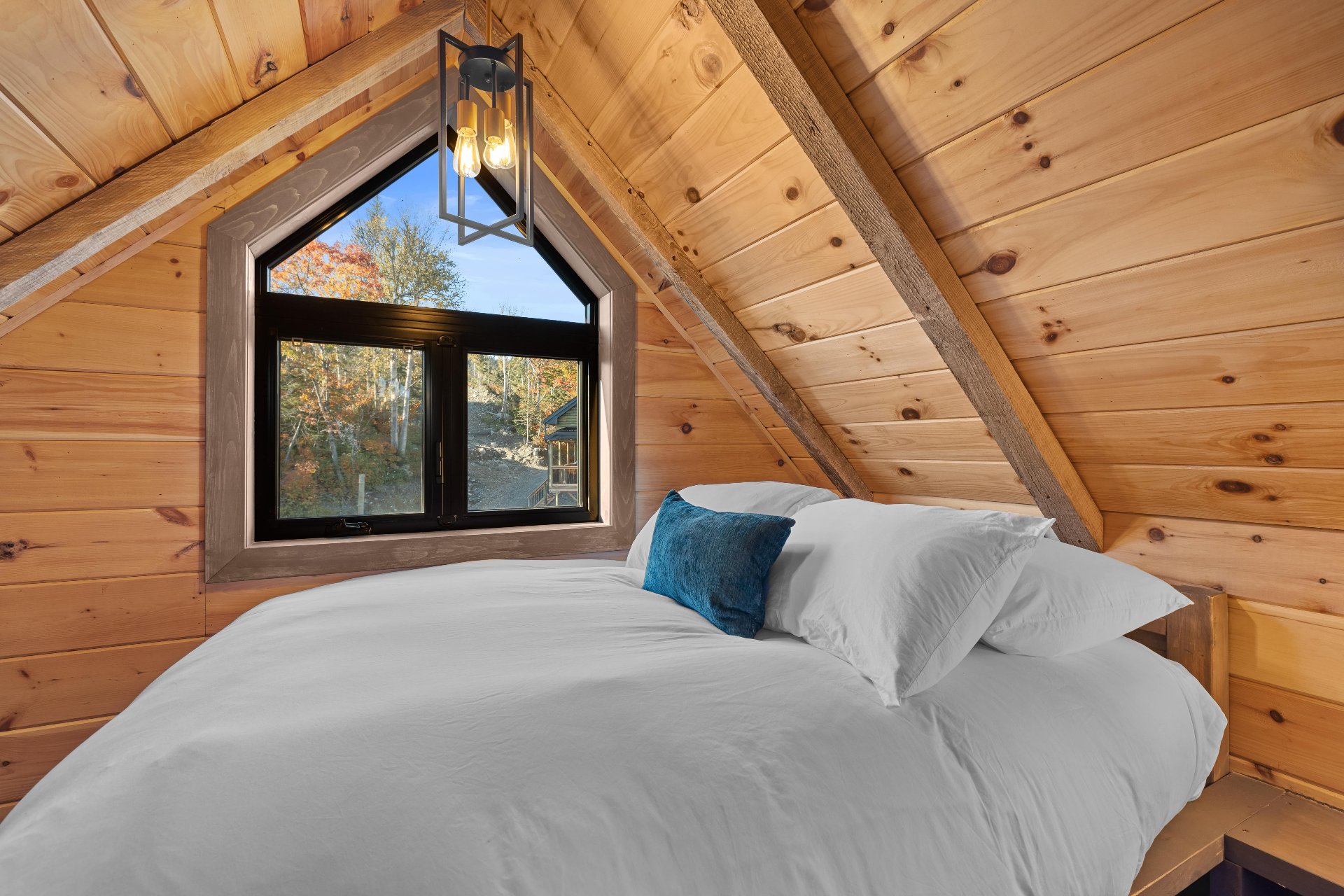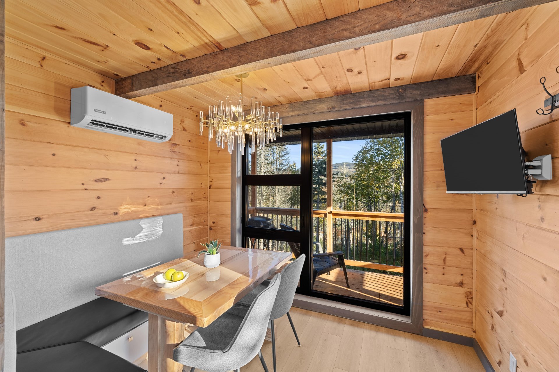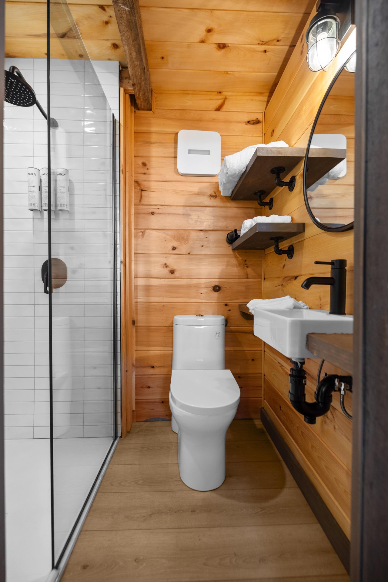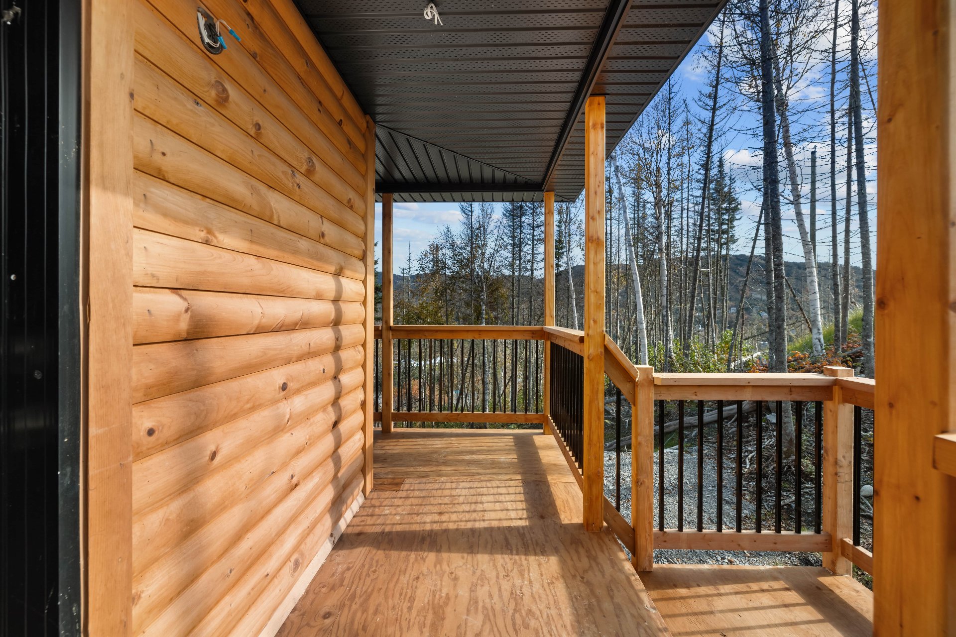 Mini-chalet sur deux étages de ± 20' x 10', avec sous-sol et petit garage intégré, dalle de béton radiant pour une superficie totale de 600 pi². Peut accueillir de 2 à 4 personnes dans un cadre idyllique et comprend tous les services : eau, électricité, chauffage et système d'égout.