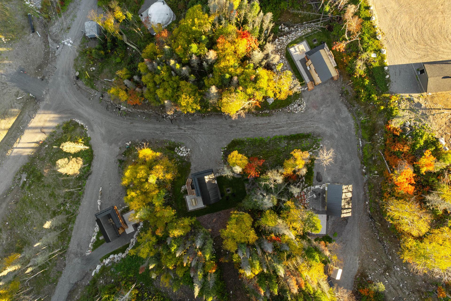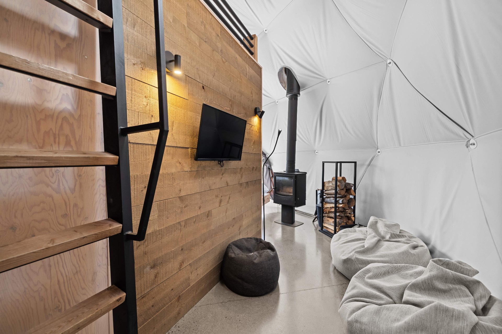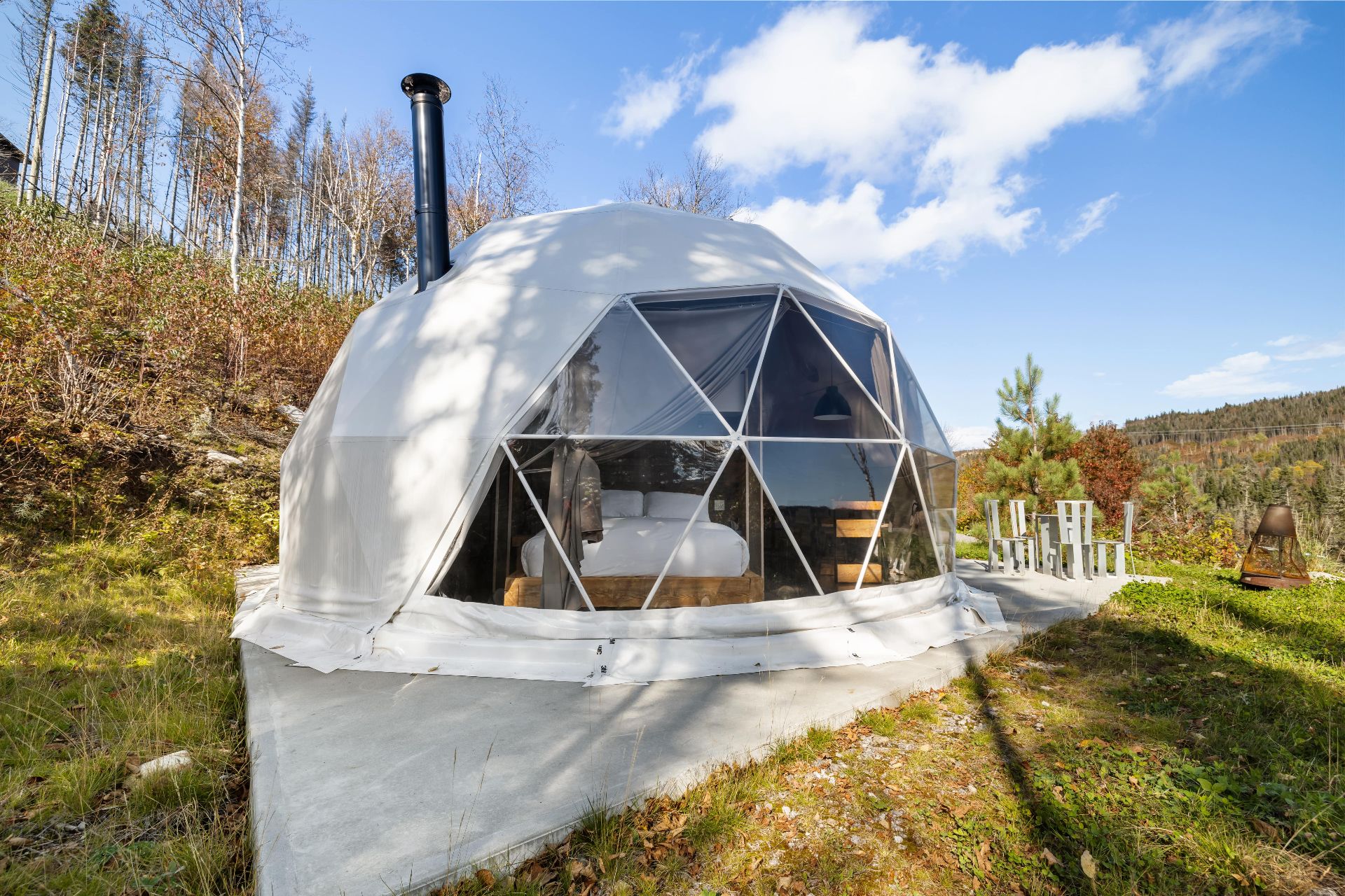 Bâtiment en forme de dôme de 20' de diamètre, chauffé au poêle à bois, dalle au sol de béton radiant et avec salle de bain complète. Peut accueillir de 2 à 4 personnes et comprend tous les services : eau, électricité, chauffage et système d'égout.