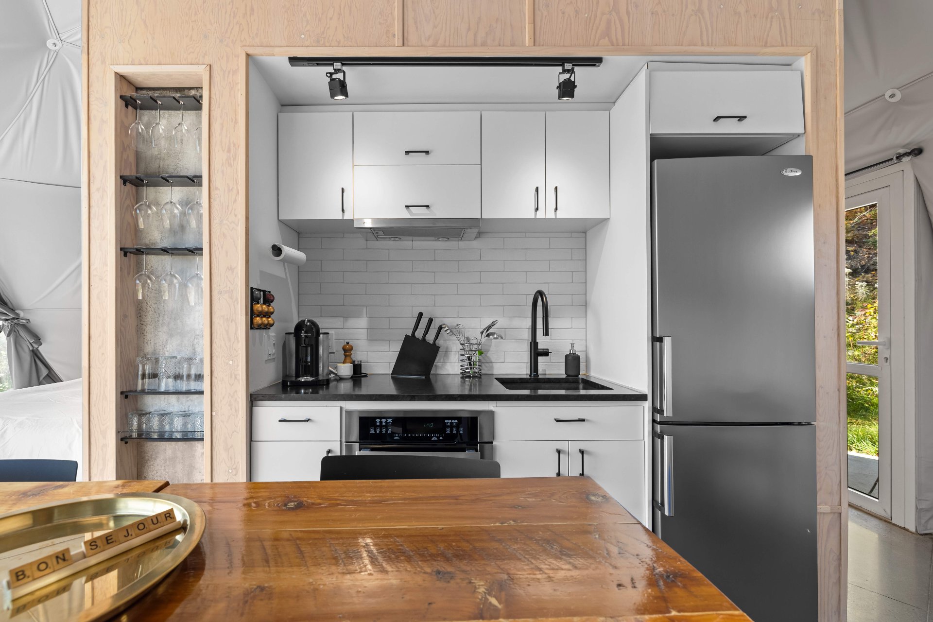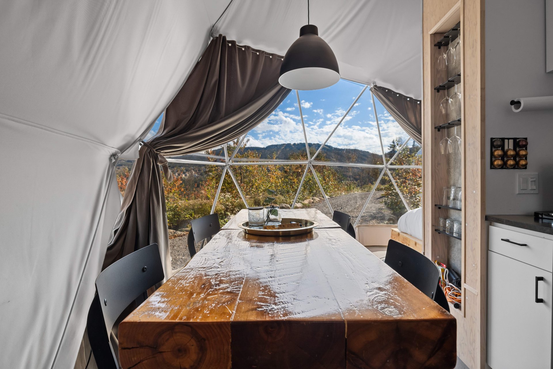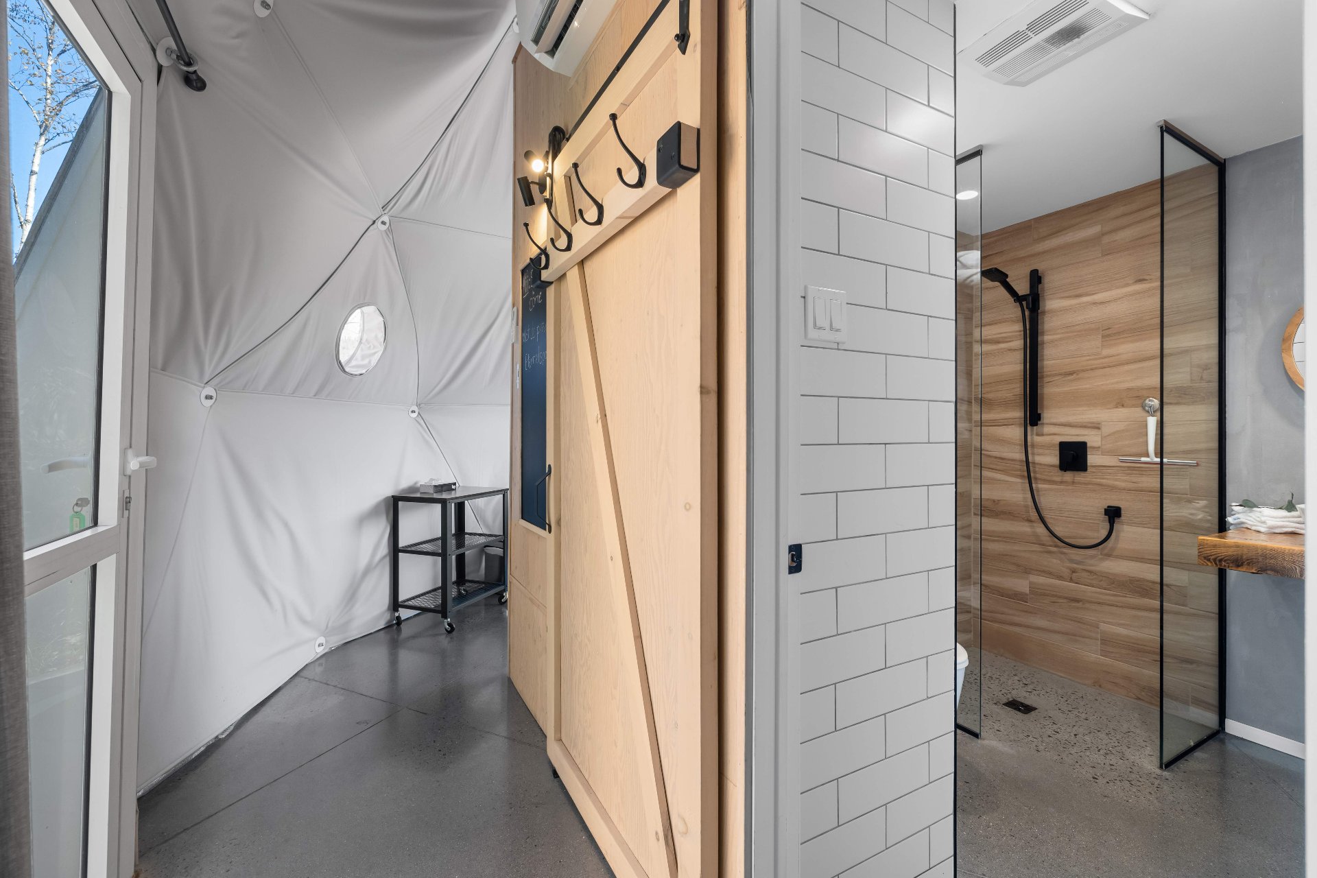 Bâtiment en forme de dôme de 20' de diamètre, chauffé au poêle à bois, dalle au sol de béton radiant et avec salle de bain complète. Peut accueillir de 2 à 4 personnes et comprend tous les services : eau, électricité, chauffage et système d'égout.
