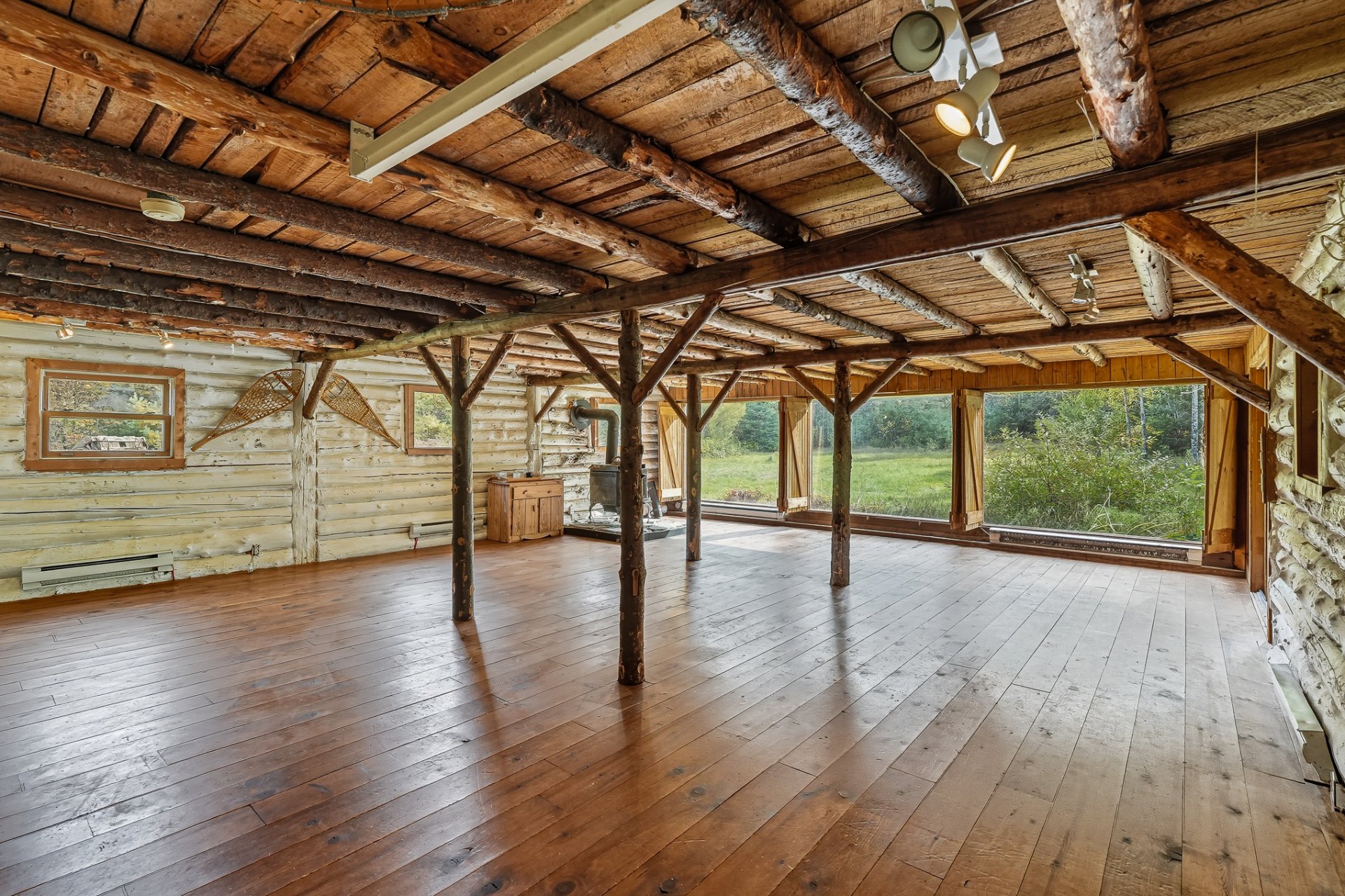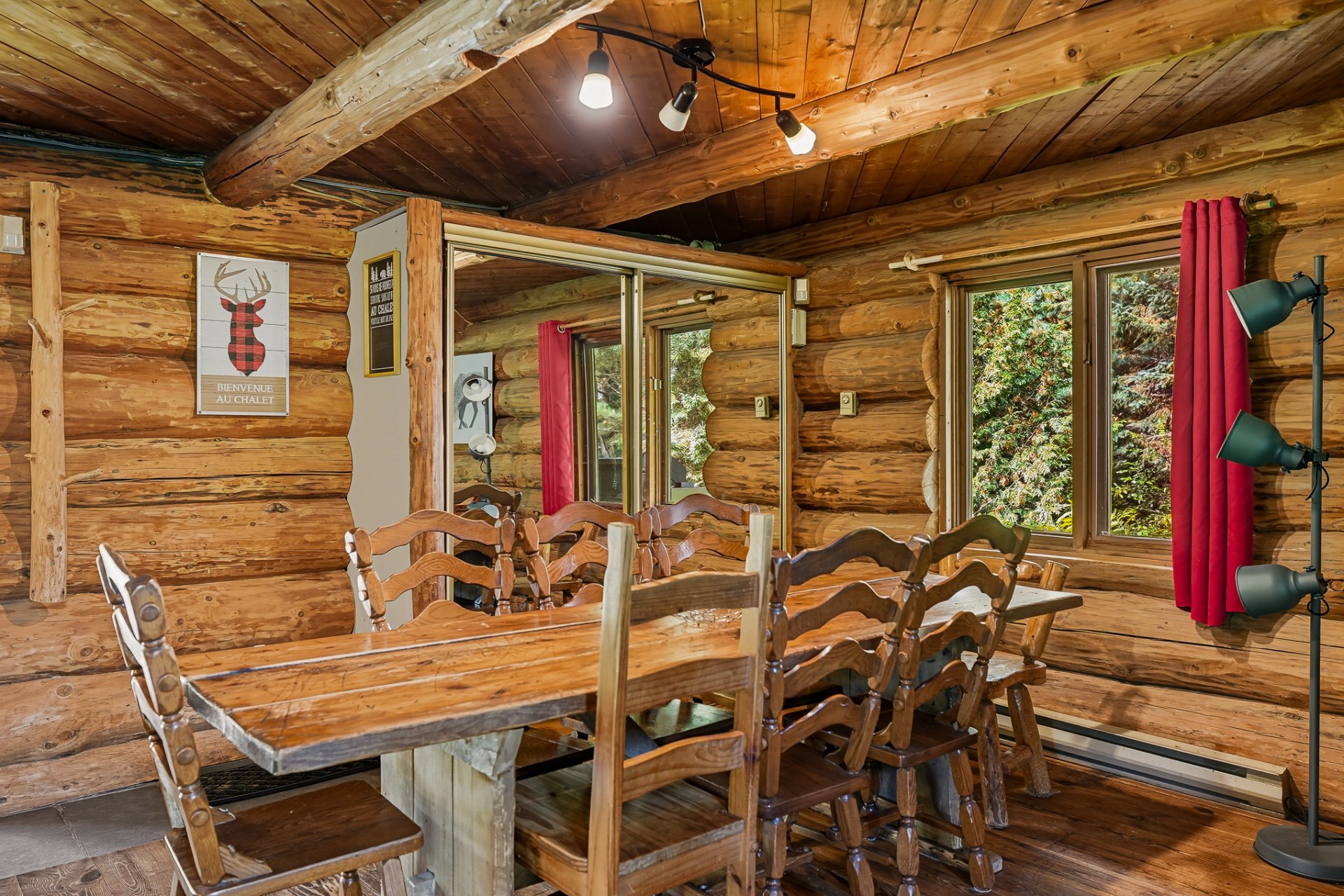 * 3015 : Chalet sur trois niveaux (rez-de-chaussée, étage et mezzanine) offrant une cuisine, salle à manger et salon à aire ouverte, 4 chambres, 2 salles de bains, 1 salle d'eau et une salle de jeux. Superficie habitable de 1 995 pi². Les billots ont été sablés et retraités en 2020, et les joints refaits à la même occasion.
