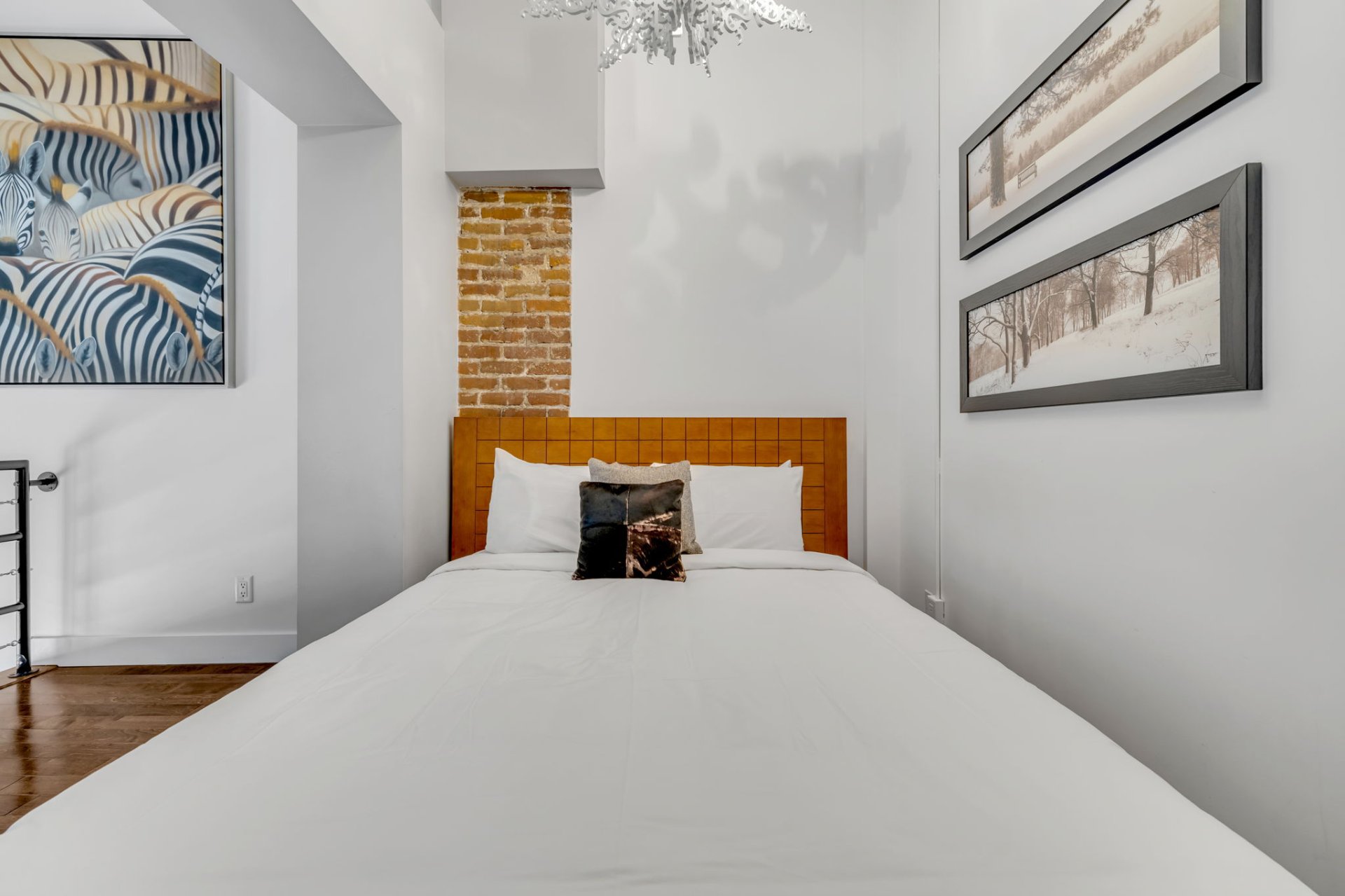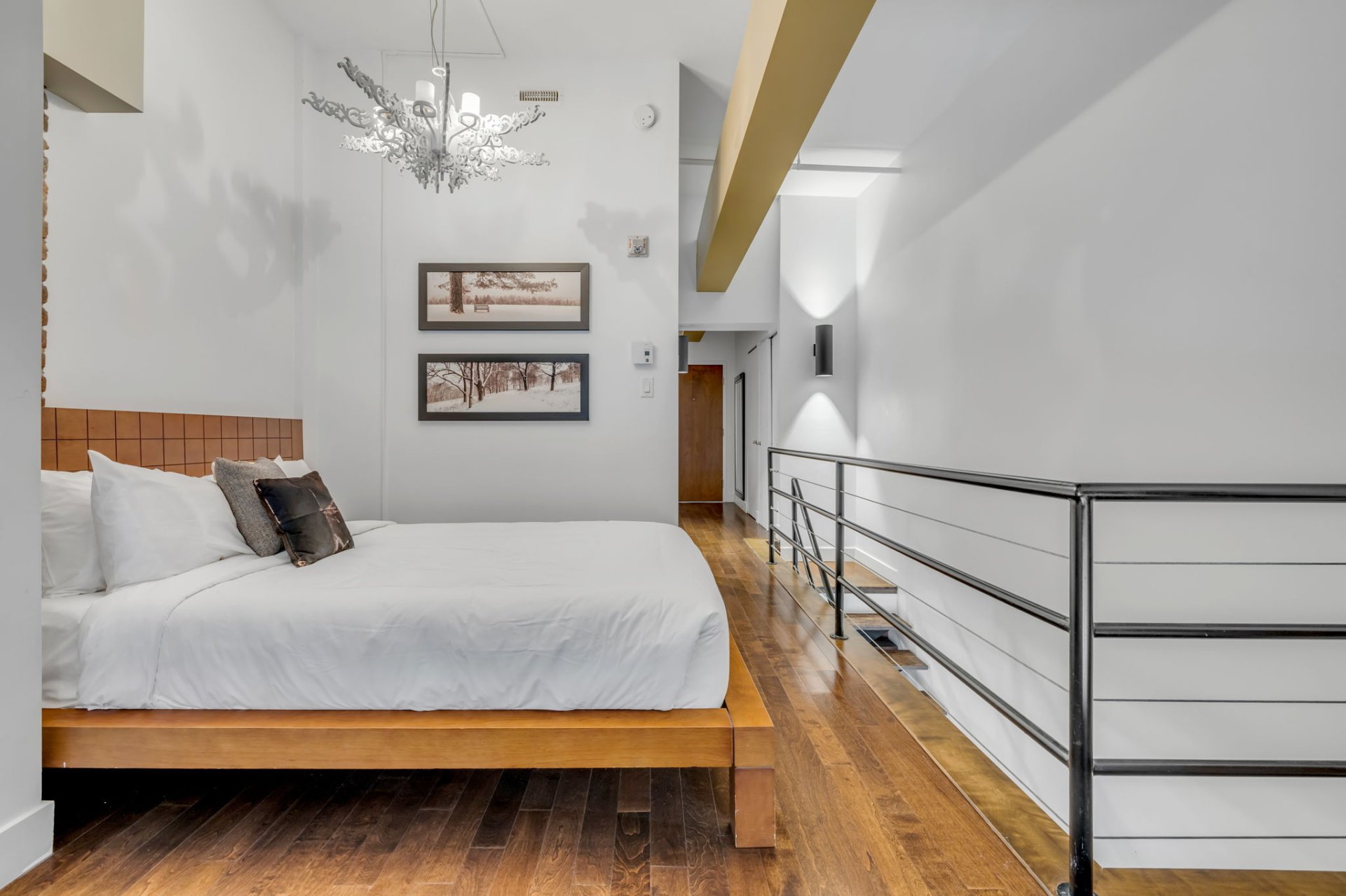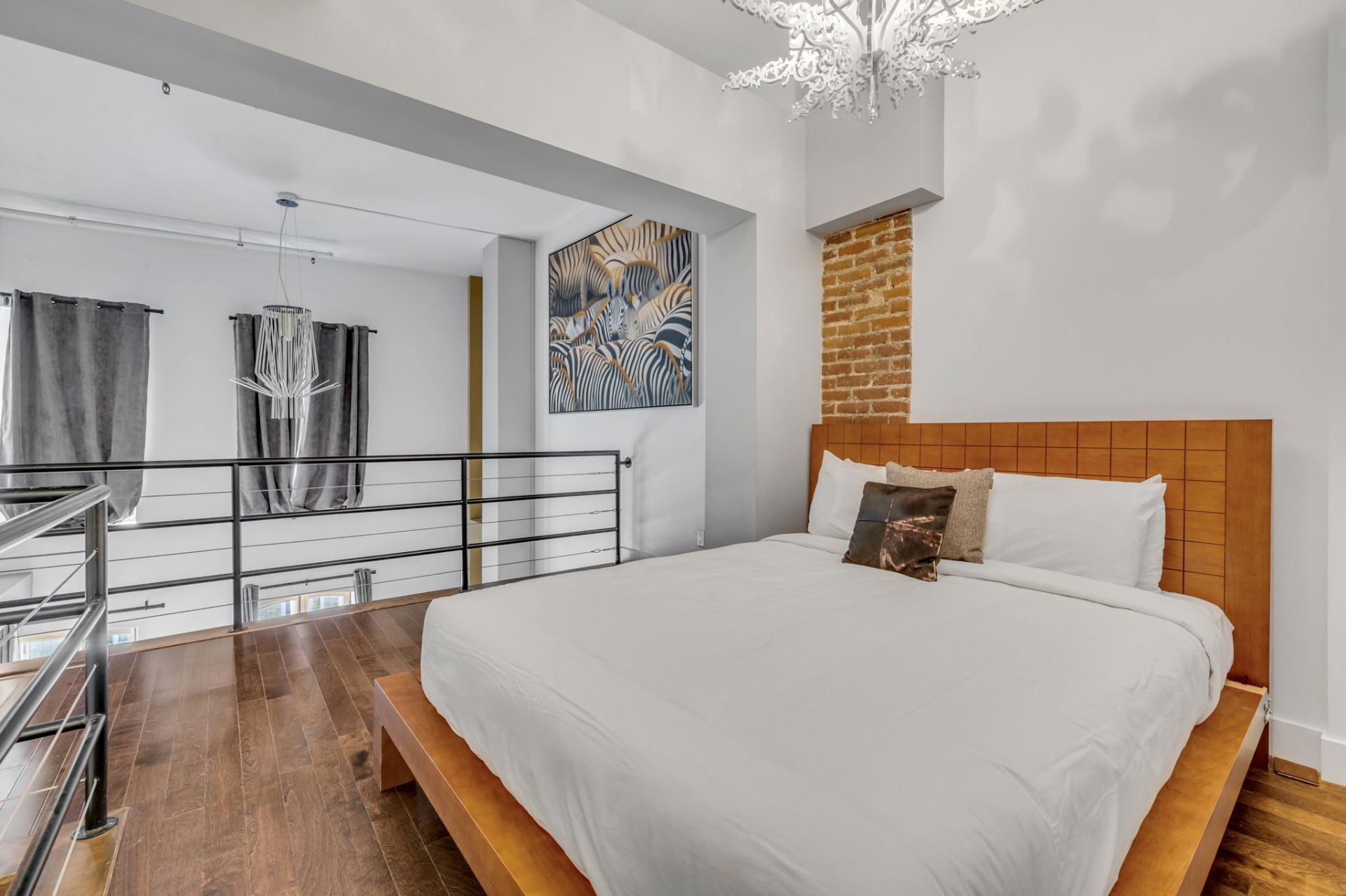 Étage supérieur : mezzanine ingénieusement aménagée en deux chambres ouvertes, séparées par une salle de bain complète, alliant confort et intimité.